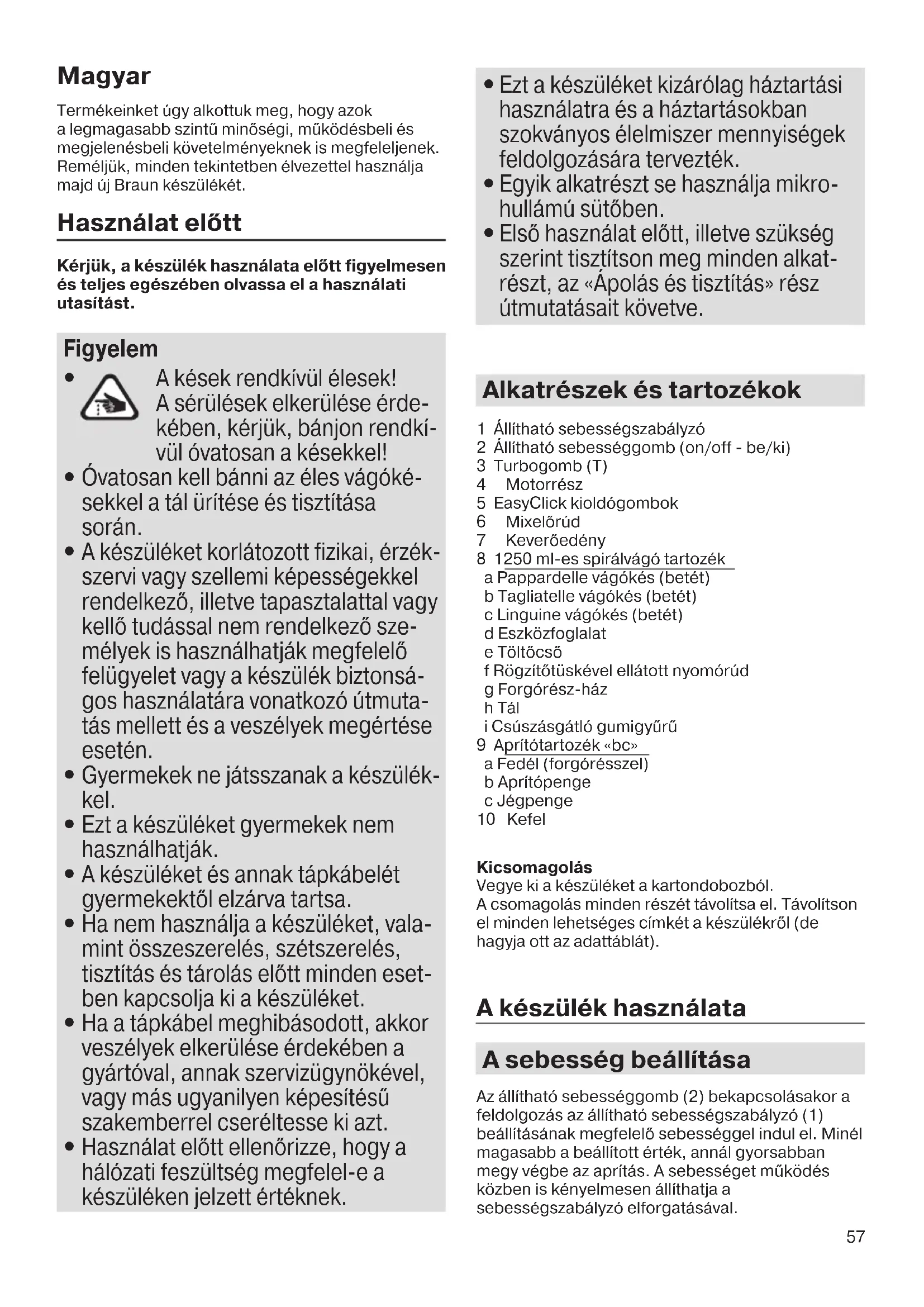 Első használat előtt, illetve szükség szerint tisztítson meg minden alkat- részt, az «Ápolás és tisztítás» rész útmutatásait követve. Alkatrészek és tartozékok 1 Állítható sebességszabályzó 2 Állítható sebességgomb (on/off - be/ki) 3 Turbogomb (T) 4 Motorrész 5 EasyClick kioldógombok 6 Mixelőrúd 7 Keverőedény 8 1250 ml-es spirálvágó tartozék a Pappardelle vágókés (betét) b Tagliatelle vágókés (betét) c Linguine vágókés (betét) d Eszközfoglalat e Töltőcső f Rögzítőtüskével ellátott nyomórúd g Forgórész-ház h Tál i Csúszásgátló gumigyűrű 9 Aprítótartozék «bc» a Fedél (forgórésszel) b Aprítópenge c Jégpenge 10 Kefel Kicsomagolás Vegye ki a készüléket a kartondobozból. A csomagolás minden részét távolítsa el. Távolítson el minden lehetséges címkét a készülékről (de hagyja ott az adattáblát). A készülék használata A sebesség beállítása Az állítható sebességgomb (2) bekapcsolásakor a feldolgozás az állítható sebességszabályzó (1) beállításának megfelelő sebességgel indul el. Minél magasabb a beállított érték, annál gyorsabban megy végbe az aprítás. A sebességet működés közben is kényelmesen állíthatja a sebességszabályzó elforgatásával. 5722113184_MQ_5060-5064_INT_S6-96.indd 57 24.05.18 14:2858 A maximális feldolgozási sebesség a turbogomb (3) megnyomásával érhető el. A turbogombot arra is használhatja, hogy a sebességszabályzó állítása nélkül, közvetlenül pörgesse fel az adott műveletet. Keverőszár (A) A botmixer tökéletesen alkalmas mártások, szószok, salátaöntetek, levesek, bébiételek, valamint italok, illetve gyümölcsös és tejes turmixok készítésére. A legjobb eredmény eléréséhez használja a legmagasabb sebességfokozatot. Összeszerelés és működtetés