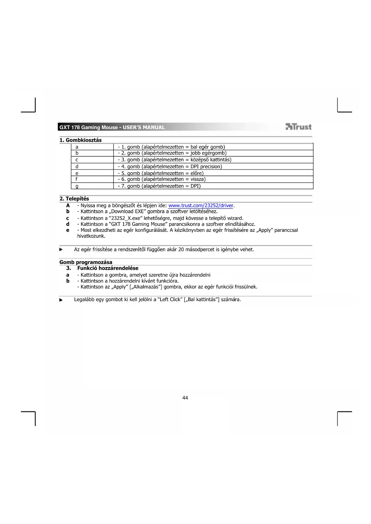 - Nyissa meg a böngészőt és lépjen ide: www.trust.com/23252/driver. - Kattintson a „Download EXE” gombra a szoftver letöltéséhez. - Kattintson a “23252_X.exe” lehetőségre, majd kövesse a telepítő wizard. - Kattintson a “GXT 178 Gaming Mouse” parancsikonra a szoftver elindításához. - Most elkezdheti az egér konfigurálását. A kézikönyvben az egér frissítésére az „Apply” paranccsal hivatkozunk. Az egér frissítése a rendszerétől függően akár 20 másodpercet is igénybe vehet. Gomb programozása