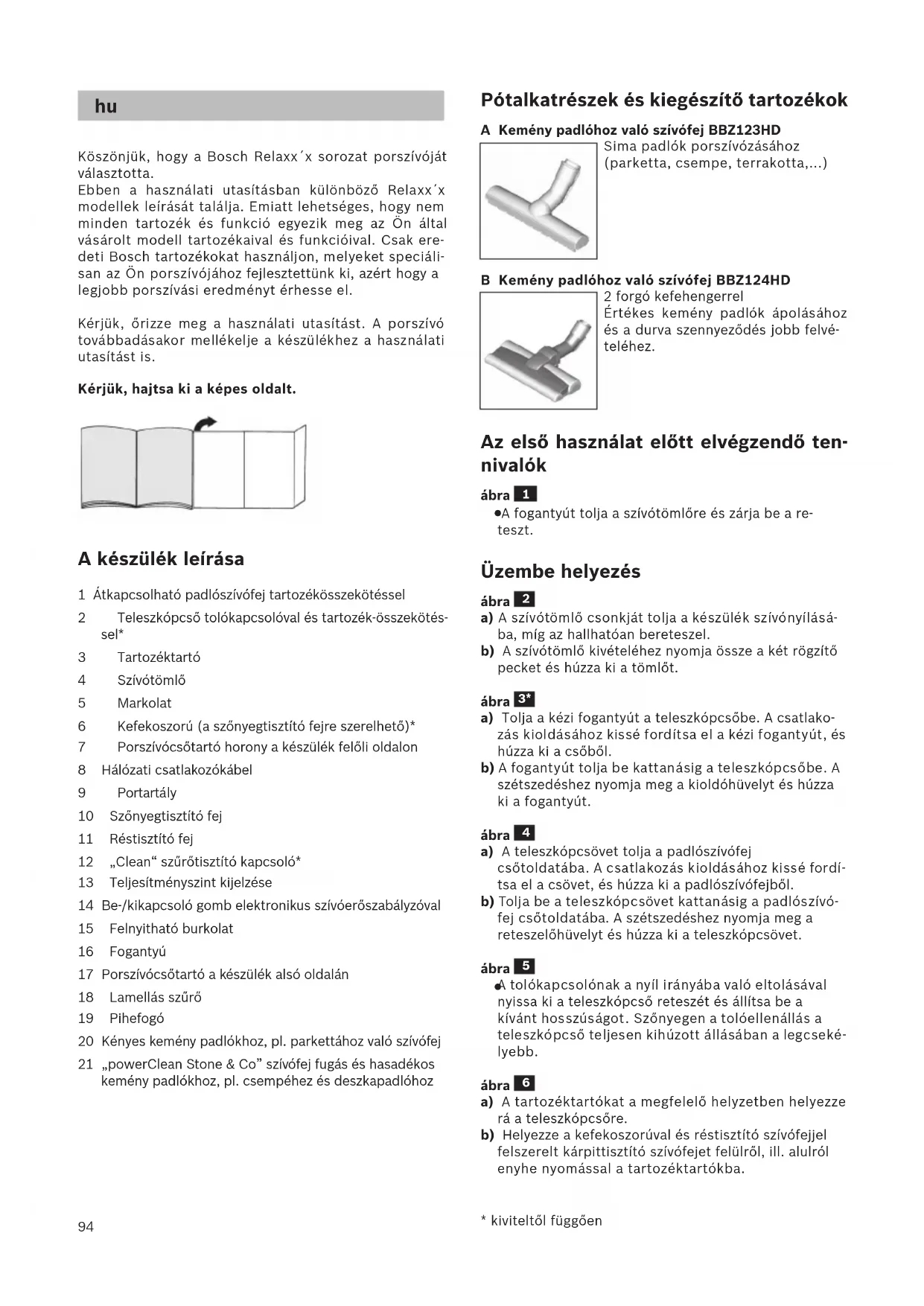 Köszönjük, hogy a Bosch Relaxx´x sorozat porszívóját választotta. Ebben a használati utasításban különböző Relaxx´x modellek leírását találja. Emiatt lehetséges, hogy nem minden tartozék és funkció egyezik meg az Ön által vásárolt modell tartozékaival és funkcióival. Csak ere- deti Bosch tartozékokat használjon, melyeket speciáli- san az Ön porszívójához fejlesztettünk ki, azért hogy a legjobb porszívási eredményt érhesse el. Kérjük, őrizze meg a használati utasítást. A porszívó továbbadásakor mellékelje a készülékhez a használati utasítást is. Kérjük, hajtsa ki a képes oldalt. A készülék leírása 1 Átkapcsolható padlószívófej tartozékösszekötéssel 2 Teleszkópcső tolókapcsolóval és tartozék-összekötés- sel* 3 Tartozéktartó 4 Szívótömlő 5 Markolat 6 Kefekoszorú (a szőnyegtisztító fejre szerelhető)* 7 Porszívócsőtartó horony a készülék felőli oldalon 8 Hálózati csatlakozókábel 9 Portartály 10 Szőnyegtisztító fej 11 Réstisztító fej 12 „Clean“ szűrőtisztító kapcsoló* 13 Teljesítményszint kijelzése 14 Be-/kikapcsoló gomb elektronikus szívóerőszabályzóval 15 Felnyitható burkolat 16 Fogantyú 17 Porszívócsőtartó a készülék alsó oldalán 18 Lamellás szűrő 19 Pihefogó 20 Kényes kemény padlókhoz, pl. parkettához való szívófej 21 „powerClean Stone & Co” szívófej fugás és hasadékos kemény padlókhoz, pl. csempéhez és deszkapadlóhoz