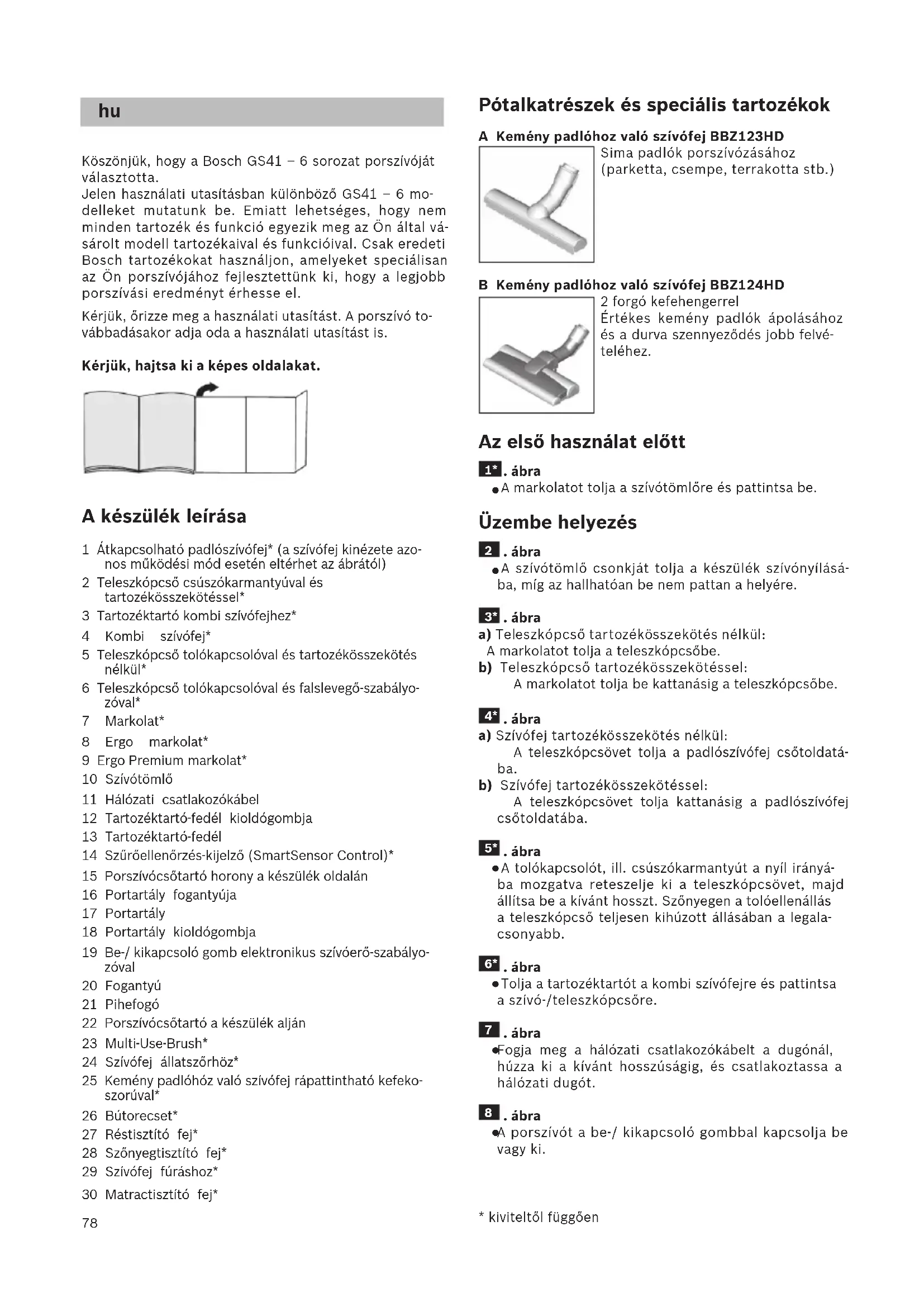Köszönjük, hogy a Bosch GS41 – 6 sorozat porszívóját választotta. Jelen használati utasításban különböző GS41 – 6 mo- delleket mutatunk be. Emiatt lehetséges, hogy nem minden tartozék és funkció egyezik meg az Ön által vá- sárolt modell tartozékaival és funkcióival. Csak eredeti Bosch tartozékokat használjon, amelyeket speciálisan az Ön porszívójához fejlesztettünk ki, hogy a legjobb porszívási eredményt érhesse el. Kérjük, őrizze meg a használati utasítást. A porszívó to- vábbadásakor adja oda a használati utasítást is. Kérjük, hajtsa ki a képes oldalakat. A készülék leírása 1 Átkapcsolható padlószívófej* (a szívófej kinézete azo- nos működési mód esetén eltérhet az ábrától) 2 Teleszkópcső csúszókarmantyúval és tartozékösszekötéssel* 3 Tartozéktartó kombi szívófejhez* 4 Kombi szívófej* 5 Teleszkópcső tolókapcsolóval és tartozékösszekötés nélkül* 6 Teleszkópcső tolókapcsolóval és falslevegő-szabályo- zóval* 7 Markolat* 8 Ergo markolat* 9 Ergo Premium markolat* 10 Szívótömlő 11 Hálózati csatlakozókábel 12 Tartozéktartó-fedél kioldógombja 13 Tartozéktartó-fedél 14 Szűrőellenőrzés-kijelző (SmartSensor Control)* 15 Porszívócsőtartó horony a készülék oldalán 16 Portartály fogantyúja 17 Portartály 18 Portartály kioldógombja 19 Be-/ kikapcsoló gomb elektronikus szívóerő-szabályo- zóval 20 Fogantyú 21 Pihefogó 22 Porszívócsőtartó a készülék alján 23 Multi-Use-Brush* 24 Szívófej állatszőrhöz* 25 Kemény padlóhóz való szívófej rápattintható kefeko- szorúval* 26 Bútorecset* 27 Réstisztító fej* 28 Szőnyegtisztító fej* 29 Szívófej fúráshoz* 30 Matractisztító fej*