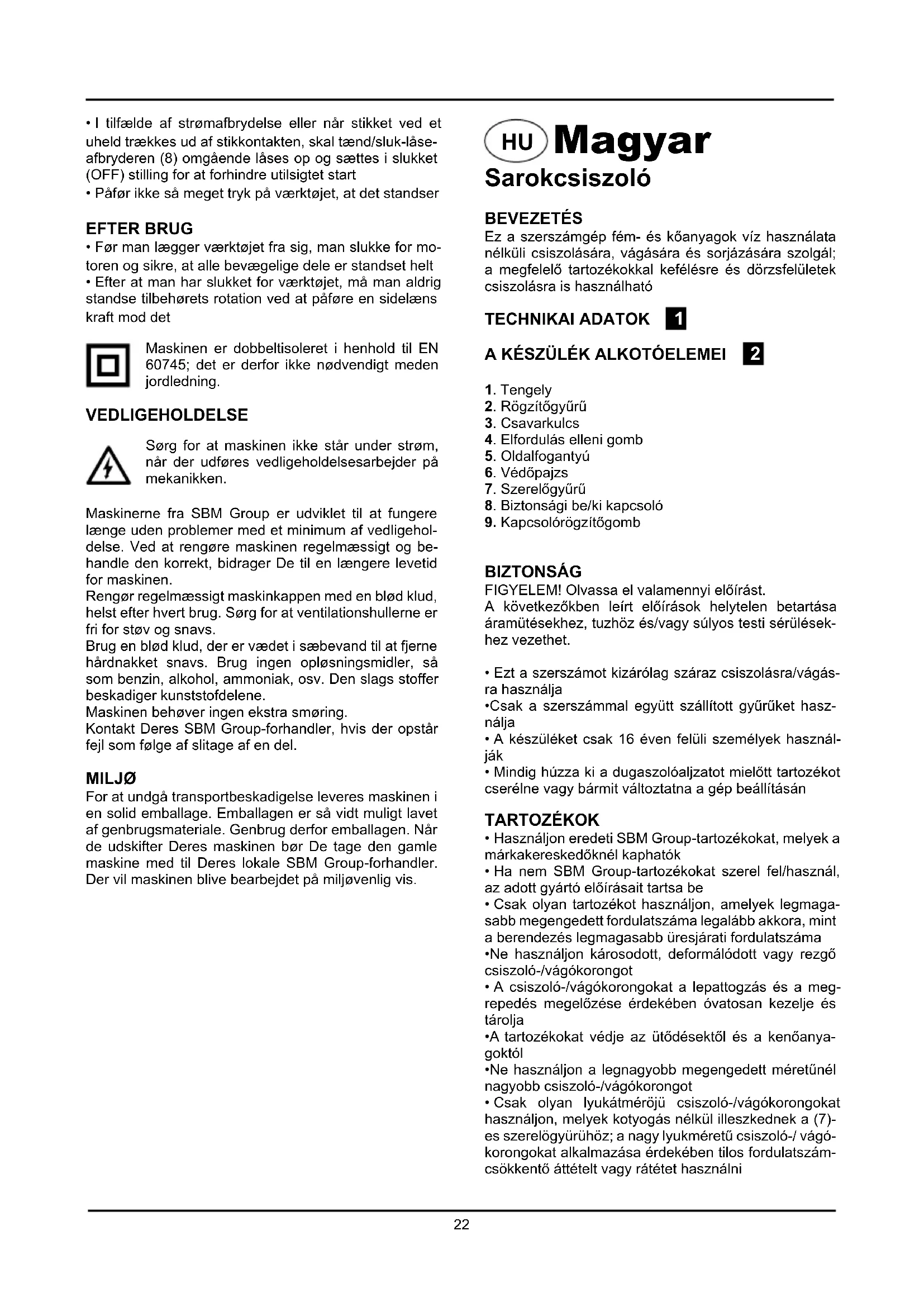 - Miután kikapcsolta a készüléket, a tartozék forgását sose annak síkjára merőleges erővel állítsa meg A készülék az EN 60745 rendelkezéssel össz- hangban duplán szigetelt, emiatt földelésre nincs szükség. KARBANTARTÁS Győződjön meg róla, hogy a készülék nincs áram, alatt amikor a motoron karbantartási munkát végez. A SBM Group készülékeket hosszú élettartamra és mi- nimális karbantartási igénnyel tervezték. A folyamatos, kielégítő működés a rendszeres ápoláson és tisztításon múlik. Rendszeresen, lehetőleg minden használat után puha ronggyal tisztítsa le a készülék házát. A szellőzőnyílá- sokat óvja portól és szennyeződéstől. Használjon szap- panos vízzel megnedvesített puha rongyot, ha a szeny- nyeződést nem lehet eltávolítani. Soha ne használjon oldószereket pl. petróleumot, alkoholt, ammóniás vizet stb. Az oldószerek károsíthatják a műanyag részeket. A készülék nem igényel kiegészítő kenést. Ha meghibásodást észlel, keresse fel helyi SBM Group viszonteladóját.