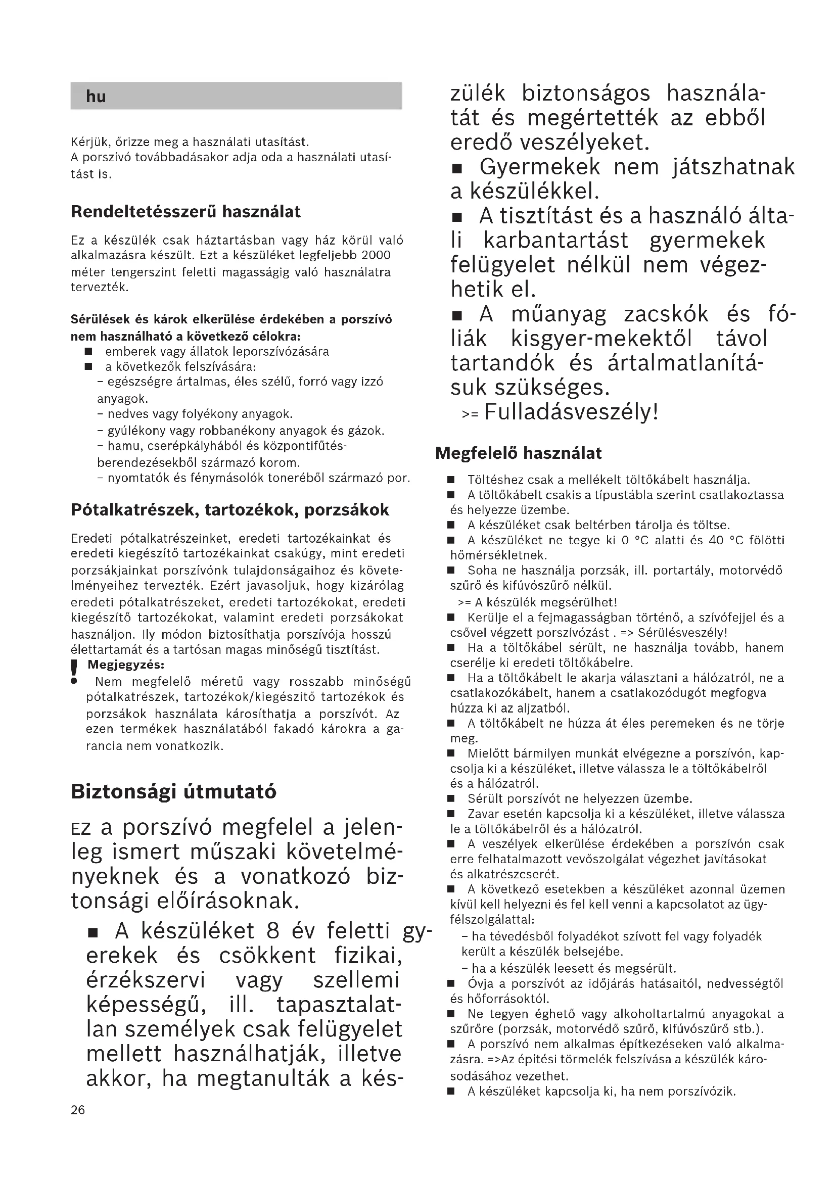 Kérjük, őrizze meg a használati utasítást.A porszívó továbbadásakor adja oda a használati utasí-tást is. Rendeltetésszerű használat Ez a készülék csak háztartásban vagy ház körül való alkalmazásra készült. Ezt a készüléket legfeljebb 2000 méter tengerszint feletti magasságig való használatra tervezték.Sérülések és károk elkerülése érdekében a porszívó nem használható a következő célokra: emberek vagy állatok leporszívózására a következők felszívására: − egészségre ártalmas, éles szélű, forró vagy izzó anyagok. − nedves vagy folyékony anyagok. − gyúlékony vagy robbanékony anyagok és gázok. − hamu, cserépkályhából és központifűtés-berendezésekből származó korom. − nyomtatók és fénymásolók toneréből származó por. Pótalkatrészek, tartozékok, porzsákok Eredeti pótalkatrészeinket, eredeti tartozékainkat és eredeti kiegészítő tartozékainkat csakúgy, mint eredeti porzsákjainkat porszívónk tulajdonságaihoz és követe-lményeihez tervezték. Ezért javasoljuk, hogy kizárólag eredeti pótalkatrészeket, eredeti tartozékokat, eredeti kiegészítő tartozékokat, valamint eredeti porzsákokat használjon. Ily módon biztosíthatja porszívója hosszú élettartamát és a tartósan magas minőségű tisztítást. Megjegyzés: Nem megfelelő méretű vagy rosszabb minőségű pótalkatrészek, tartozékok/kiegészítő tartozékok és porzsákok használata károsíthatja a porszívót. Az ezen termékek használatából fakadó károkra a ga-rancia nem vonatkozik. Biztonsági útmutató Ez a porszívó megfelel a jelen- leg ismert műszaki követelmé- nyeknek és a vonatkozó biz- tonsági előírásoknak. A készüléket 8 év feletti gy- erekek és csökkent fizikai, érzékszervi vagy szellemi képességű, ill. tapasztalat- lan személyek csak felügyelet mellett használhatják, illetve akkor, ha megtanulták a kés- zülék biztonságos használa- tát és megértették az ebből eredő veszélyeket. Gyermekek nem játszhatnak a készülékkel. A tisztítást és a használó álta- li karbantartást gyermekek felügyelet nélkül nem végez- hetik el. A műanyag zacskók és fó- liák kisgyer-mekektől távol tartandók és ártalmatlanítá- suk szükséges. >= Fulladásveszély! Megfelelő használat Töltéshez csak a mellékelt töltőkábelt használja. A töltőkábelt csakis a típustábla szerint csatlakoztassa és helyezze üzembe. A készüléket csak beltérben tárolja és töltse. A készüléket ne tegye ki 0 °C alatti és 40 °C fölötti hőmérsékletnek. Soha ne használja porzsák, ill. portartály, motorvédő szűrő és kifúvószűrő nélkül.>= A készülék megsérülhet! Kerülje el a fejmagasságban történő, a szívófejjel és a csővel végzett porszívózást . => Sérülésveszély! Ha a töltőkábel sérült, ne használja tovább, hanem cserélje ki eredeti töltőkábelre. Ha a töltőkábelt le akarja választani a hálózatról, ne a csatlakozókábelt, hanem a csatlakozódugót megfogva húzza ki az aljzatból. A töltőkábelt ne húzza át éles peremeken és ne törje meg. Mielőtt bármilyen munkát elvégezne a porszívón, kap-csolja ki a készüléket, illetve válassza le a töltőkábelről és a hálózatról. Sérült porszívót ne helyezzen üzembe. Zavar esetén kapcsolja ki a készüléket, illetve válassza le a töltőkábelről és a hálózatról. A veszélyek elkerülése érdekében a porszívón csak erre felhatalmazott vevőszolgálat végezhet javításokat és alkatrészcserét. A következő esetekben a készüléket azonnal üzemen kívül kell helyezni és fel kell venni a kapcsolatot az ügy-félszolgálattal: − ha tévedésből folyadékot szívott fel vagy folyadék került a készülék belsejébe. − ha a készülék leesett és megsérült. Óvja a porszívót az időjárás hatásaitól, nedvességtől és hőforrásoktól. Ne tegyen éghető vagy alkoholtartalmú anyagokat a szűrőre (porzsák, motorvédő szűrő, kifúvószűrő stb.). A porszívó nem alkalmas építkezéseken való alkalma-zásra. =>Az építési törmelék felszívása a készülék káro-sodásához vezethet. A készüléket kapcsolja ki, ha nem porszívózik.27 A csomagolás védi a porszívót a szállítás során keletkező sérülésektől. Ezért azt tanácsoljuk, hogy szállítás céljára őrizze meg a csomagolást. Akkumulátorok Készüléke lítiumion-akkumulátorokkal rendelkezik, melyek biztonsági okokból csak szakemberek számára hozzáférhetők. Az akkumulátorok cseréjéhez forduljon az Önhöz legközelebbi vevőszolgálathoz vagy felhatalmazott szakkereskedőhöz. Szállítási tudnivalók A készülékben található Li-ion-akkukra a veszélyes anya- gokra vonatkozó rendelkezések követelményei vonat- koznak. Az akkukat a felhasználó további követelmények teljesítése nélkül szállíthatja az utcán. Harmadik fél általi szállítás (pl. légi szállítás vagy szállítmányozás) esetén figyelembe kell venni a csomagolásra és címkézésre vonatkozó különleges előírásokat. Ebben az esetben a csomag előkészítésénél be kell vonni egy veszélyesáru- szakértőt. Ártalmatlanítási tudnivalók Lehetővé kell tenni a porszívó, az akkumulátorok, a tartozékok és a csomagolás környezetbarát újrahasz- nosítását. Ne dobja a porszívót és az akkukat/elemeket a háztartá- si szemétbe! Csomagolás A csomagolás védi a porszívót a szállítás során keletkező sérülésektől. A csomagolás környezet- barát anyagokból készült, és ezért újrafeldolgozásra alkalmas. A továbbiakban már nem szükséges cso- magolóanyagot helyezze el a szelektív gyűjtőhelyek megfelelő tárolóiban. Régi készülék A készülék újratölthető lítiumion-akkumulátorokat tartalmaz. Ezért a készüléket csak erre felhatalma- zott vevőszolgálaton vagy