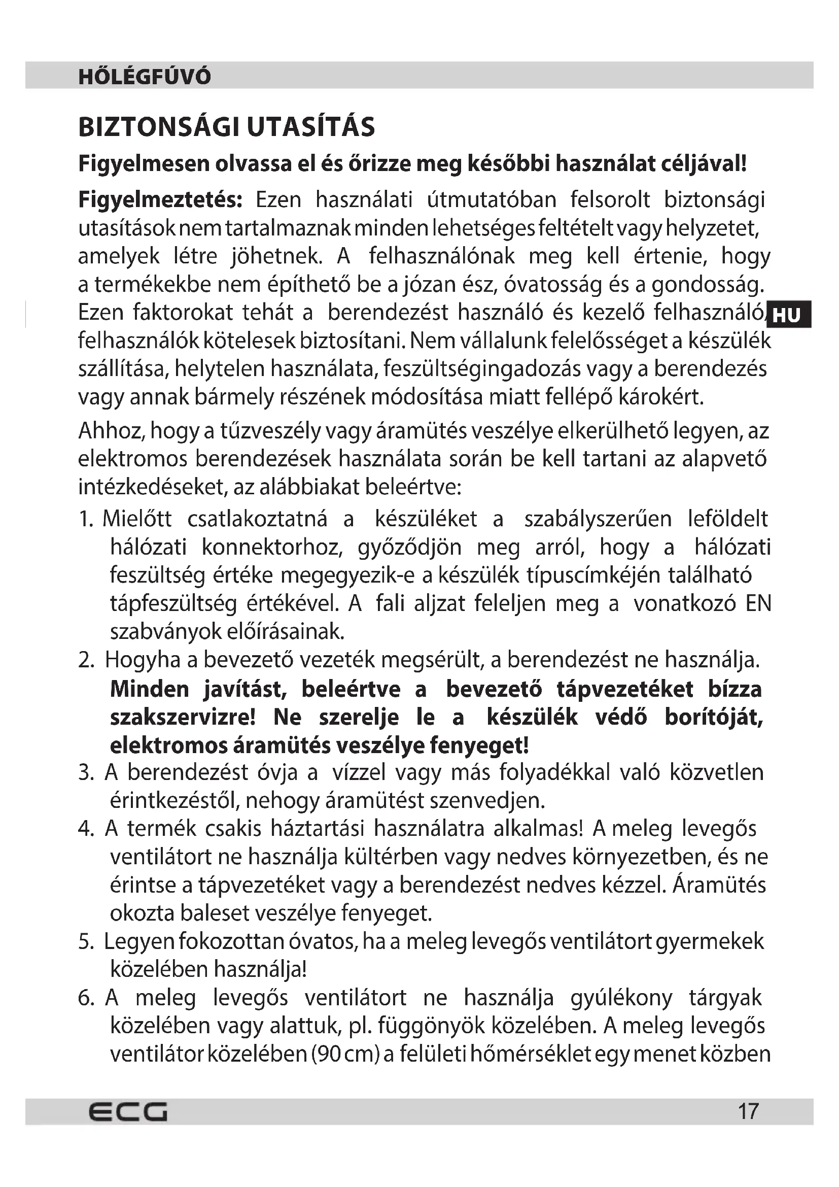 - A meleg levegos ventilatortCsak ezen kezikonyv utasitasaival osszhangban hasznalja. A gyarto nem feel a berendezes nem megfelelo hasznalata miatt fellepo krokert.
