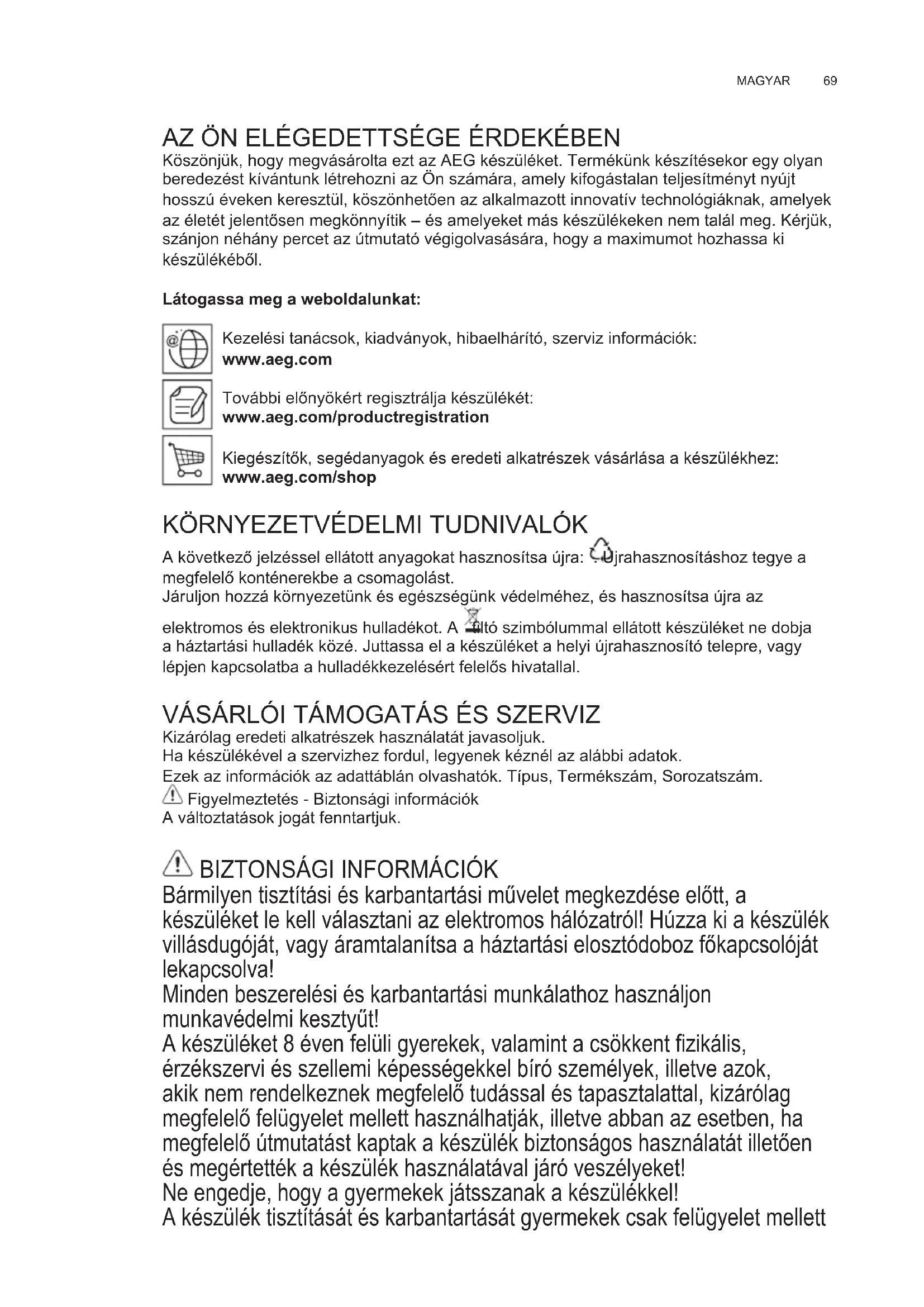 A következő jelzéssel ellátott anyagokat hasznosítsa újra: . Újrahasznosításhoz tegye a megfelelő konténerekbe a csomagolást. Járuljon hozzá környezetünk és egészségünk védelméhez, és hasznosítsa újra az elektromos és elektronikus hulladékot. A tiltó szimbólummal ellátott készüléket ne dobja a háztartási hulladék közé. Juttassa el a készüléket a helyi újrahasznosító telepre, vagy lépjen kapcsolatba a hulladékkezelésért felelős hivatallal. VÁSÁRLÓI TÁMOGATÁS ÉS SZERVIZ Kizárólag eredeti alkatrészek használatát javasoljuk. Ha készülékével a szervizhez fordul, legyenek kéznél az alábbi adatok. Ezek az információk az adattáblán olvashatók. Típus, Termékszám, Sorozatszám. Figyelmeztetés - Biztonsági információk A változtatások jogát fenntartjuk.
