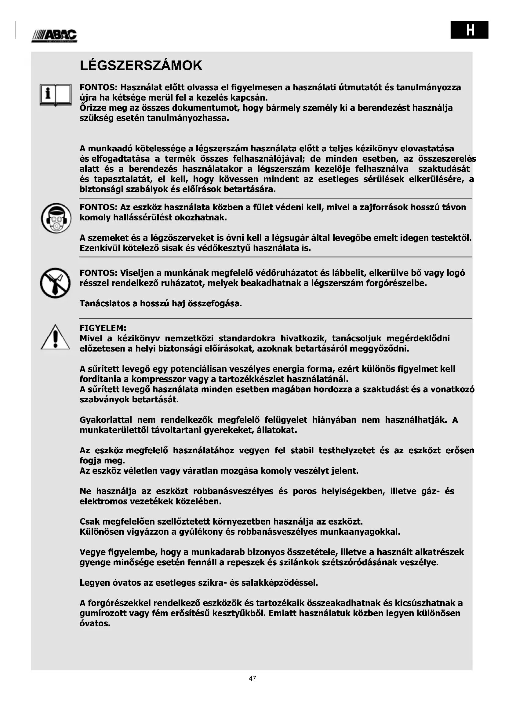FONTOS: Használat előtt olvassa el gyelmesen a használati útmutatót és tanulmányozza újra ha kétsége merül fel a kezelés kapcsán. Őrizze meg az összes dokumentumot, hogy bármely személy ki a berendezést használja szükség esetén tanulmányozhassa. A munkaadó kötelessége a légszerszám használata előtt a teljes kézikönyv elovastatása és elfogadtatása a termék összes felhasználójával; de minden esetben, az összeszerelés alatt és a berendezés használatakor a légszerszám kezelője felhasználva szaktudását és tapasztalatát, el kell, hogy kövessen mindent az esetleges sérülések elkerülésére, a biztonsági szabályok és előírások betartására. FONTOS: Az eszköz használata közben a fület védeni kell, mivel a zajforrások hosszú távon komoly hallássérülést okozhatnak. A szemeket és a légzőszerveket is óvni kell a légsugár által levegőbe emelt idegen testektől. Ezenkívül kötelező sisak és védőkesztyű használata is. FONTOS: Viseljen a munkának megfelelő védőruházatot és lábbelit, elkerülve bő vagy logó résszel rendelkező ruházatot, melyek beakadhatnak a légszerszám forgórészeibe. Tanácslatos a hosszú haj összefogása. FIGYELEM: Mivel a kézikönyv nemzetközi standardokra hivatkozik, tanácsoljuk megérdeklődni előzetesen a helyi biztonsági előírásokat, azoknak betartásáról meggyőződni. A sűrített levegő egy potenciálisan veszélyes energia forma, ezért különös gyelmet kell fordítania a kompresszor vagy a tartozékkészlet használatánál. A sűrített levegő használata minden esetben magában hordozza a szaktudást és a vonatkozó szabványok betartását. Gyakorlattal nem rendelkezők megfelelő felügyelet hiányában nem használhatják. A munkaterülettől távoltartani gyerekeket, állatokat. Az eszköz megfelelő használatához vegyen fel stabil testhelyzetet és az eszközt erősen fogja meg. Az eszköz véletlen vagy váratlan mozgása komoly veszélyt jelent. Ne használja az eszközt robbanásveszélyes és poros helyiségekben, illetve gáz- és elektromos vezetékek közelében. Csak megfelelően szellőztetett környezetben használja az eszközt. Különösen vigyázzon a gyúlékony és robbanásveszélyes munkaanyagokkal. Vegye gyelembe, hogy a munkadarab bizonyos összetétele, illetve a használt alkatrészek gyenge minősége esetén fennáll a repeszek és szilánkok szétszóródásának veszélye. Legyen óvatos az esetleges szikra- és salakképződéssel. A forgórészekkel rendelkező eszközök és tartozékaik összeakadhatnak és kicsúszhatnak a gumírozott vagy fém erősítésű kesztyűkből. Emiatt használatuk közben legyen különösen óvatos.48