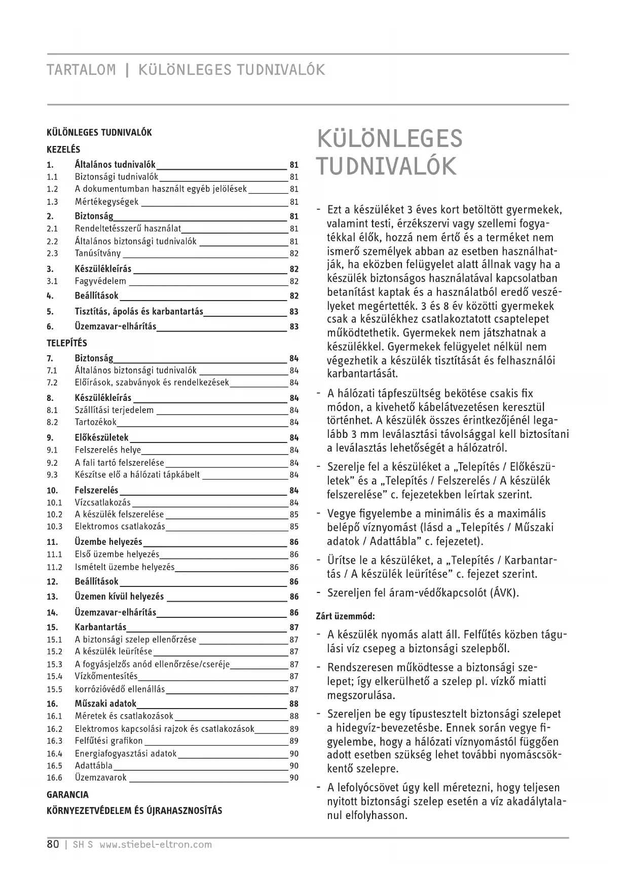 TUDNIVALÓK - Ezt a készüléket 3éves kort betöltött gyermekek, valamint testi, érzékszervi vagy szellemi fogya- tékkal élők, hozzá nem értő és a terméket nem ismerő személyek abban az esetben használhat- ják, ha eközben felügyelet alatt állnak vagy ha a készülék biztonságos használatával kapcsolatban betanítást kaptak és a használatból eredő veszé- lyeket megértették. 3 és 8év közötti gyermekek csak a készülékhez csatlakoztatott csaptelepet működtethetik. Gyermekek nem játszhatnak a készülékkel. Gyermekek felügyelet nélkül nem végezhetik a készülék tisztítását és felhasználói karbantartását. - A hálózati tápfeszültség bekötése csakis fix módon, a kivehető kábelátvezetésen keresztül történhet. A készülék összes érintkezőjénél lega- lább 3mm leválasztási távolsággal kell biztosítani a leválasztás lehetőségét a hálózatról. - Szerelje fel a készüléket a „Telepítés/ Előkészü- letek” és a „Telepítés/ Felszerelés/ A készülék felszerelése” c. fejezetekben leírtak szerint. - Vegye figyelembe a minimális és a maximális belépő víznyomást (lásd a „Telepítés/ Műszaki adatok/ Adattábla” c. fejezetet). - Ürítse le a készüléket, a „Telepítés/ Karbantar- tás/ A készülék leürítése” c. fejezet szerint. - Szereljen fel áram-védőkapcsolót (ÁVK). Zárt üzemmód: - A készülék nyomás alatt áll. Felfűtés közben tágu- lási víz csepeg a biztonsági szelepből. - Rendszeresen működtesse a biztonsági sze- lepet; így elkerülhető a szelep pl. vízkő miatti megszorulása. - Szereljen be egy típustesztelt biztonsági szelepet a hidegvíz-bevezetésbe. Ennek során vegye fi- gyelembe, hogy a hálózati víznyomástól függően adott esetben szükség lehet további nyomáscsök- kentő szelepre. - A lefolyócsövet úgy kell méretezni, hogy teljesen nyitott biztonsági szelep esetén a víz akadálytala- nul elfolyhasson.MAGYARwww.stiebel-eltron.com SH S | 81