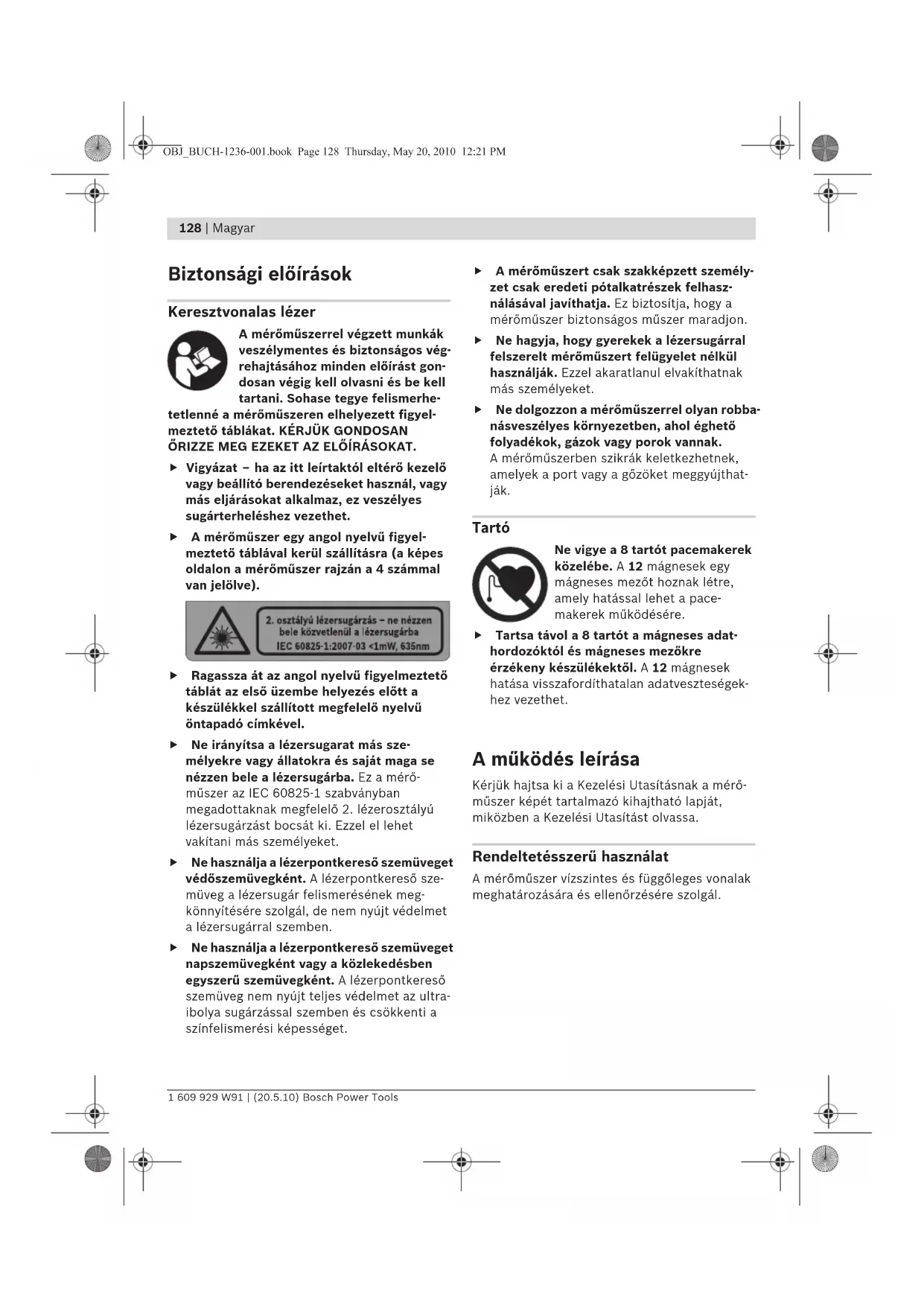 Biztonsági előírások Keresztvonalas lézer A mérőműszerrel végzett munkák veszélymentes és biztonságos vég- rehajtásához minden előírást gon- dosan végig kell olvasni és be kell tartani. Sohase tegye felismerhe- tetlenné a mérőműszeren elhelyezett figyel- meztető táblákat. KÉRJÜK GONDOSAN ŐRIZZE MEG EZEKET AZ ELŐÍRÁSOKAT. f Vigyázat – ha az itt leírtaktól eltérő kezelő vagy beállító berendezéseket használ, vagy más eljárásokat alkalmaz, ez veszélyes sugárterheléshez vezethet. f A mérőműszer egy angol nyelvű figyel- meztető táblával kerül szállításra (a képes oldalon a mérőműszer rajzán a 4 számmal van jelölve). f Ragassza át az angol nyelvű figyelmeztető táblát az első üzembe helyezés előtt a készülékkel szállított megfelelő nyelvű öntapadó címkével. f Ne irányítsa a lézersugarat más sze- mélyekre vagy állatokra és saját maga se nézzen bele a lézersugárba. Ez a mérő- műszer az IEC 60825-1 szabványban megadottaknak megfelelő 2. lézerosztályú lézersugárzást bocsát ki. Ezzel el lehet vakítani más személyeket. f Ne használja a lézerpontkereső szemüveget védőszemüvegként. A lézerpontkereső sze- müveg a lézersugár felismerésének meg- könnyítésére szolgál, de nem nyújt védelmet a lézersugárral szemben. f Ne használja a lézerpontkereső szemüveget napszemüvegként vagy a közlekedésben egyszerű szemüvegként. A lézerpontkereső szemüveg nem nyújt teljes védelmet az ultra- ibolya sugárzással szemben és csökkenti a színfelismerési képességet. f A mérőműszert csak szakképzett személy- zet csak eredeti pótalkatrészek felhasz- nálásával javíthatja. Ez biztosítja, hogy a mérőműszer biztonságos műszer maradjon. f Ne hagyja, hogy gyerekek a lézersugárral felszerelt mérőműszert felügyelet nélkül használják. Ezzel akaratlanul elvakíthatnak más személyeket. f Ne dolgozzon a mérőműszerrel olyan robba- násveszélyes környezetben, ahol éghető folyadékok, gázok vagy porok vannak. A mérőműszerben szikrák keletkezhetnek, amelyek a port vagy a gőzöket meggyújthat- ják. Tartó Ne vigye a 8 tartót pacemakerek közelébe. A 12 mágnesek egy mágneses mezőt hoznak létre, amely hatással lehet a pace- makerek működésére. f Tartsa távol a 8 tartót a mágneses adat- hordozóktól és mágneses mezőkre érzékeny készülékektől. A 12 mágnesek hatása visszafordíthatalan adatveszteségek- hez vezethet. A működés leírása Kérjük hajtsa ki a Kezelési Utasításnak a mérő- műszer képét tartalmazó kihajtható lapját, miközben a Kezelési Utasítást olvassa. Rendeltetésszerű használat A mérőműszer vízszintes és függőleges vonalak meghatározására és ellenőrzésére szolgál. OBJ_BUCH-1236-001.book Page 128 Thursday, May 20, 2010 12:21 PMMagyar | 129 Bosch Power Tools 1 609 929 W91 | (20.5.10) Műszaki adatok Az ábrázolásra kerülő komponensek Az ábrázolásra kerülő alkatrészek számozása a mérőműszernek az ábrákat tartalmazó oldalon található ábráira vonatkozik. 1 Lézersugárzás kilépési nyilás 2 1/4"-os műszerállványcsatlakozó 3 Be-/kikapcsoló 4 Lézer figyelmeztető tábla 5 Gyártási szám 6 Az elemtartó fiók fedelének reteszelése 7 Az elemtartó fedele 8 Tartó 9 A tartó rögzítőcsavarja 10 A tartó csavarfuratai 11 Hevedervezetés 12 Mágnesek 13 1/4" műszerállvány csatlakozó a tartón 14 5/8" műszerállvány csatlakozó a tartón 15 Védőtáska 16 Lézerpont kereső szemüveg* 17 Mérőlap lábbal* 18 Tartóállvány*