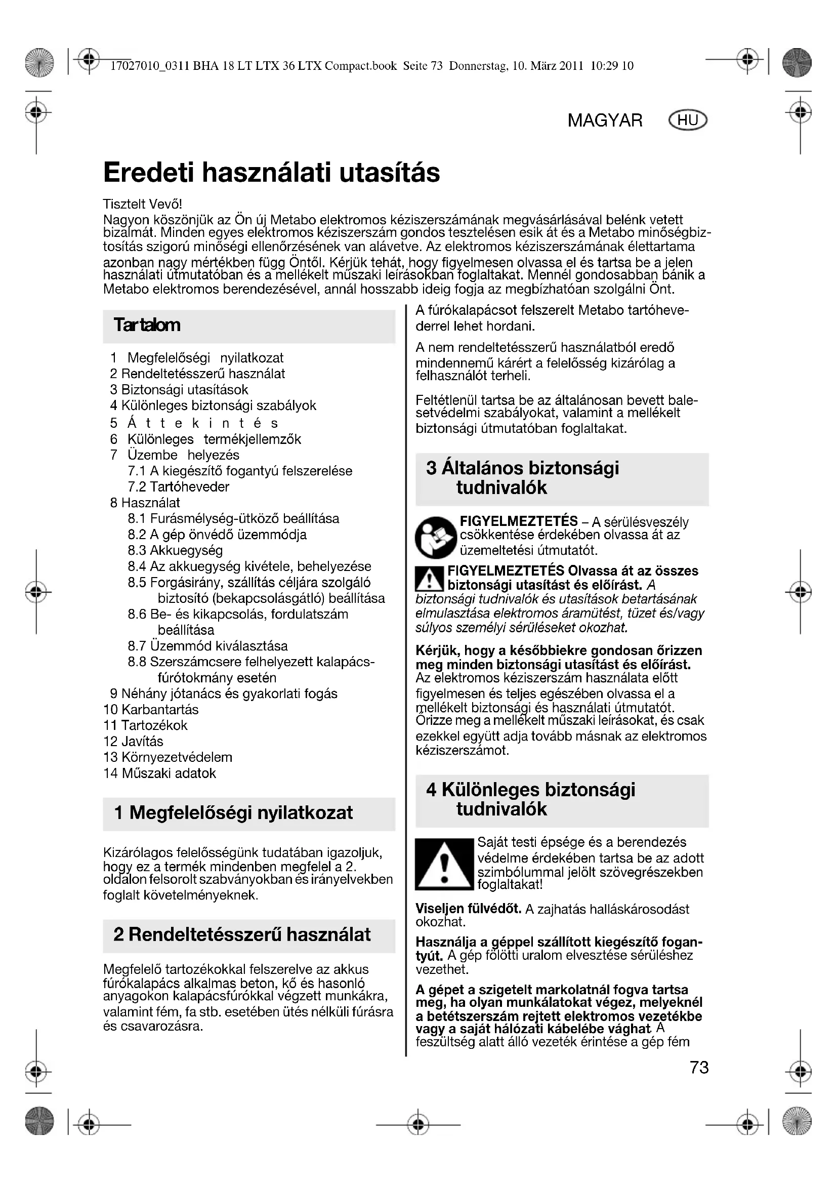 aját testi épsége és a berendezés védelme érdekében tartsa be az adott szimbólummal jelölt szövegrészekben foglaltakat! Viseljen fülvédőt. A zajhatás halláskárosodást okozhat. Használja a géppel szállított kiegészítő fogan- tyút. A gép fölötti uralom elvesztése sérüléshez vezethet. A gépet a szigetelt markolatnál fogva tartsa meg, ha olyan munkálatokat végez, melyeknél a betétszerszám rejtett elektromos vezetékbe vagy a saját hálózati kábelébe vághat . A feszültség alatt álló vezeték érintése a gép fém Eredeti használati utasítás Tisztelt Vevő! Nagyon köszönjük az Ön új Metabo elektromos kéziszerszámának megvásárlásával belénk vetett bizalmát. Minden egyes elektromos kéziszerszám gondos tesztelésen esik át és a Metabo minőségbiz- tosítás szigorú minőségi ellenőrzésének van alávetve. Az elektromos kéziszerszámának élettartama azonban nagy mértékben függ Öntől. Kérjük tehát, hogy figyelmesen olvassa el és tartsa be a jelen használati útmutatóban és a mellékelt műszaki leírásokban foglaltakat. Mennél gondosabban bánik a Metabo elektromos berendezésével, annál hosszabb ideig fogja az megbízhatóan szolgálni Önt. Tar talom 1 Megfelelőségi nyilatkozat 2 Rendeltetésszerű használat 3 Általános biztonsági tudnivalók 4 Különleges biztonsági tudnivalók 17027010_0311 BHA 18 LT LTX 36 LTX Compact.book Seite 73 Donnerstag, 10. März 2011 10:29 1074 MAGYAR