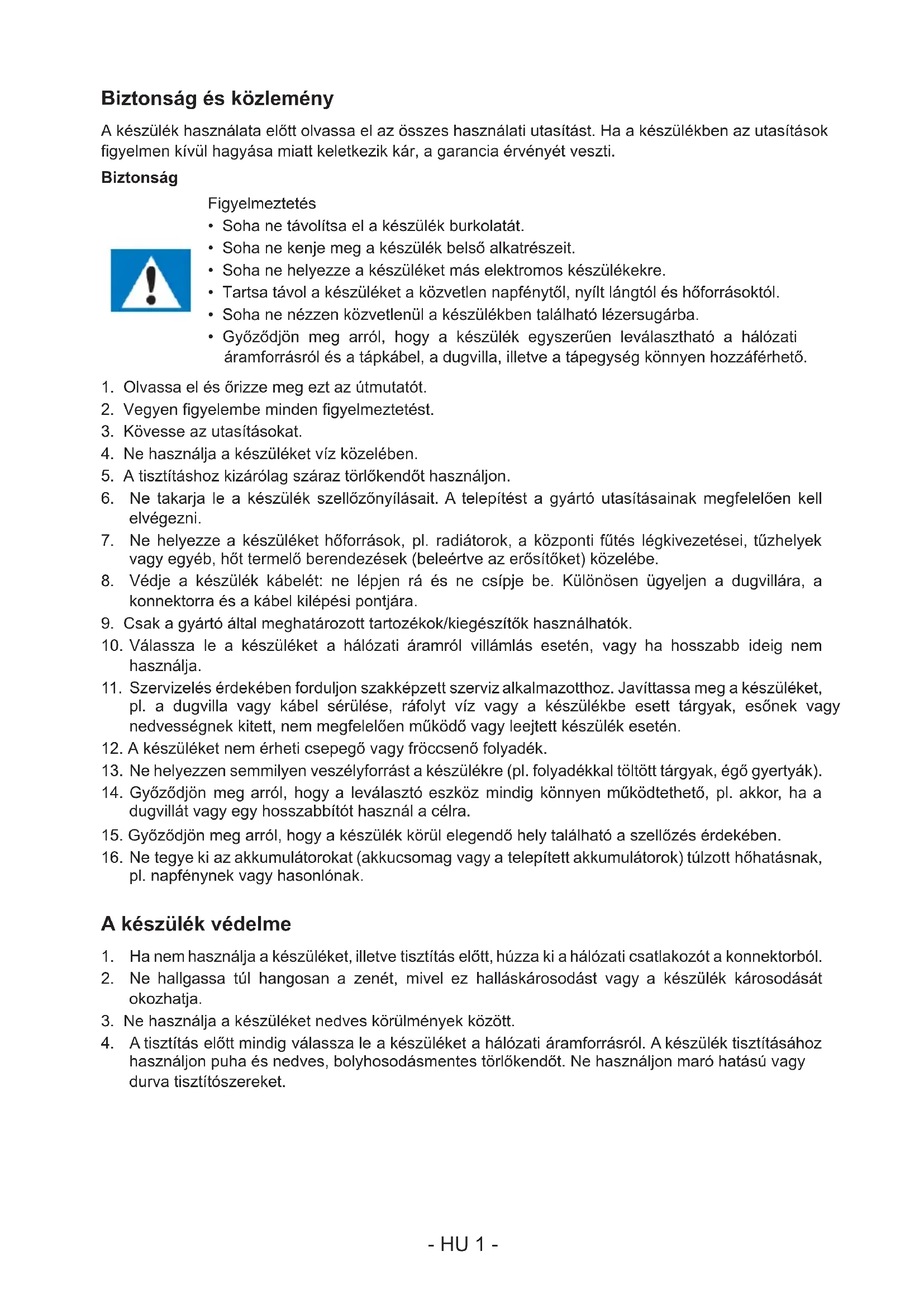 KÉRJÜK, A KÉSZÜLÉK MŰKÖDTETÉSE ELŐTT OLVASSA EL FIGYELMESEN EZT AZ ÚTMUTATÓT, ÉS ŐRIZZE MEG KÉSŐBBI TÁJÉKOZÓDÁS CÉLJÁBÓL. HU- HU 1 - Biztonság és közlemény A készülék használata előtt olvassa el az összes használati utasítást. Ha a készülékben az utasítások gyelmen kívül hagyása miatt keletkezik kár, a garancia érvényét veszti. Biztonság Figyelmeztetés