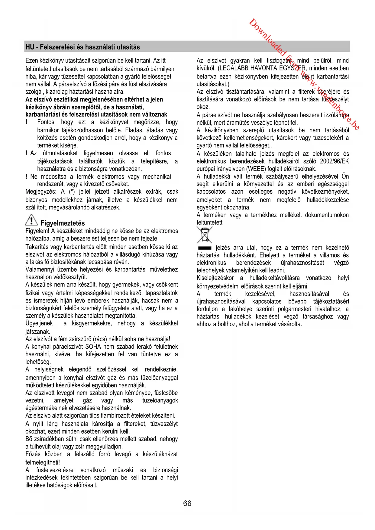 Stlačiť tlačidlo na dobu 3 sekúnd, vylúči sa elektronika riadenia odsávača pary. Táto funkcia môže byť užitočná počas čistenia výrobku. Pre opätovné zavedenie elektroniky, je postačujúce zopakovať operáciu. V prípade eventuálnych porúch v činnosti, skôr ako sa obrátite na odbornú asistenciu, odpojte aspoň na 5 sekúnd zariadenie od elektrického prívoda odpojením zástrčky a znovu ho napojte. V prípade, že by porucha v činnosti pretrvávala, obráťte sa na odbornú asistenciu. Údržba Pred akokoľvek operáciou čistenia či údržby odpojte digestor od elektrické siete, vyberte vidlicu zo zásuvky alebo vypnite hlavný spínač bytu. Čistenie Odsávač pary sa pravidelne čistí zvonku aj zvnútra (aspoň rovnako častým opakovaním ako sa vykonáva údržba filtrov tuku). Pri čistení je treba použiť látku navlhčenú denaturovaným liehom alebo neutrálnymi tekutými čistiacimi prostriedkami. Nepoužívajte prostriedky obsahujúce brúsne látky. NEPOUŽÍVAŤ ALKOHOL! Upozornenie: Nedodržanie noriem na čistenie zariadenia a výmenu filtrov predstavuje riziko požiaru. Odporúča sa preto dodržiavať uvedené pokyny. Výrobca odmieta akúkoľvek zodpovednosť za prípadné škody na motore, požiare vyvolané nesprávnou údržbou alebo nedodržaním vyššie uvedených upozornení. Protitukový filter Obr. 19-25 Udržuje častice tukov pochádzajúcich z varenia. Musí byť čistený jedenkrát za mesiac (alebo keď upozorňovací systém nasýteľnosti filtrov – ak je s ním príslušný model vybavený – upozorňuje túto nevyhnutnosť), nedráždivými čistiacími prostriedkami ručne alebo v umývačke s nízkou teplotou vody a krátkym cyklusovým programom. Umývaním v umývačke, protitukový filter sa môže odfarbiť, ale jeho filtračná cherakteristika sa tým vôbec nezmení. Na odpojenie protitukových filtrov potiahnite za pružinový háčik. Uhoľný filter (iba pre filtračnú verziu) Obr. 23 Udržuje nepríjemné zápachy pochádzajúce z varenia. Uhlíkový filter môže byť umývaný každé dva mesiace (alebo keď systém ukazovateľa nasýteľnosti filtrov – ak je poskytnutý u obdŕžaného modelu – ukazuje túto nevyhnutnosť) v teplej vode a s vhodnými čistiacimi prostriedkami alebo v umývačke na 65°C (v prípade umývania v umývačke vykonať kompletný umývací cyklus bez riadu vo vnútri). Odstrániť prebytočnú vodu bez poškodenia filtra, potom vložiť ho do rúry na 10 minút pri 100°C, kým sa definitívne nevysuší. Vymeniť matracík každé 3 roky a zakaždým, keď tkanina je poškodená. Výmena žiaroviek Odsávač pary je vybavený systémom osvetlenia založenom na technoloógii LED. Kontrolky LED zaručujú optimálne osvetlenie, trvanie až 10 krát dhlhšie ako tradičné žiarovky a umožňujú ušetriť 90% elektrickej energie. Pre výmenu, obrátiť sa na technický servis. Downloaded from www.vandenborre.be66 HU - Felszerelési és használati utasítás Ezen kézikönyv utasításait szigorúan be kell tartani. Az itt feltüntetett utasítások be nem tartásából származó bármilyen hiba, kár vagy tűzesettel kapcsolatban a gyártó felelősséget nem vállal. A páraelszívó a főzési pára és füst elszívására szolgál, kizárólag háztartási használatra. Az elszívó esztétikai megjelenésében eltérhet a jelen kézikönyv ábráin szereplőtől, de a használati, karbantartási és felszerelési utasítások nem változnak. ! Fontos, hogy ezt a kézikönyvet megőrizze, hogy bármikor tájékozódhasson belőle. Eladás, átadás vagy költözés esetén gondoskodjon arról, hogy a kézikönyv a terméket kísérje. ! Az útmutatásokat figyelmesen olvassa el: fontos tájékoztatások találhatók köztük a telepítésre, a használatra és a biztonságra vonatkozóan. ! Ne módosítsa a termék elektromos vagy mechanikai rendszerét, vagy a kivezető csöveket. Megjegyzés: A (*) jellel jelzett alkatrészek extrák, csak bizonyos modellekhez járnak, illetve a készülékkel nem szállított, megvásárolandó alkatrészek. Figyelmeztetés Figyelem! A készüléket mindaddig ne kösse be az elektromos hálózatba, amíg a beszerelést teljesen be nem fejezte. Takarítás vagy karbantartás előtt minden esetben kösse ki az elszívót az elektromos hálózatból a villásdugó kihúzása vagy a lakás fő biztosítékának lecsapása révén. Valamennyi üzembe helyezési és karbantartási művelethez használjon védőkesztyűt. A készülék nem arra készült, hogy gyermekek, vagy csökkent fizikai vagy értelmi képességekkel rendelkező, tapasztalatok és ismeretek híján levő emberek használják, hacsak nem a biztonságukért felelős személy felügyelete alatt, vagy ha ez a személy a készülék használatát megtanította. Ügyeljenek a kisgyermekekre, nehogy a készülékkel játszanak. Az elszívót a fém zsírszűrő (rács) nélkül soha ne használja! A konyhai páraelszívót SOHA nem szabad lerakó felületnek használni, kivéve, ha kifejezetten fel van tüntetve ez a lehetőség. A helyiségnek elegendő szellőzéssel kell rendelkeznie, amennyiben a konyhai elszívót gáz és más tüzelőanyaggal működtetett készülékekkel egyidőben használják. Az elszívott levegőt nem szabad olyan kéménybe, füstcsőbe vezetni, amelyet gáz vagy más tüzelőanyagok égéstermékeinek elvezetésére használnak. Az elszívó alatt szigorúan tilos flambírozott ételeket készíteni. A nyílt láng használata károsítja a filtereket, tűzveszélyt okozhat, ezért minden esetben kerülni kell. Bő zsiradékban sütni csak ellenőrzés mellett szabad, nehogy a túlhevült olaj vagy zsír meggyulladjon. Főzés közben a felszálló forró levegő a készülékházat felmelegítheti! A füstelvezetésre vonatkozó műszaki és biztonsági intézkedések tekintetében szigorúan be kell tartani a helyi illetékes hatósá