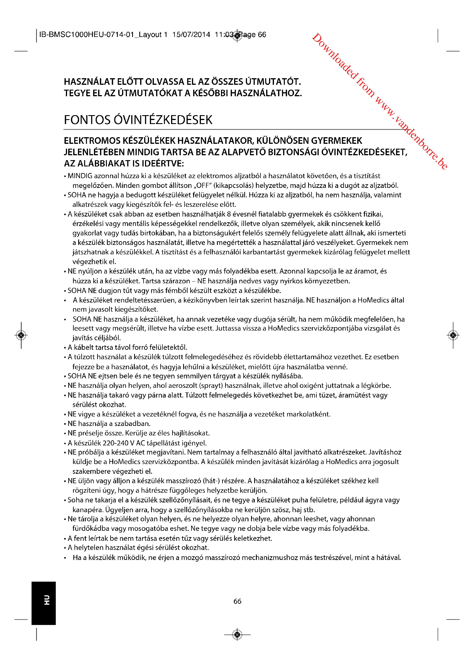 - Ügyeljen arra, hogy haja, ruházata és ékszerei mindig távol legyenek a készülék masszírozó mechanizmusától és más mozgó alkatrészétől. IB-BMSC1000HEU-0714-01_Layout 1 15/07/2014 11:03 Page 67 Downloaded from www.vandenborre.be68