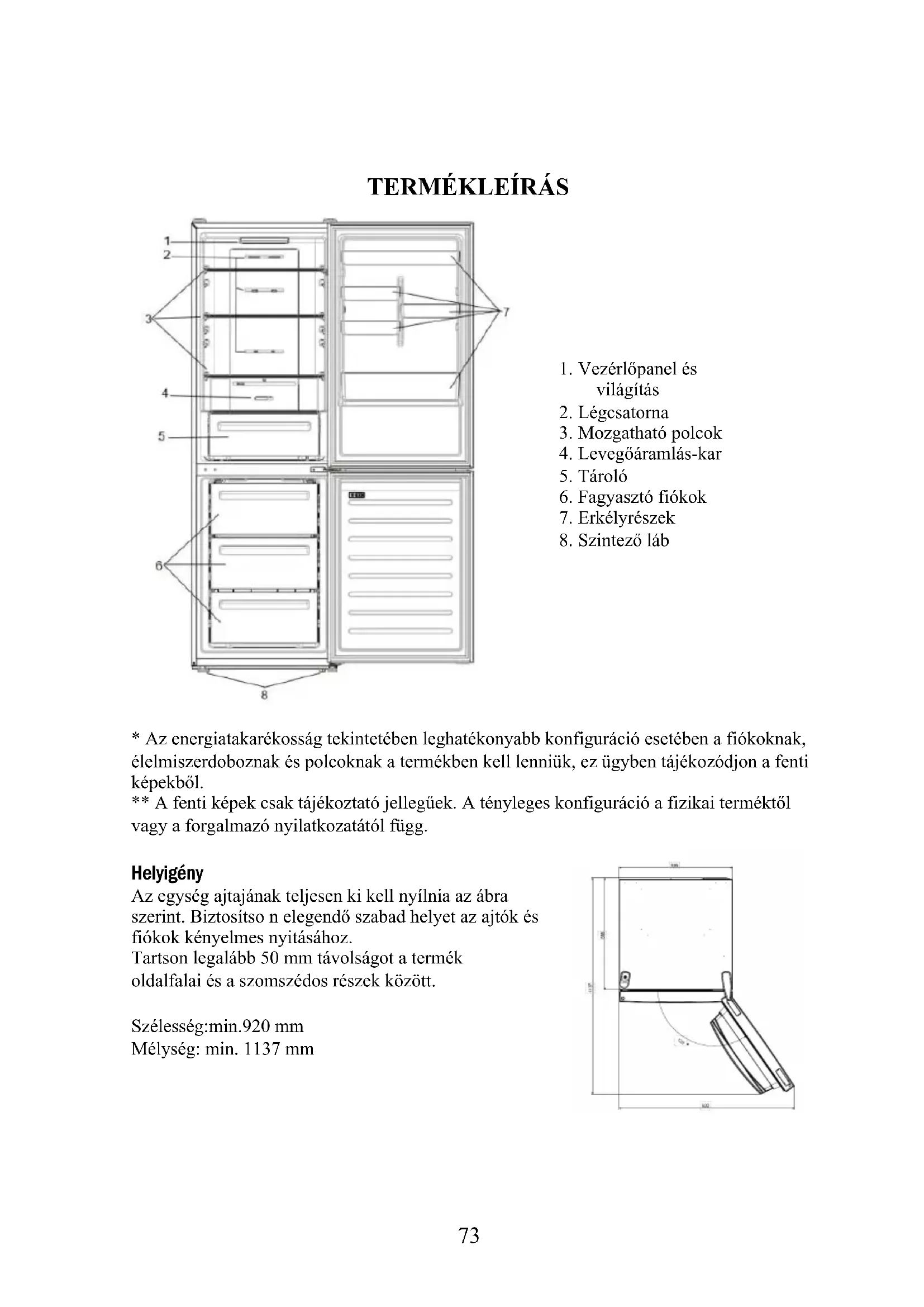 - Az energiatakarékosság tekintetében leghatékonyabb konfiguráció esetében a fiókoknak, élelmiszerdoboznak és polcoknak a termékben kell lenniük, ez ügyben tájékozódjon a fenti képekből. ** A fenti képek csak tájékoztató jellegűek. A tényleges konfiguráció a fizikai terméktől vagy a forgalmazó nyilatkozatától függ. Helyigény Az egység ajtajának teljesen ki kell nyílnia az ábra szerint. Biztosítso n elegendő szabad helyet az ajtók és fiókok kényelmes nyitásához. Tartson legalább 50 mm távolságot a termék oldalfalai és a szomszédos részek között. Szélesség:min.920 mm Mélység: min. 1137 mm74 HASZNÁLAT BE/KI gomb, amely a készülék be- és kikapcsolására szolgál. SET gomb, amely a hőmérséklet beállítására vagy a Super Cool funkció kiválasztására szolgál. Super Cool ikon, amely megerősíti a funkció bekapcsolt állapotát.