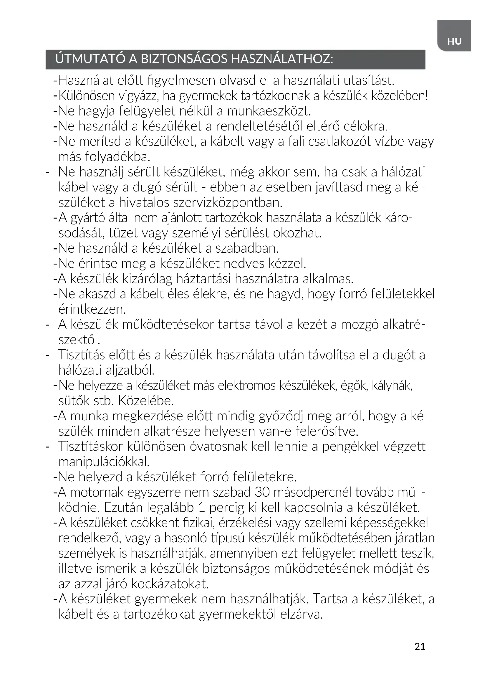 -A motornak egyszerre nem szabad 30 masodpercnél tovabb mu - ködnie. Ezután legalább 1 percig ki kell kapcsolnia a készüléket.