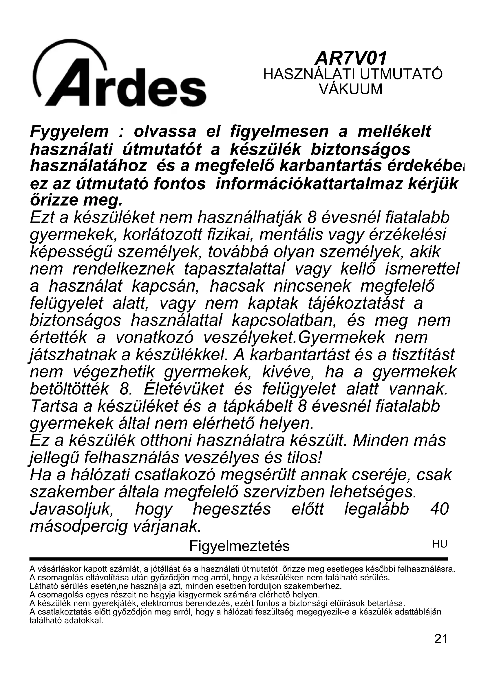Ezt a készüléket nem használhatják 8 évesnél fiatalabb gyermekek, korlátozott fizikai, mentális vagy érzékelési képességű személyek, továbbá olyan személyek, akik nem rendelkeznek tapasztalattal vagy kellő ismerettel a használat kapcsán, hacsak nincsenek megfelelő felügyelet alatt, vagy nem kaptak tájékoztatást a biztonságos használattal kapcsolatban, és meg nem értették a vonatkozó veszélyeket. Gyermekek nem játszhatnak a készülékkel. A karbantartást és a tisztítást nem végezhetik gyermekek, kivéve, ha a gyermekek betöltötték 8. Életévüket és felügyelet alatt vannak. Tartsa a készüléket és a tápkábelt 8 évesnél fiatalabb gyermekek által nem elérhető helyen.