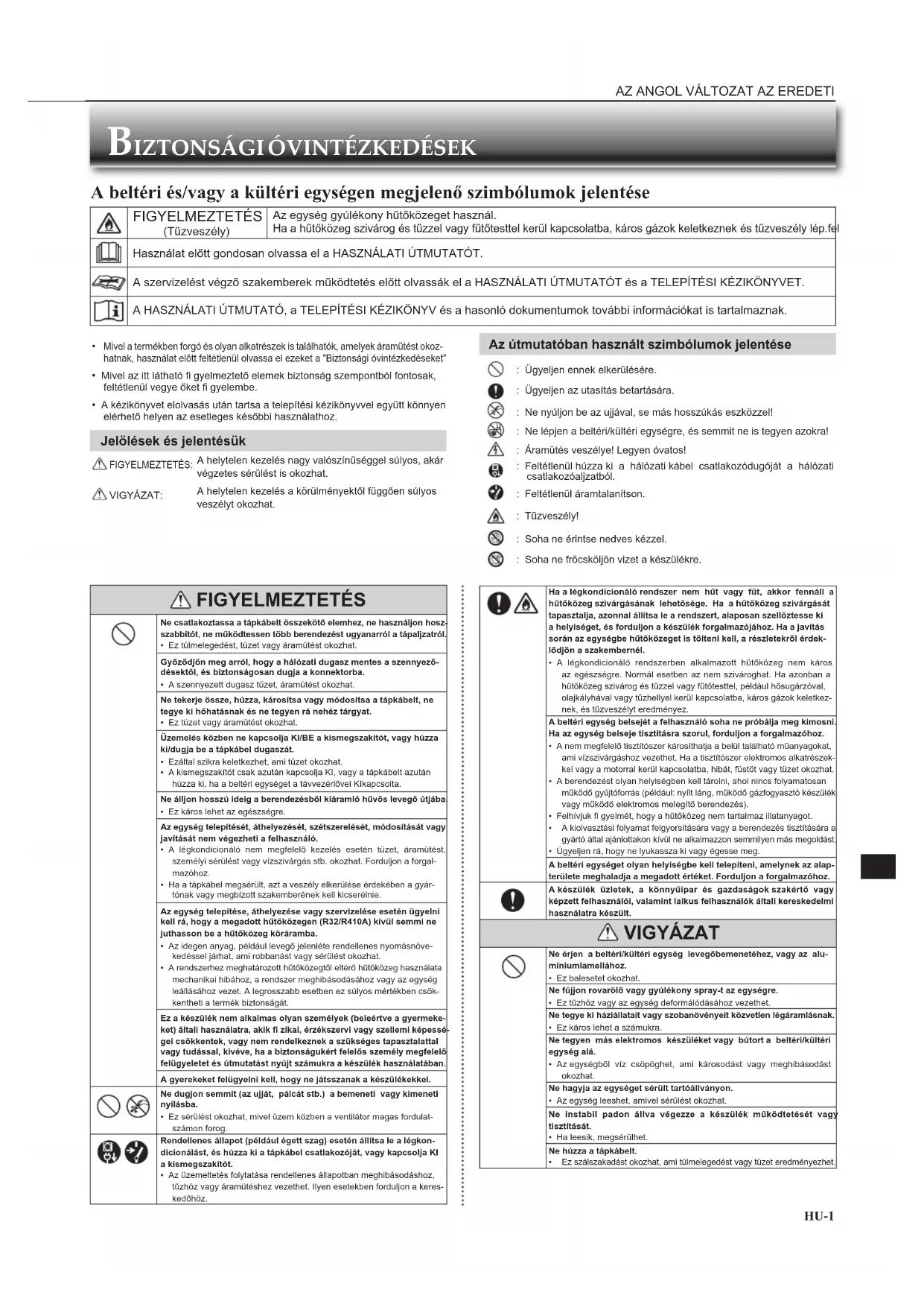 A beltéri és/vagy a kültéri egységen megjelenő szimbólumok jelentése FIGYELMEZTETÉS (Tűzveszély)Az egység gyúlékony hűtőközeget használ.Ha a hűtőközeg szivárog és tűzzel vagy fűtőtesttel kerül kapcsolatba, káros gázok keletkeznek és tűzveszély lép fel Használat előtt gondosan olvassa el a HASZNÁLATI ÚTMUTATÓT.A szervizelést végző szakemberek működtetés előtt olvassák el a HASZNÁLATI ÚTMUTATÓT és a TELEPÍTÉSI KÉZIKÖNYVET.A HASZNÁLATI ÚTMUTATÓ, a TELEPÍTÉSI KÉZIKÖNYV és a hasonló dokumentumok további információkat is tartalmaznak. FIGYELMEZTETÉS Ne csatlakoztassa a tápkábelt összekötő elemhez, ne használjon hosz-szabbítót, ne működtessen több berendezést ugyanarról a tápaljzatról.• Ez túlmelegedést, tüzet vagy áramütést okozhat.Győződjön meg arról, hogy a hálózati dugasz mentes a szennyező-désektől, és biztonságosan dugja a konnektorba.• A szennyezett dugasz tüzet, áramütést okozhat.Ne tekerje össze, húzza, károsítsa vagy módosítsa a tápkábelt, ne tegye ki hőhatásnak és ne tegyen rá nehéz tárgyat.• Ez tüzet vagy áramütést okozhat.Üzemelés közben ne kapcsolja KI/BE a kismegszakítót, vagy húzza ki/dugja be a tápkábel dugaszát.• Ezáltal szikra keletkezhet, ami tüzet okozhat.• A kismegszakítót csak azután kapcsolja KI, vagy a tápkábelt azután húzza ki, ha a beltéri egységet a távvezérlővel KIkapcsolta. Ne álljon hosszú ideig a berendezésből kiáramló hűvös levegő útjába.• Ez káros lehet az egészségre.Az egység telepítését, áthelyezését, szétszerelését, módosítását vagy javítását nem végezheti a felhasználó.• A légkondicionáló nem megfelelő kezelés esetén tüzet, áramütést, személyi sérülést vagy vízszivárgás stb. okozhat. Forduljon a forgal-mazóhoz.• Ha a tápkábel megsérült, azt a veszély elkerülése érdekében a gyár-tónak vagy megbízott szakemberének kell kicserélnie.Az egység telepítése, áthelyezése vagy szervizelése esetén ügyelni kell rá, hogy a megadott hűtőközegen (R32/R410A) kívül semmi ne juthasson be a hűtőközeg köráramba.• Az idegen anyag, például levegő jelenléte rendellenes nyomásnöve-kedéssel járhat, ami robbanást vagy sérülést okozhat.• A rendszerhez meghatározott hűtőközegtől eltérő hűtőközeg használata mechanikai hibához, a rendszer meghibásodásához vagy az egység leállásához vezet. A legrosszabb esetben ez súlyos mértékben csök-kentheti a termék biztonságát.Ez a készülék nem alkalmas olyan személyek (beleértve a gyermeke-ket) általi használatra, akik fi zikai, érzékszervi vagy szellemi képessé-gei csökkentek, vagy nem rendelkeznek a szükséges tapasztalattal vagy tudással, kivéve, ha a biztonságukért felelős személy megfelelő felügyeletet és útmutatást nyújt számukra a készülék használatában.A gyerekeket felügyelni kell, hogy ne játsszanak a készülékekkel. Ne dugjon semmit (az ujját, pálcát stb.) a bemeneti vagy kimeneti nyílásba.• Ez sérülést okozhat, mivel üzem közben a ventilátor magas fordulat-számon forog. Rendellenes állapot (például égett szag) esetén állítsa le a légkon-dicionálást, és húzza ki a tápkábel csatlakozóját, vagy kapcsolja KI a kismegszakítót.• Az üzemeltetés folytatása rendellenes állapotban meghibásodáshoz, tűzhöz vagy áramütéshez vezethet. Ilyen esetekben forduljon a keres-kedőhöz. Ha a légkondicionáló rendszer nem hűt vagy fűt, akkor fennáll a hűtőközeg szivárgásának lehetősége. Ha a hűtőközeg szivárgását tapasztalja, azonnal állítsa le a rendszert, alaposan szellőztesse ki a helyiséget, és forduljon a készülék forgalmazójához. Ha a javítás során az egységbe hűtőközeget is tölteni kell, a részletekről érdek-lődjön a szakembernél.• A légkondicionáló rendszerben alkalmazott hűtőközeg nem káros az egészségre. Normál esetben az nem szivároghat. Ha azonban a hűtőközeg szivárog és tűzzel vagy fűtőtesttel, például hősugárzóval, olajkályhával vagy tűzhellyel kerül kapcsolatba, káros gázok keletkez-nek, és tűzveszélyt eredményez.A beltéri egység belsejét a felhasználó soha ne próbálja meg kimosni. Ha az egység belseje tisztításra szorul, forduljon a forgalmazóhoz.• A nem megfelelő tisztítószer károsíthatja a belül található műanyagokat, ami vízszivárgáshoz vezethet. Ha a tisztítószer elektromos alkatrészek-kel vagy a motorral kerül kapcsolatba, hibát, füstöt vagy tüzet okozhat.• A berendezést olyan helyiségben kell tárolni, ahol nincs folyamatosan működő gyújtóforrás (például: nyílt láng, működő gázfogyasztó készülék vagy működő elektromos melegítő berendezés).• Felhívjuk fi gyelmét, hogy a hűtőközeg nem tartalmaz illatanyagot. A kiolvasztási folyamat felgyorsítására vagy a berendezés tisztítására a gyártó által ajánlottakon kívül ne alkalmazzon semmilyen más megoldást.• Ügyeljen rá, hogy ne lyukassza ki vagy égesse meg.A beltéri egységet olyan helyiségbe kell telepíteni, amelynek az alap-területe meghaladja a megadott értéket. Forduljon a forgalmazóhoz.A készülék üzletek, a könnyűipar és gazdaságok szakértő vagy képzett felhasználói, valamint laikus felhasználók általi kereskedelmi használatra készült. VIGYÁZAT Ne érjen a beltéri/kültéri egység levegőbemenetéhez, vagy az alu-míniumlamellához.• Ez balesetet okozhat.Ne fújjon rovarölő vagy gyúlékony spray-t az egységre.• Ez tűzhöz vagy az egység deformálódásához vezethet.Ne tegye ki háziállatait vagy szobanövényeit közvetlen légáramlásnak.• Ez káros lehet a számukra.Ne tegyen más elektromos készüléket vagy bútort a beltéri/kültéri egység alá.• Az egységből víz csöpöghet, ami károsodást vagy meghibásod