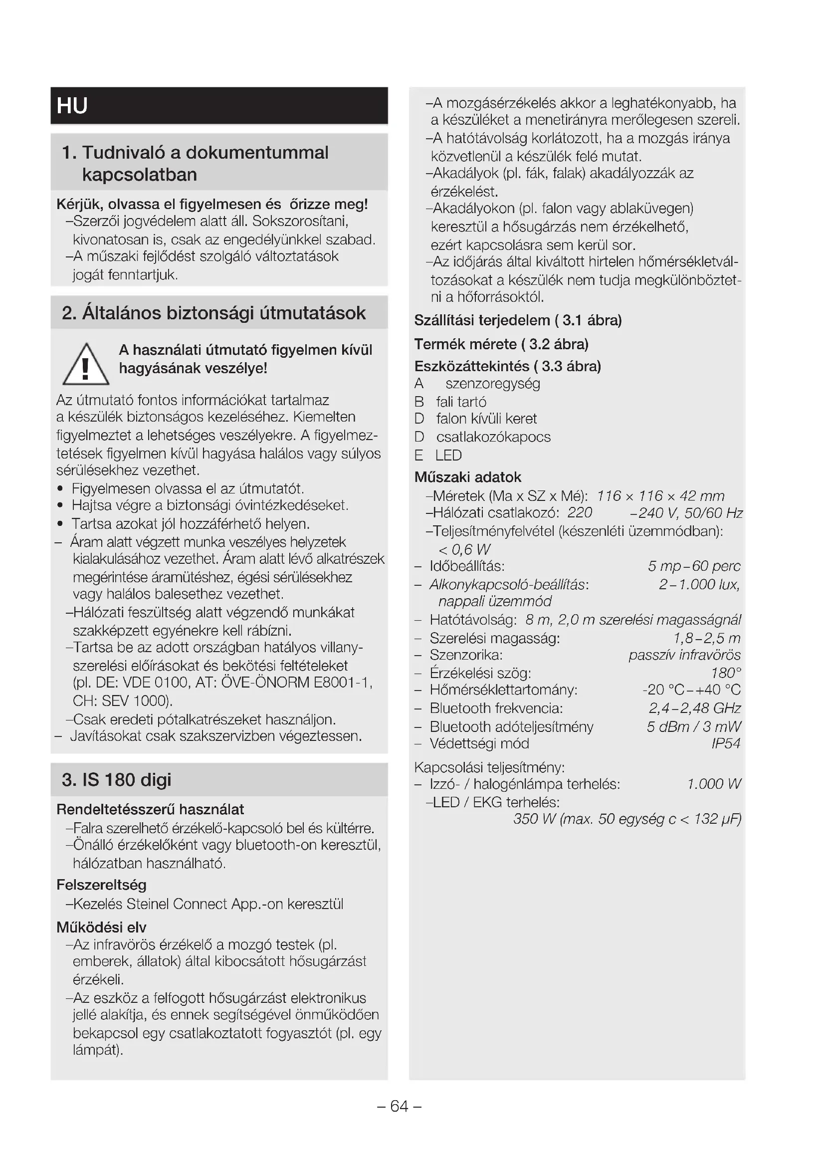 Rendeltetésszerű használat – Falra szerelhető érzékelő-kapcsoló bel és kültérre. – Önálló érzékelőként vagy bluetooth-on keresztül, hálózatban használható. Felszereltség – Kezelés Steinel Connect App.-on keresztül Működési elv – Az infravörös érzékelő a mozgó testek (pl. emberek, állatok) által kibocsátott hősugárzást érzékeli. – Az eszköz a felfogott hősugárzást elektronikus jellé alakítja, és ennek segítségével önműködően bekapcsol egy csatlakoztatott fogyasztót (pl. egy lámpát). – A mozgásérzékelés akkor a leghatékonyabb, ha a készüléket a menetirányra merőlegesen szereli. – A hatótávolság korlátozott, ha a mozgás iránya közvetlenül a készülék felé mutat. – Akadályok (pl. fák, falak) akadályozzák az érzékelést. – Akadályokon (pl. falon vagy ablaküvegen) keresztül a hősugárzás nem érzékelhető, ezért kapcsolásra sem kerül sor. – Az időjárás által kiváltott hirtelen hőmérsékletvál- tozásokat a készülék nem tudja megkülönböztet- ni a hőforrásoktól. Szállítási terjedelem ( 3.1 ábra) Termék mérete ( 3.2 ábra) Eszközáttekintés ( 3.3 ábra) A szenzoregység B fali tartó D falon kívüli keret D csatlakozókapocs E LED Műszaki adatok – Méretek (Ma x SZ x Mé): 116×116×42mm – Hálózati csatlakozó: 220 – 240V, 50/60Hz – Teljesítményfelvétel (készenléti üzemmódban): <0,6W – Időbeállítás: 5 mp – 60 perc – Alkonykapcsoló-beállítás: 2 – 1.000lux, nappali üzemmód – Hatótávolság: 8m, 2,0 m szerelési magasságnál – Szerelési magasság: 1,8 – 2,5m – Szenzorika: passzív infravörös – Érzékelési szög: 180° – Hőmérséklet tartomány: -20 °C – +40 °C – Bluetooth frekvencia: 2,4 – 2,48GHz – Bluetooth adóteljesítmény 5dBm/3mW – Védettségi mód IP54 Kapcsolási teljesítmény: – Izzó-/halogénlámpa terhelés: 1.000W – LED / EKG terhelés: 350 W (max. 50 egység c < 132 µF)– 65 –