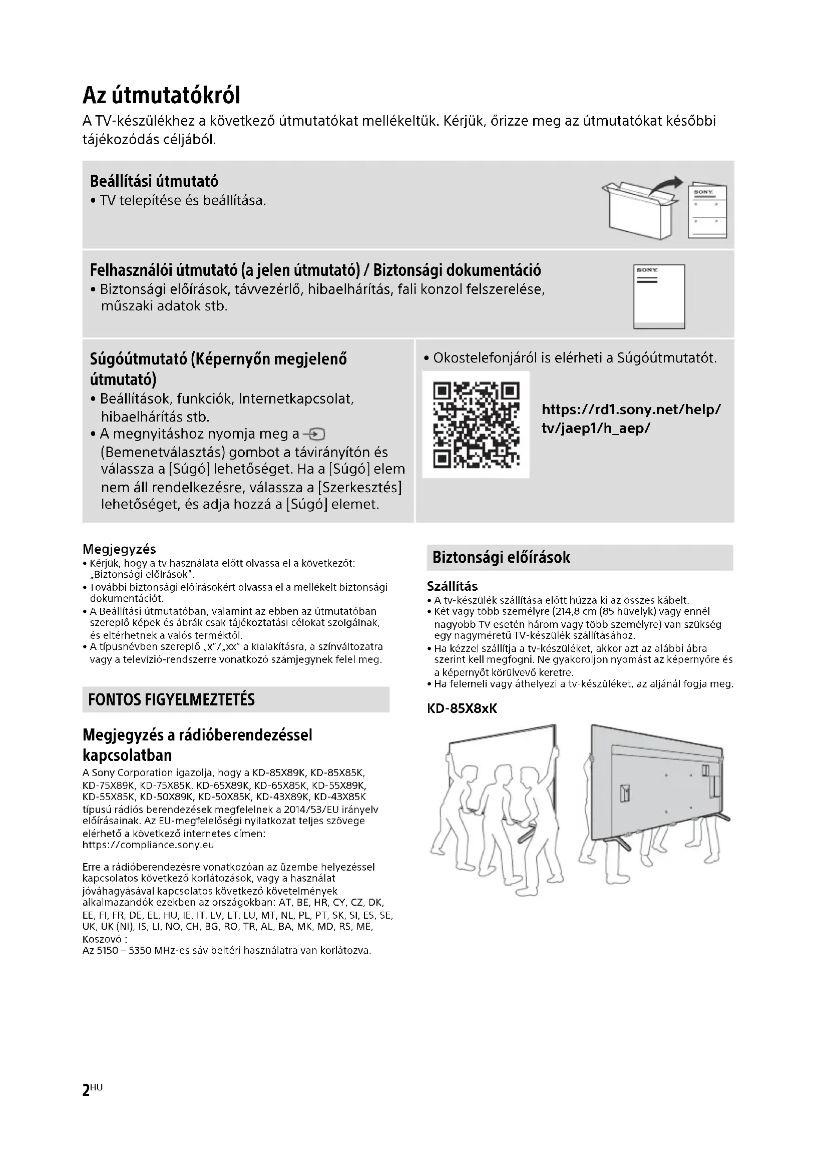 - A típusnévben szereplő „x”/„xx” a kialakításra, a színváltozatra vagy a televízió-rendszerre vonatkozó számjegynek felel meg. Megjegyzés a rádióberendezéssel kapcsolatban A Sony Corporation igazolja, hogy a KD-85X89K, KD-85X85K, KD-75X89K, KD-75X85K, KD-65X89K, KD-65X85K, KD-55X89K, KD-55X85K, KD-50X89K, KD-50X85K, KD-43X89K, KD-43X85K típusú rádiós berendezések megfelelnek a 2014/53/EU irányelv előírásainak. Az EU-megfelelőségi nyilatkozat teljes szövege elérhető a következő internetes címen: https://compliance.sony.eu Erre a rádióberendezésre vonatkozóan az üzembe helyezéssel kapcsolatos következő korlátozások, vagy a használat jóváhagyásával kapcsolatos következő követelmények alkalmazandók ezekben az országokban: AT, BE, HR, CY, CZ, DK, EE, FI, FR, DE, EL, HU, IE, IT, LV, LT, LU, MT, NL, PL, PT, SK, SI, ES, SE, UK, UK (NI), IS, LI, NO, CH, BG, RO, TR, AL, BA, MK, MD, RS, ME, Koszovó : Az 5150 – 5350 MHz-es sáv beltéri használatra van korlátozva. Szállítás