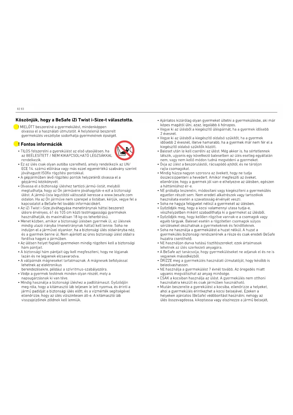 - Miután beszerelte a gyerekülést a kocsiba, ellenőrizze a helyeket, ahol a gyermekülés érintkezhet a kocsi belsejével. Ezeken a helyeken ajánlatos (BeSafe) védőborítást használni, nehogy az ülés összevagdossa, kikoptassa vagy elszínezze a jármű belsejét, ! MIELŐTT beszerelné a gyermekülést, mindenképpen olvassa el a használati útmutatót. A helytelenül beszerelt gyermekülés veszélybe sodorhatja gyermekének épségét. Köszönjük, hogy a BeSafe iZi Twist i-Size-t választotta.84 85