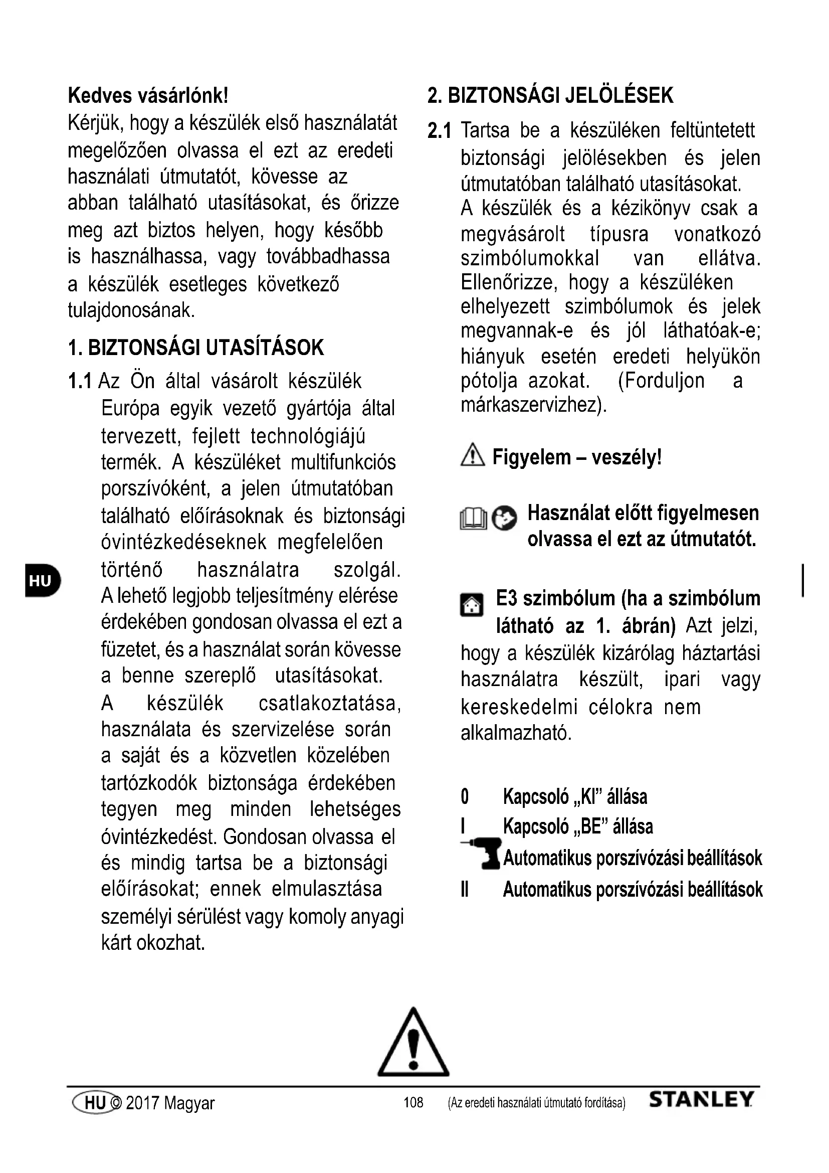 | Biztons e1g | Csak sz e1raz e9s nedves fel fcleteken haszn e1lhat f3, gy faleteg anyagokat nem szabad porsz edvni, k f6vesse a kezel51k f6nyvben megadott biztons e1gi utas edt e1sokat. |