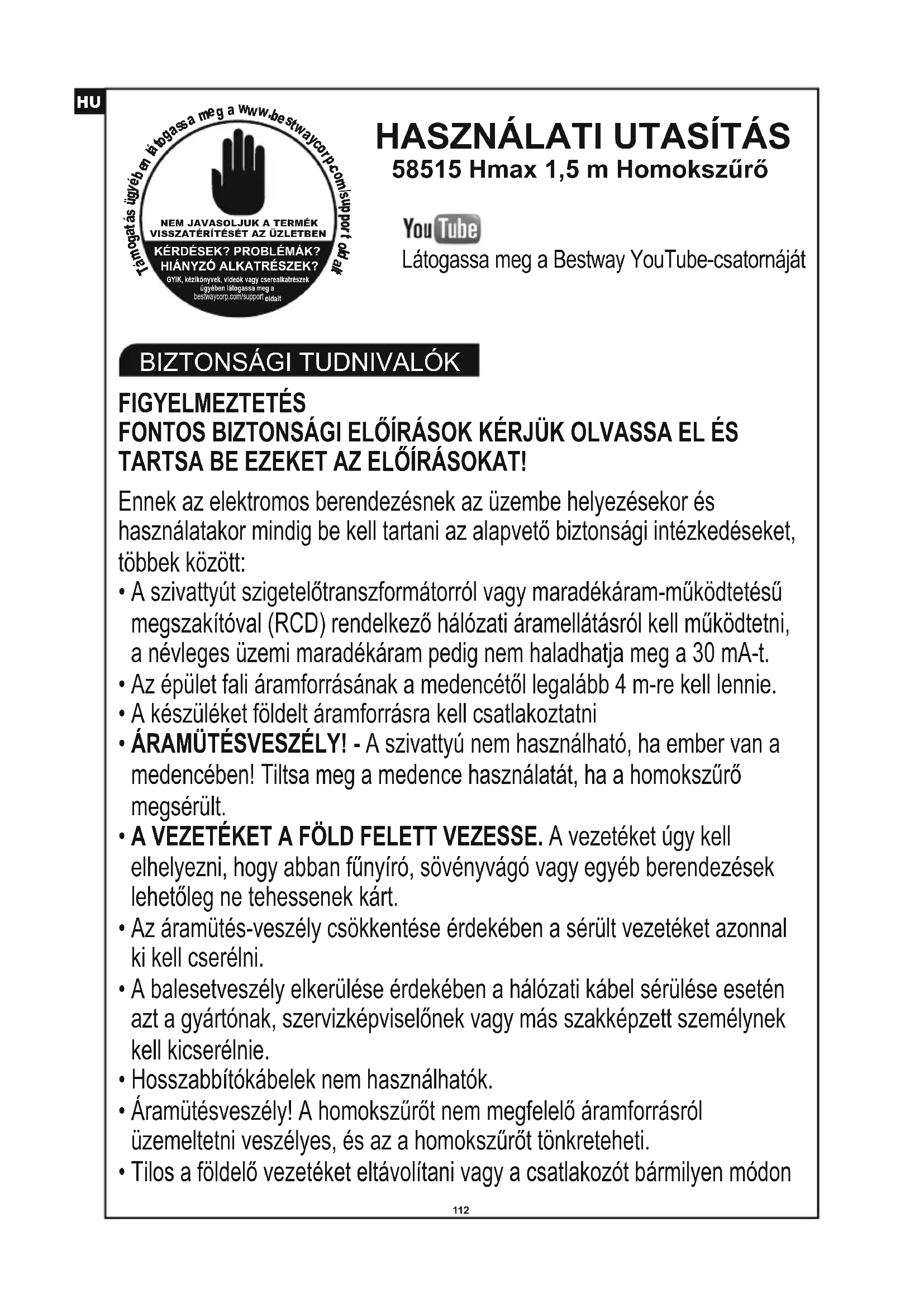 - Az utasítások elvesztése esetén, kérjük, vegye fel a kapcsolatot a Bestway vállalattal, vagy keresse meg a következő weboldalon: www.bestwaycorp.com