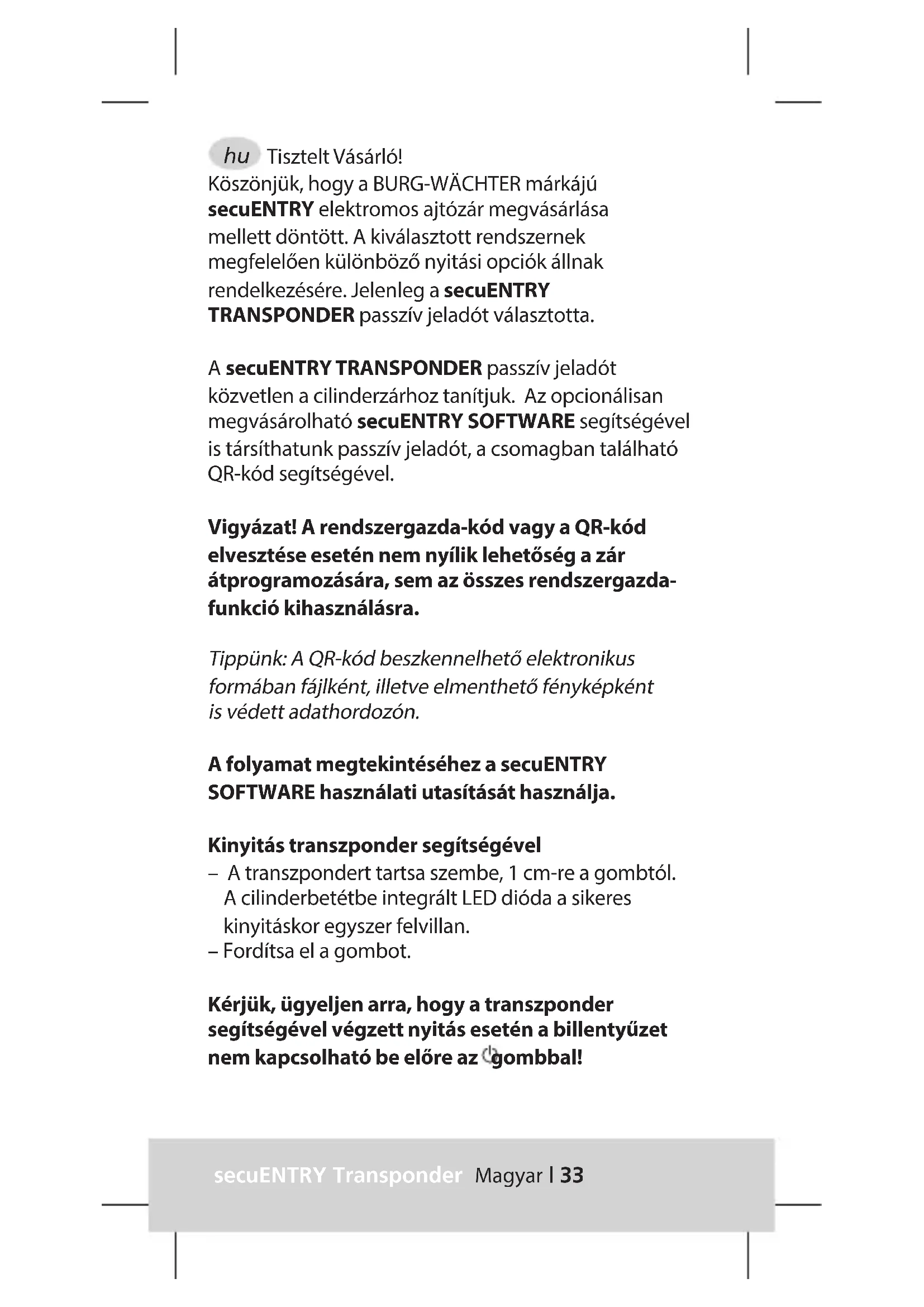 Kérjuk, ügyeljenarra, hogy a transzponder segitségevel vegzett nyitás esetén a billentyüzet nem kapcsolhato be elore az gombbal!