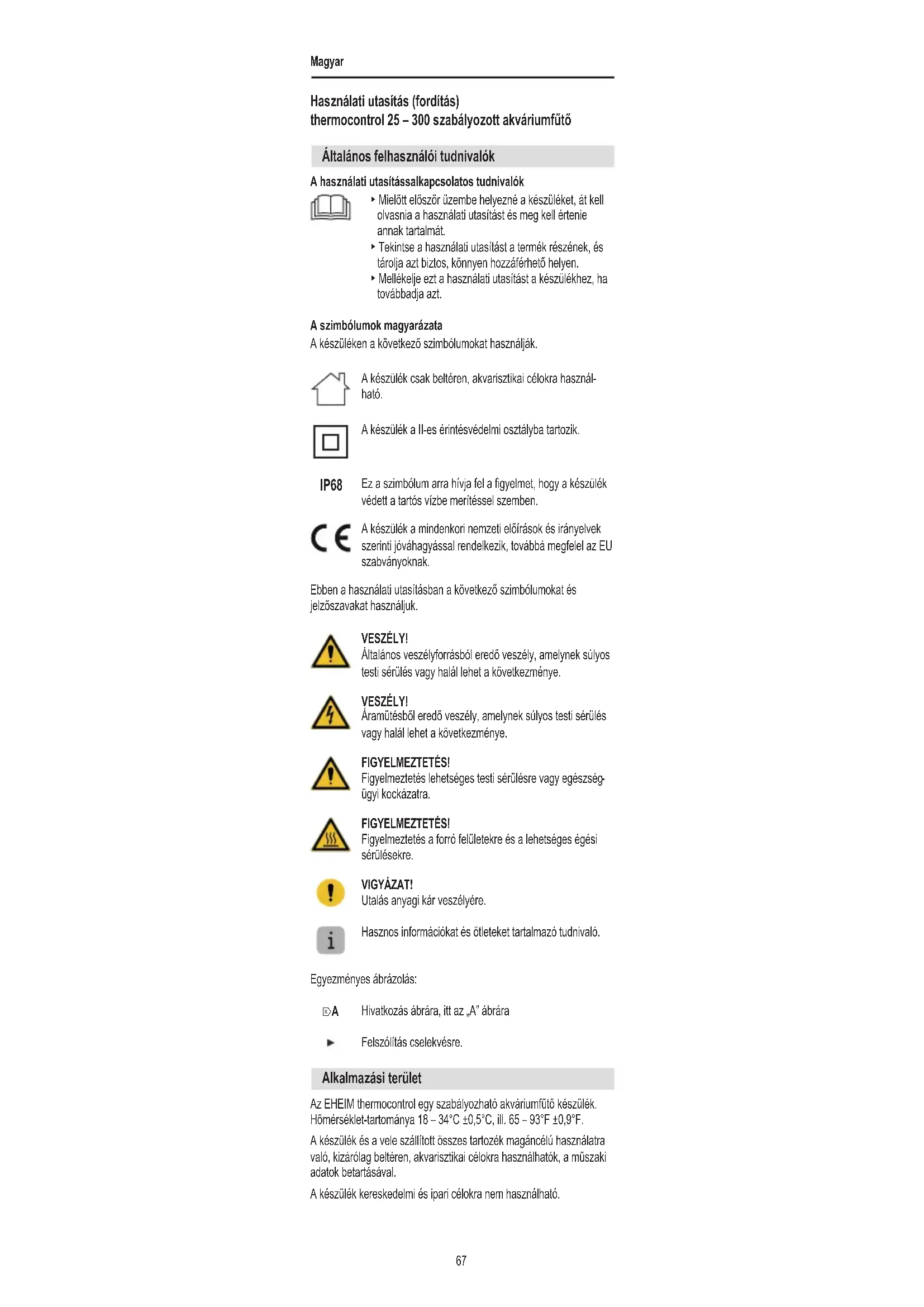 Alkalmazási terület Az EHEIM thermocontrol egy szabályozható akváriumfűtő készülék. Hőmérséklet-tartománya 18 – 34°C ±0,5°C, ill. 65 – 93°F ±0,9°F. A készülék és a vele szállított összes tartozék magáncélú használatra való, kizárólag beltéren, akvarisztikai célokra használhatók, a műszaki adatok betartásával. A készülék kereskedelmi és ipari célokra nem használható.Magyar