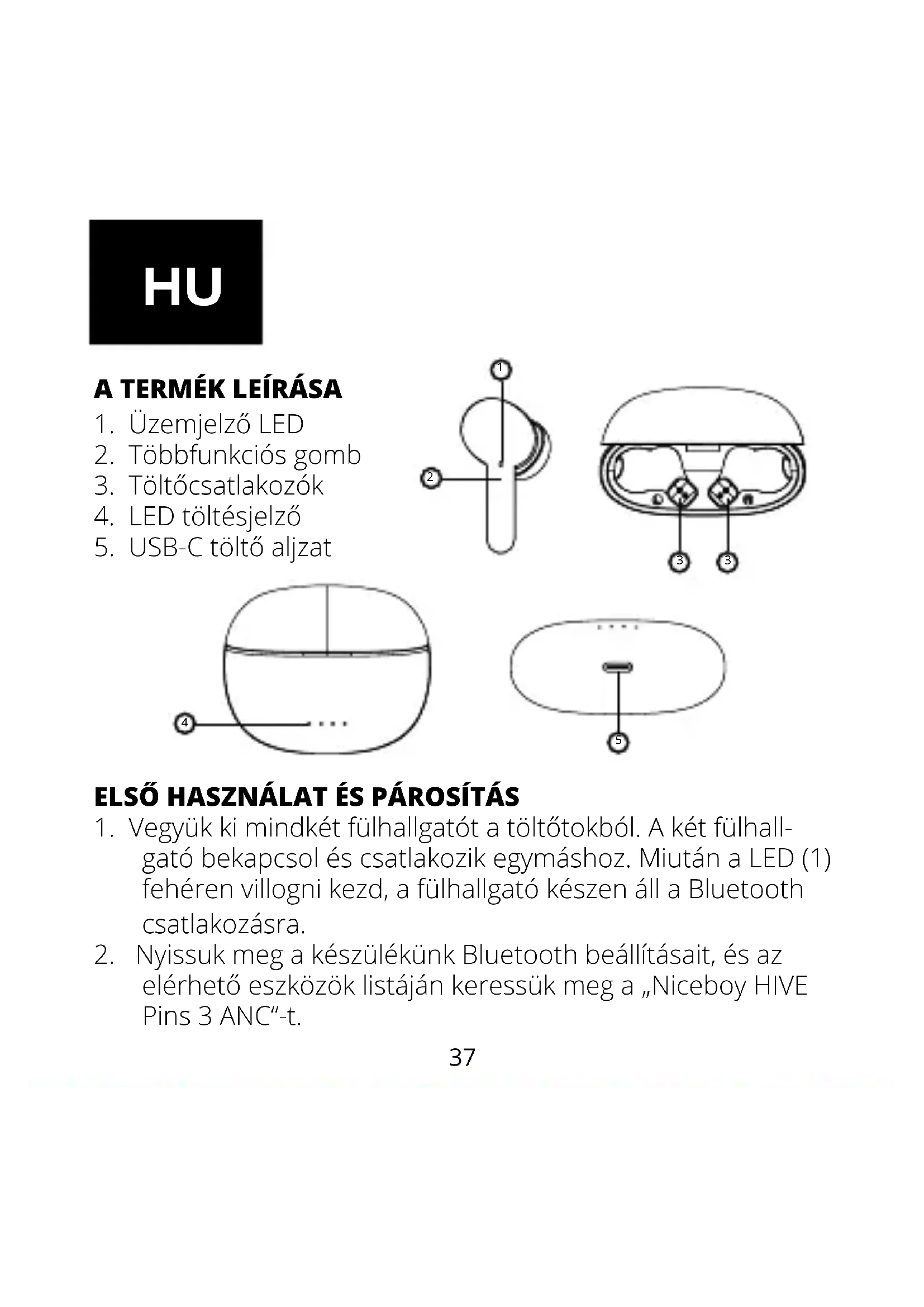 A letölthető elektronikus kivitelű használati útmutatót a www. niceboy.eu oldalon a támogatás szekcióban találja. Az NICEBOY s.r.o. ezúton kijelenti, hogy a NICEBOY HIVE PINS 3 ANC típusú44 rádióhullámokat használó készülék megfelel a 2014/53/EU, 2014/30/EU, 2014/35/ EU és 2011/65/EU irányelveknek. Az EU megfelelőségi nyilatkozat teljes szövege a következő weboldalon elérhető: https://niceboy.eu/hu/declaration/hive-pins-3-anc ELEKTROMOS ÉS ELEKTRONIKUS KÉSZÜLÉKEK MEG- SEMMISÍTÉSÉRE VONATKOZÓ FELHASZNÁLÓI TÁJÉKOZ- TATÓ (HÁZTARTÁSOK) A terméken vagy a kísérődokumentumokban feltünte- tett szimbólum azt jelenti, hogy a használt elektromos vagy elektronikus termékeket tilos háztartási hulla- dékként megsemmisíteni. Megfelelő ártalmatlanítása céljával a terméket térítésmentesen adja le e célra kijelölt gyűjtőhelyen. A termék előírásszerű megsemmisítésével érté- kes természeti forrásokat óvhat meg, és megelőzheti a nem megfelelő hulladékkezelés környezetre, valamint az emberi egészségre potenciálisan kifejtett negatív hatásait. További tájékoztatást az illetékes önkormányzati szervektől, vagy a le- gközelebbi gyűjtőhelyen kérhet. Az ilyen típusú hulladékok nem megfelelő ártalmatlanítása esetén a nemzeti jogszabályokkal összhangban bírságok kivetésére kerülhet sor.45 Elektromos és elektronikus berendezések megsemmisítésére vonatkozó felhasználói tájékoztató (Vállalati és kereskedelmi célú felhasználás) A vállalati és kereskedelmi céllal felhasznált elektromos és elektronikus berendezések megfelelő ártalma- tlanításához vegye fel a kapcsolatot a termék gyártójával vagy importőrével. Ő tájékoztatni fogja az elektromos készülék ártal- matlanításának forgalomba hozatali időpontól függő megfelelő módjáról, valamint arról, hogy ki köteles az elektromos készülék ártalmatlanítását nanszírozni. Tájékoztatás Európai Unión kívüli más országokban végzett ártalmatlanításról. A fenti szim- bólum kizárólag az Európai Unió tagállamaiban érvényes. Az elektromos és elektronikus készülékek helyes megsemmisítése tárgyában kérjen részletes tájékoztatást az illetékes szervektől vagy a termék forgalmazójától.46 OPIS PROIZVODA