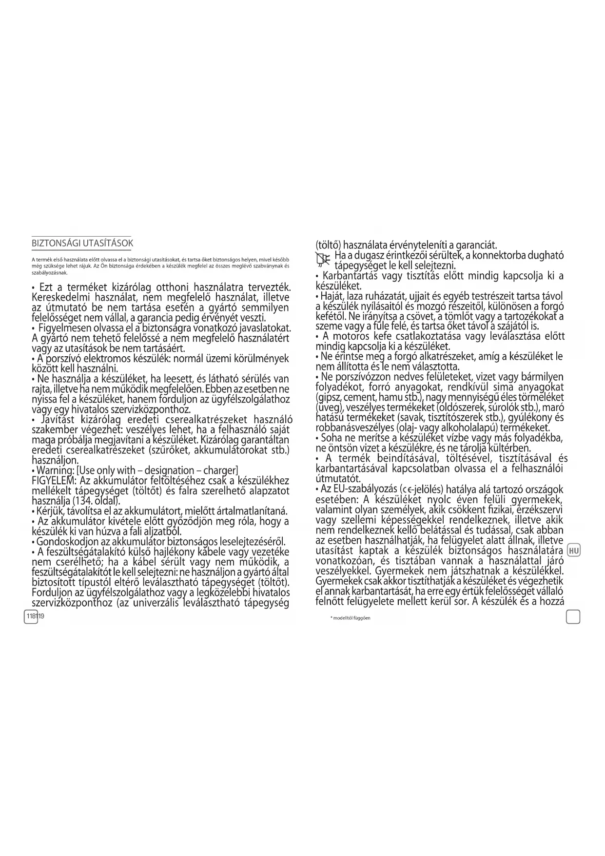 - Ne mossa mosogatógépben a porgyűjtő alkatrészeit és a motorvédő szűrőt. AZ AKKUMULÁTORRA VONATKOZÓ BIZTONSÁGI UTASÍTÁSOK