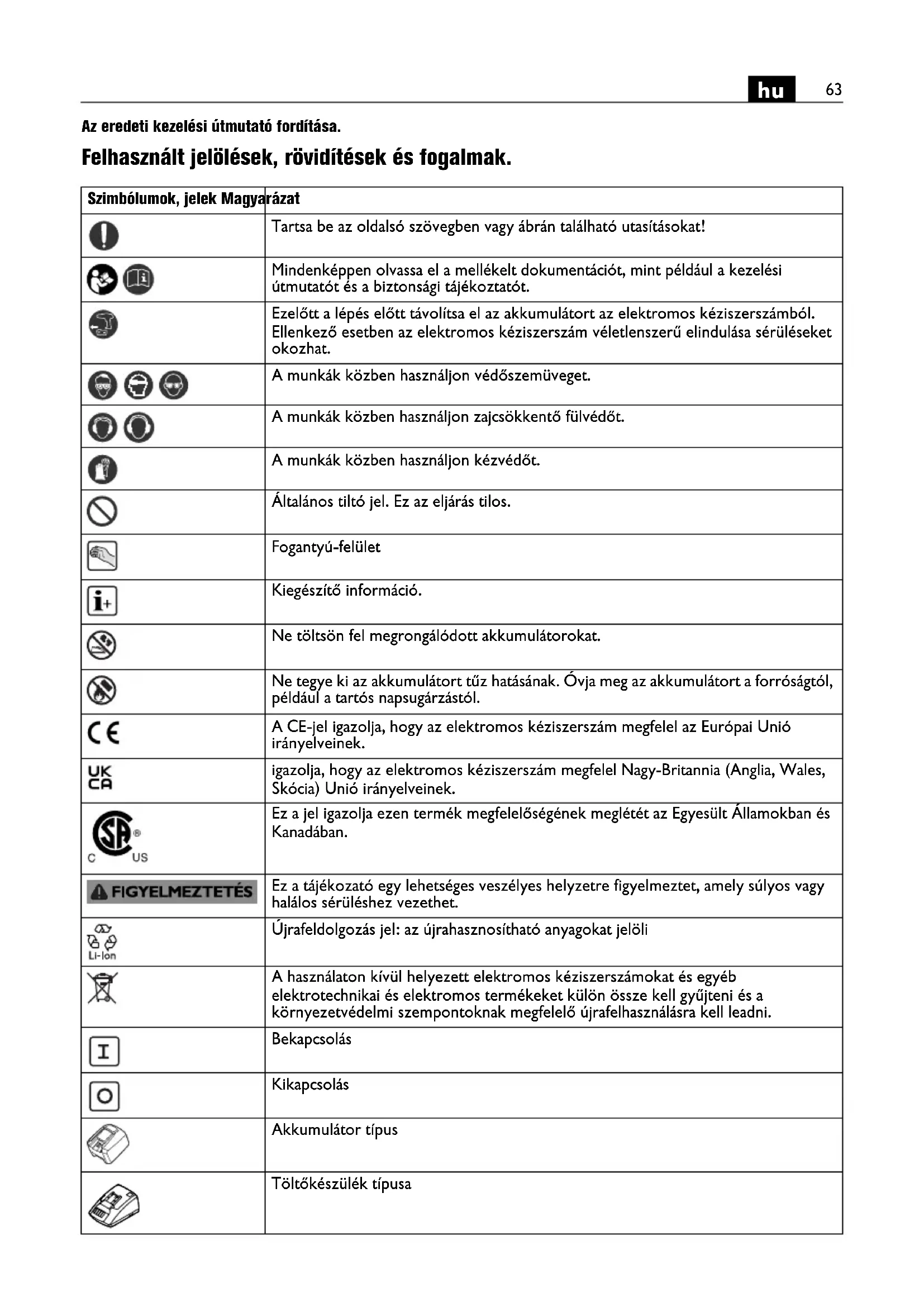 Az eredeti kezelési útmutató fordítása. Felhasznált jelölések, rövidítések és fogalmak. Szimbólumok, jelek Magyarázat Tartsa be az oldalsó szövegben vagy ábrán található utasításokat! Mindenképpen olvassa el a mellékelt dokumentációt, mint például a kezelési útmutatót és a biztonsági tájékoztatót. Ezelőtt a lépés előtt távolítsa el az akkumulátort az elektromos kéziszerszámból. Ellenkező esetben az elektromos kéziszerszám véletlenszerű elindulása sérüléseket okozhat. A munkák közben használjon védőszemüveget. A munkák közben használjon zajcsökkentő fülvédőt. A munkák közben használjon kézvédőt. Általános tiltó jel. Ez az eljárás tilos. Fogantyú-felület Kiegészítő információ. Ne töltsön fel megrongálódott akkumulátorokat. Ne tegye ki az akkumulátort tűz hatásának. Óvja meg az akkumulátort a forróságtól, például a tartós napsugárzástól. A CE-jel igazolja, hogy az elektromos kéziszerszám megfelel az Európai Unió irányelveinek. igazolja, hogy az elektromos kéziszerszám megfelel Nagy-Britannia (Anglia, Wales, Skócia) Unió irányelveinek. Ez a jel igazolja ezen termék megfelelőségének meglétét az Egyesült Államokban és Kanadában. Ez a tájékozató egy lehetséges veszélyes helyzetre figyelmeztet, amely súlyos vagy halálos sérüléshez vezethet. Újrafeldolgozás jel: az újrahasznosítható anyagokat jelöli A használaton kívül helyezett elektromos kéziszerszámokat és egyéb elektrotechnikai és elektromos termékeket külön össze kell gyűjteni és a környezetvédelmi szempontoknak megfelelő újrafelhasználásra kell leadni. Bekapcsolás Kikapcsolás Akkumulátor típus Töltőkészülék típusa64