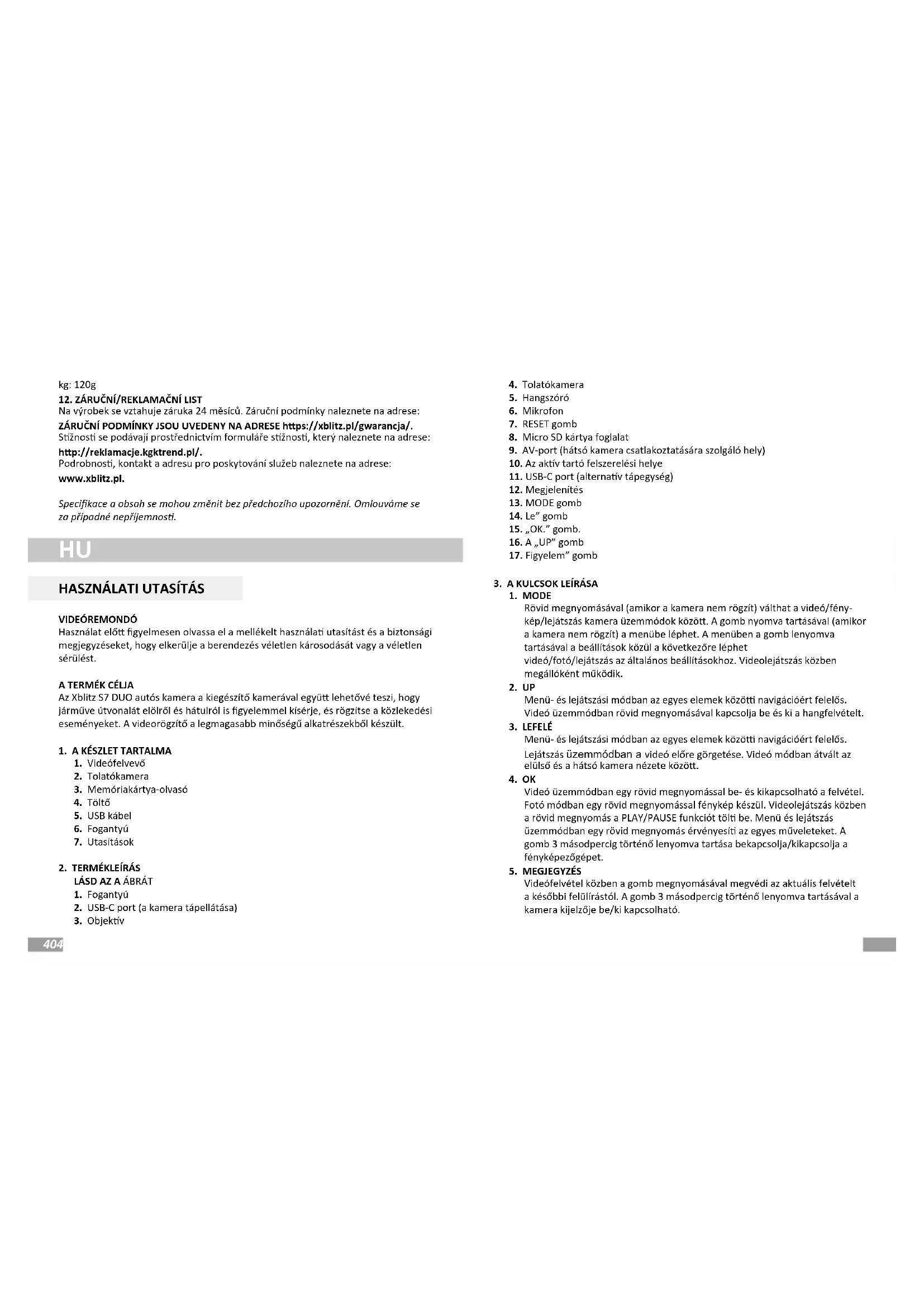 A termékre 24 hónapos garancia vonatkozik. A garanciális feltételek a következő weboldalon találhatók: hps://xblitz.pl/gwarancja/ A panaszokat a következő címen található panaszbejelentő űrlapon kell benyújtani: hp://reklamacje.kgktrend.pl/ Részletek, elérhetőség és a szolgáltatás címe a következő címen található: www.xblitz.pl. A specikációk és a tartalom előzetes értesítés nélkül változhatnak. Elnézést kérünk az esetleges kellemetlenségekért.