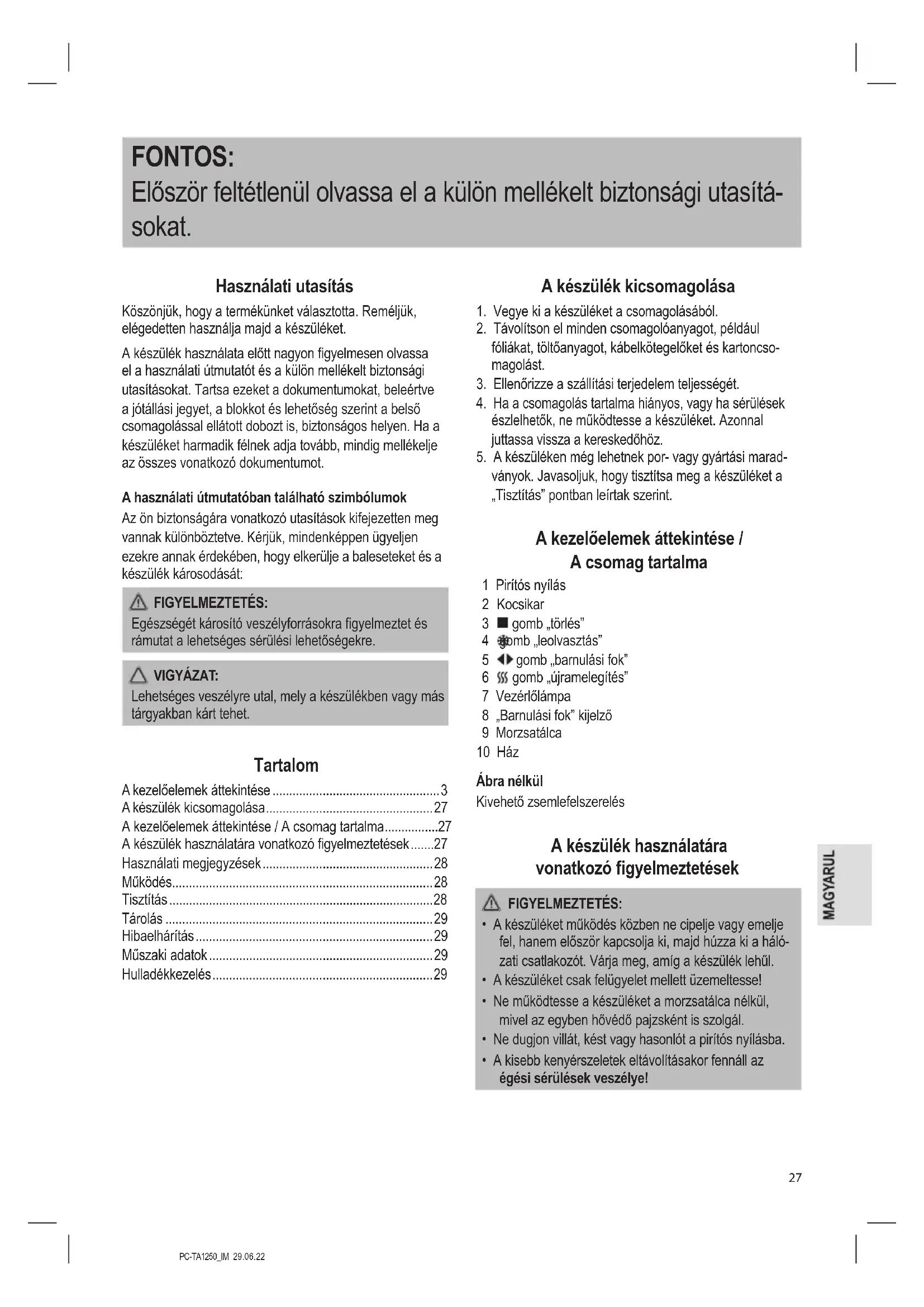 - A kezelőelemek áttekintése / A csomag tartalma p. 27