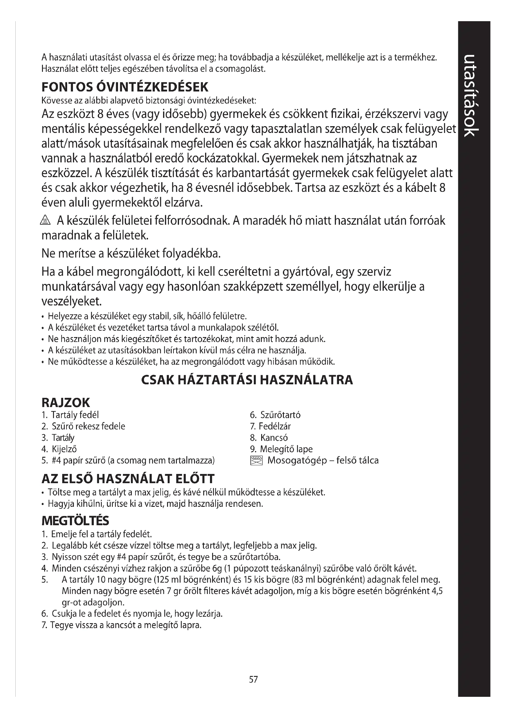 Kövesse az alábbi alapvető biztonsági óvintézkedéseket: Az eszközt 8 éves (vagy idősebb) gyermekek és csökkent fizikai, érzékszervi vagy mentális képességekkel rendelkező vagy tapasztalatlan személyek csak felügyelet alatt/mások utasításainak megfelelően és csak akkor használhatják, ha tisztában vannak a használatból eredő kockázatokkal. Gyermekek nem játszhatnak az eszközzel. A készülék tisztítását és karbantartását gyermekek csak felügyelet alatt és csak akkor végezhetik, ha 8 évesnél idősebbek. Tartsa az eszközt és a kábelt 8 éven aluli gyermekektől elzárva. h A készülék felületei felforrósodnak. A maradék hő miatt használat után forróak maradnak a felületek. Ne merítse a készüléket folyadékba. Ha a kábel megrongálódott, ki kell cseréltetni a gyártóval, egy szerviz munkatársával vagy egy hasonlóan szakképzett személlyel, hogy elkerülje a veszélyeket.