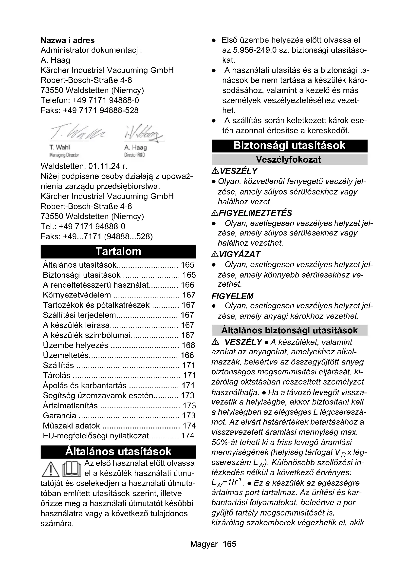 Długość kabla m 10Magyar 165 Nazwa i adres Administrator dokumentacji: A. Haag Kärcher Industrial Vacuuming GmbH Robert-Bosch-Straße 4-8 73550 Waldstetten (Niemcy) Telefon: +49 7171 94888-0 Faks: +49 7171 94888-528 Waldstetten, 01.11.24 r. Niżej podpisane osoby działają z upoważ- nienia zarządu przedsiębiorstwa. Kärcher Industrial Vacuuming GmbH Robert-Bosch-Straße 4-8 73550 Waldstetten (Niemcy) Tel.: +49 7171 94888-0 Faks: +49...7171 (94888...528) Tartalom Általános utasítások Az első használat előtt olvassa el a készülék használati útmu- tatóját és cselekedjen a használati útmuta- tóban említett utasítások szerint, illetve őrizze meg a használati útmutatót későbbi használatra vagy a következő tulajdonos számára. ● Első üzembe helyezés előtt olvassa el az 5.956-249.0 sz. biztonsági utasításo- kat. ● A használati utasítás és a biztonsági ta- nácsok be nem tartása a készülék káro- sodásához, valamint a kezelő és más személyek veszélyeztetéséhez vezet- het. ● A szállítás során keletkezett károk ese- tén azonnal értesítse a kereskedőt. Biztonsági utasítások Veszélyfokozat VESZÉLY ● Olyan, közvetlenül fenyegető veszély jel- zése, amely súlyos sérülésekhez vagy halálhoz vezet. 몇 FIGYELMEZTETÉS ● Olyan, esetlegesen veszélyes helyzet jel- zése, amely súlyos sérülésekhez vagy halálhoz vezethet. 몇 VIGYÁZAT ● Olyan, esetlegesen veszélyes helyzet jel- zése, amely könnyebb sérülésekhez ve- zethet. FIGYELEM ● Olyan, esetlegesen veszélyes helyzet jel- zése, amely anyagi károkhoz vezethet. Általános biztonsági utasítások VESZÉLY ● A készüléket, valamint azokat az anyagokat, amelyekhez alkal- mazzák, beleértve az összegyűjtött anyag biztonságos megsemmisítési eljárását, ki- zárólag oktatásban részesített személyzet használhatja. ● Ha a távozó levegőt vissza- vezetik a helyiségbe, akkor biztosítani kell a helyiségben az elégséges L légcsereszá- mot. Az elvárt határértékek betartásához a visszavezetett áramlási mennyiség max. 50%-át teheti ki a friss levegő áramlási mennyiségének (helyiség térfogat V