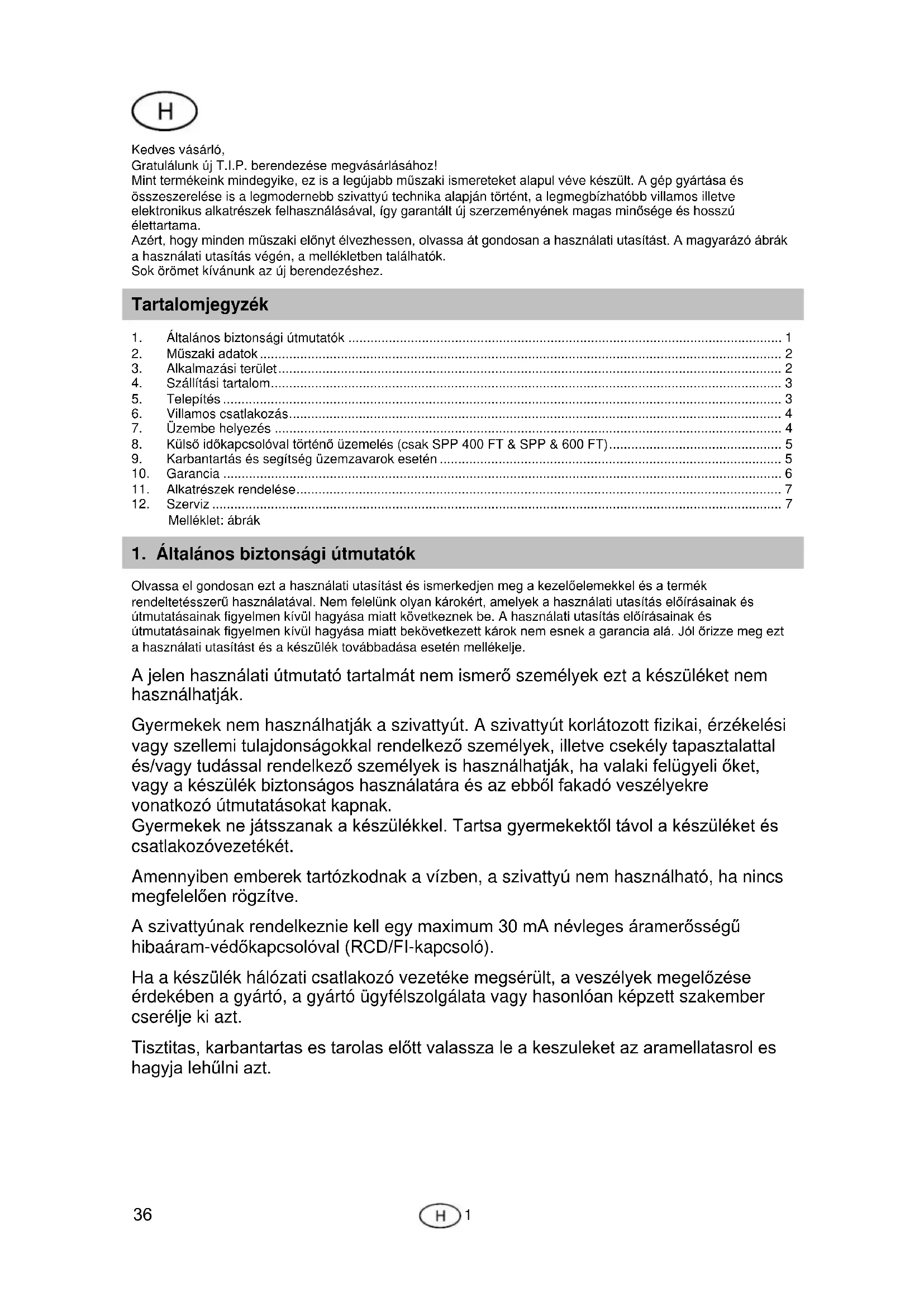 - Kedves vásárló, Gratulálunk új T.I.P. berendezése megvásárlásához! Mint termékeink mindegyike, ez is a legújabb műszaki ismereteket alapul véve készült. A gép gyártása és összeszerelése is a legmodernebb szivattyú technika alapján történt, a legmegbízhatóbb villamos illetve elektronikus alkatrészek felhasználásával, így garantált új szerzeményének magas minősége és hosszú élettartama. Azért, hogy minden műszaki előnyt élvezhessen, olvassa át gondosan a használati utasítást. A magyarázó ábrák a használati utasítás végén, a mellékletben találhatók. Sok örömet kívánunk az új berendezéshez. Tartalomjegyzék 1. Általános biztonsági útmutatók p. 1