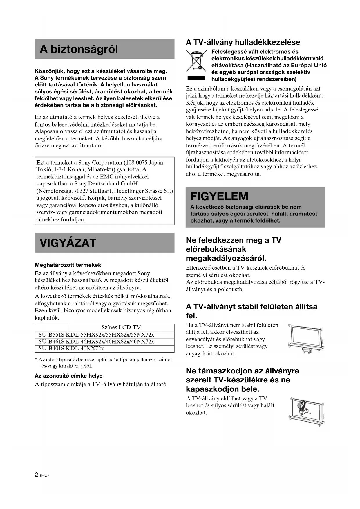 - Az adott típusnévben szereplő „x” a típusra jellemző számot és/vagy karaktert jelöl. Az azonosító címke helye A típusszám címkéje a TV -állvány hátulján található. A TV-állvány hulladékkezelése Feleslegessé vált elektromos és elektronikus készülékek hulladékként való eltávolítása (Használható az Európai Unió és egyéb európai országok szelektív hulladékgyűjtési rendszereiben) Ez a szimbólum a készüléken vagy a csomagolásán azt jelzi, hogy a terméket ne kezelje háztartási hulladékként. Kérjük, hogy az elektromos és elektronikai hulladék gyűjtésére kijelölt gyűjtőhelyen adja le. A feleslegessé vált termék helyes kezelésével segít megelőzni a környezet és az emberi egészség károsodását, mely bekövetkezhetne, ha nem követi a hulladékkezelés helyes módját. Az anyagok újrahasznosítása segít a természeti erőforrások megőrzésében. A termék újrahasznosítása érdekében további információért forduljon a lakhelyén az illetékesekhez, a helyi hulladékgyűjtő szolgáltatóhoz vagy ahhoz az üzlethez, ahol a terméket megvásárolta. Ne feledkezzen meg a TV előrebukásának megakadályozásáról. Ellenkező esetben a TV-készülék előrebukhat és személyi sérülést okozhat. Az előrebukás megakadályozása céljából rögzítse a TV- állványt és a polcot stb. A TV-állványt stabil felületen állítsa fel. Ha a TV-állványt nem stabil felületen állítja fel, akkor elvesztheti az egyensúlyát és előrebukhat vagy leeshet. Ez személyi sérülést vagy anyagi kárt okozhat. Ne támaszkodjon az állványra szerelt TV-készülékre és ne kapaszkodjon bele. A TV-állvány eldőlhet vagy a TV leeshet és súlyos sérülést vagy halált okozhat. A biztonságról Ezt a terméket a Sony Corporation (108-0075 Japán, Tokió, 1-7-1 Konan, Minato-ku) gyártotta. A termékbiztonsággal és az EMC irányelvekkel kapcsolatban a Sony Deutschland GmbH (Németország, 70327 Stuttgart, Hedelfinger Strasse 61.) a jogosult képviselő. Kérjük, bármely szervizeléssel vagy garanciával kapcsolatos ügyben, a különálló szerviz- vagy garanciadokumentumokban megadott címekhez forduljon. VIGYÁZAT Színes LCD TV SU-B551S KDL-55HX92x/55HX82x/55NX72x SU-B461S KDL-46HX92x/46HX82x/46NX72x SU-B401S KDL-40NX72x FIGYELEM A következő biztonsági előírások be nem tartása súlyos égési sérülést, halált, áramütést okozhat, vagy a termék feldőlhet.3 (HU) Ne fedje el a TV-készülék szellőzőnyílásait. A TV szellőzőnyílásai a TV megbízható működése és túlmelegedés elleni védelme érdekében szükségesek.