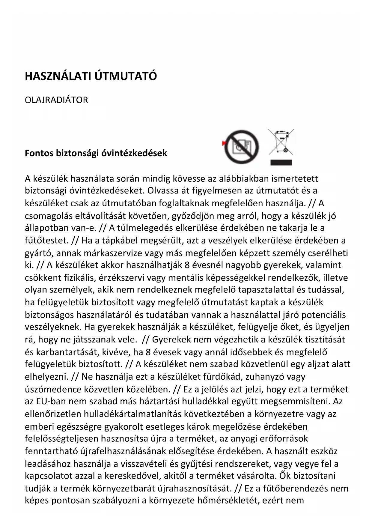OLAJRADIÁTOR Fontos biztonsági óvintézkedések A készülék használata során mindig kövesse az alábbiakban ismertetett biztonsági óvintézkedéseket. Olvassa át figyelmesen az útmutatót és a készüléket csak az útmutatóban foglaltaknak megfelelően használja. // A csomagolás eltávolítását követően, győződjön meg arról, hogy a készülék jó állapotban van-e. // A túlmelegedés elkerülése érdekében ne takarja le a fűtőtestet. // Ha a tápkábel megsérült, azt a veszélyek elkerülése érdekében a gyártó, annak márkaszervize vagy más megfelelően képzett személy cserélheti ki. // A készüléket akkor használhatják 8 évesnél nagyobb gyerekek, valamint csökkent fizikális, érzékszervi vagy mentális képességekkel rendelkezők, illetve olyan személyek, akik nem rendelkeznek megfelelő tapasztalattal és tudással, ha felügyeletük biztosított vagy megfelelő útmutatást kaptak a készülék biztonságos használatáról és tudatában vannak a használattal járó potenciális veszélyeknek. Ha gyerekek használják a készüléket, felügyelje őket, és ügyeljen rá, hogy ne játsszanak vele. // Gyerekek nem végezhetik a készülék tisztítását és karbantartását, kivéve, ha 8 évesek vagy annál idősebbek és megfelelő felügyeletük biztosított. // A készüléket nem szabad közvetlenül egy aljzat alatt elhelyezni. // Ne használja ezt a készüléket fürdőkád, zuhanyzó vagy úszómedence közvetlen közelében. // Ez a jelölés azt jelzi, hogy ezt a terméket az EU-ban nem szabad más háztartási hulladékkal együtt megsemmisíteni. Az ellenőrizetlen hulladékártalmatlanítás következtében a környezetre vagy az emberi egészségre gyakorolt esetleges károk megelőzése érdekében felelősségteljesen hasznosítsa újra a terméket, az anyagi erőforrások fenntartható újrafelhasználásának elősegítése érdekében. A használt eszköz leadásához használja a visszavételi és gyűjtési rendszereket, vagy vegye fel a kapcsolatot azzal a kereskedővel, akitől a terméket vásárolta. Ők biztosítani tudják a termék környezetbarát újrahasznosítását. // Ez a fűtőberendezés nem képes pontosan szabályozni a környezete hőmérsékletét, ezért nemhasználható tárolóhelyek, tárgyak, állatok és növények szigetelésére szolgáló eszközként. // A radiátor pontos mennyiségű speciális olajjal van feltöltve. Az olajtartály kinyitását igénylő javításokat csak a gyártó vagy annak márkaszervize végezheti el, akivel olajszivárgás esetén kell kapcsolatba lépni. A készülék selejtezésénél tartsa be az olaj ártalmatlanítására vonatkozó előírásokat. // 10. Ez a fűtőberendezés nem képes pontosan szabályozni a környezete hőmérsékletét, ezért nem használható tárolóhelyek, tárgyak, állatok és növények szigetelésére szolgáló eszközként. // A készülék kizárólag háztartásban való használatra készült. Figyelem Ha a fűtőtestet függöny vagy más éghető anyag közelében helyezik el, vagy ilyennel takarják le, fennáll a tűzveszély kockázata. // A termék egyes részei nagyon felforrósodhatnak és égési sérüléseket okozhatnak. Különös figyelmet kell fordítani erre, ahol gyerekek és kiszolgáltatott személyek vannak jelen.RÉSZ ÁBRA (OR2000M) Bordák Főkapcsoló gomb Termosztát gomb Kábel burkolat Görgők