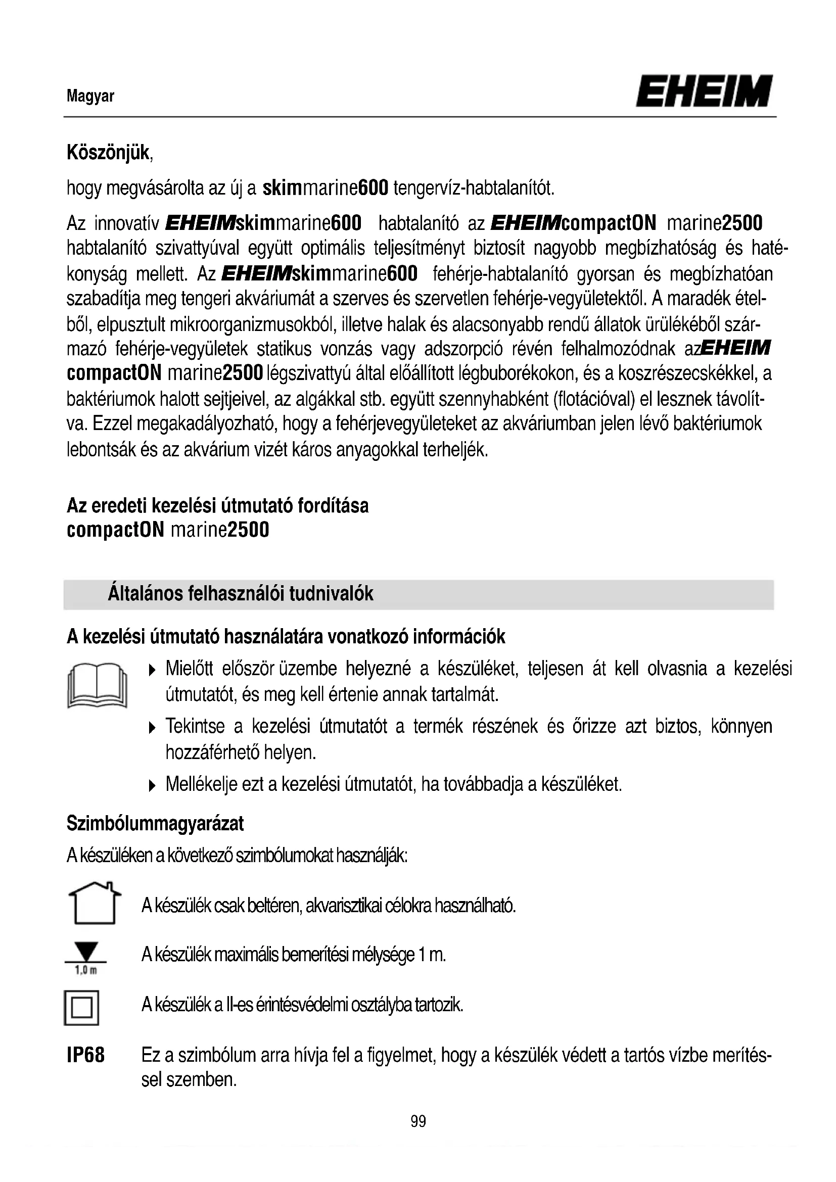 Přísun vzduchu 300 - 540 l/h Korpus ø 16 cm Plocha na postavení mm 190 x 160 Hladina vody mm 180 - 240 Rozměry D x Š x V cm 19 x 19 x 52,5 98Köszönjük, hogy megvásárolta az új a skimmarine600 tengervíz-habtalanítót. Az innovatív EHEIM skimmarine600 habtalanító az EHEIM compactON marine2500 habtalanító szivattyúval együtt optimális teljesítményt biztosít nagyobb megbízhatóság és haté- konyság mellett. Az EHEIM skimmarine600 fehérje-habtalanító gyorsan és megbízhatóan szabadítja meg tengeri akváriumát a szerves és szervetlen fehérje-vegyületektől. A maradék étel- ből, elpusztult mikroorganizmusokból, illetve halak és alacsonyabb rendű állatok ürülékéből szár- mazó fehérje-vegyületek statikus vonzás vagy adszorpció révén felhalmozódnak az EHEIM compactON marine2500 légszivattyú által előállított légbuborékokon, és a koszrészecskékkel, a baktériumok halott sejtjeivel, az algákkal stb. együtt szennyhabként (flotációval) el lesznek távolít- va. Ezzel megakadályozható, hogy a fehérjevegyületeket az akváriumban jelen lévő baktériumok lebontsák és az akvárium vizét káros anyagokkal terheljék. Magyar Általános felhasználói tudnivalók A kezelési útmutató használatára vonatkozó információk