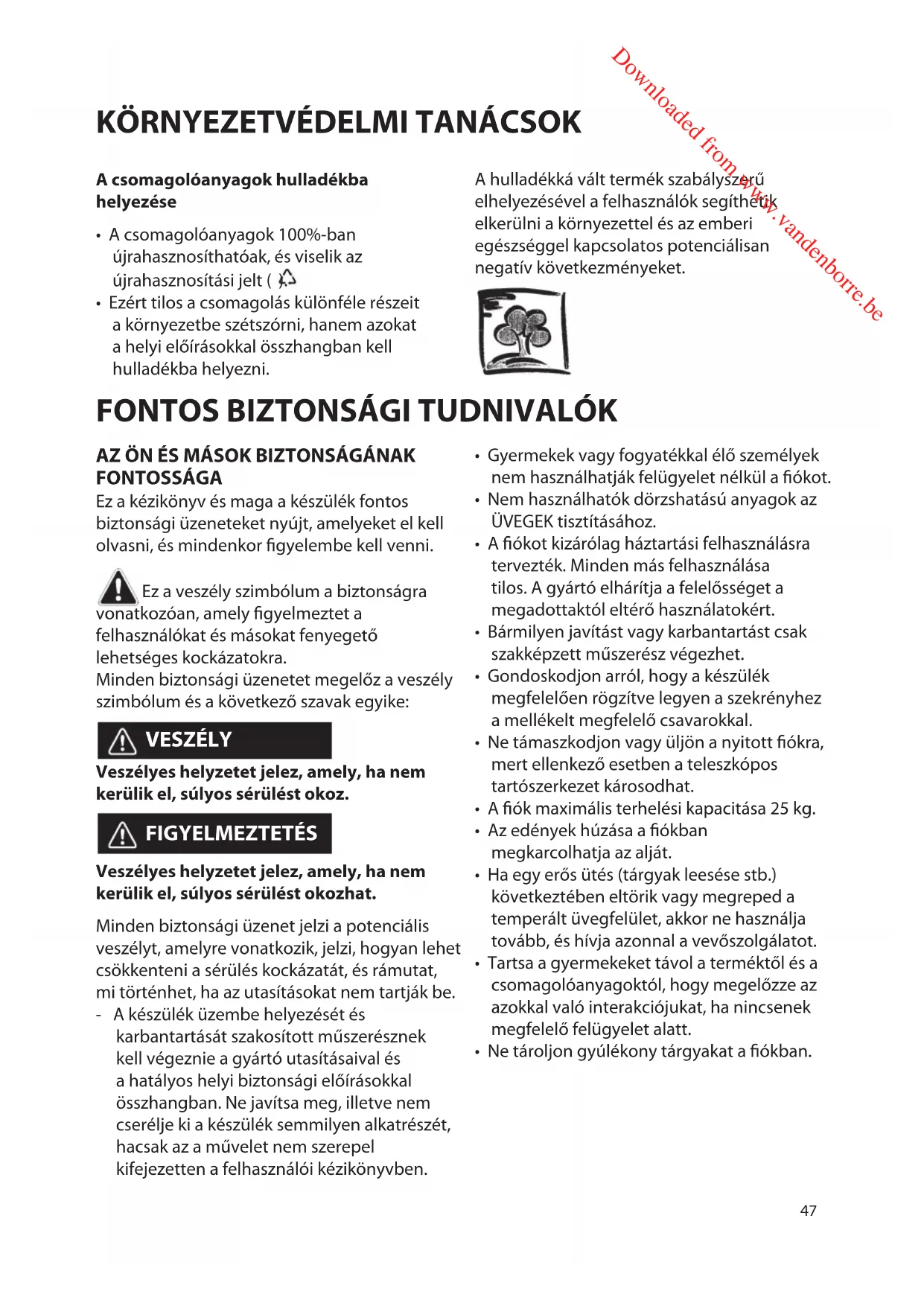 - Ezért tilos a csomagolás különféle részeit a környezetbe szétszórni, hanem azokat a helyi előírásokkal összhangban kell hulladékba helyezni. A hulladékká vált termék szabályszerű elhelyezésével a felhasználók segíthetik elkerülni a környezettel és az emberi egészséggel kapcsolatos potenciálisan negatív következményeket. Downloaded from www.vandenborre.be48 A FIÓK HASZNÁLATA ELŐTT A ók nyitásához és zárásához nyomja meg a panel közepét az ábrán látható módon. Az első használatkor tisztítsa meg a készüléket a következők szerint: - nedves ruhával tisztítsa meg, majd törölje szárazra a felületet. - Ezen művelet végrehajtása után a készülék készen áll az első használatra.