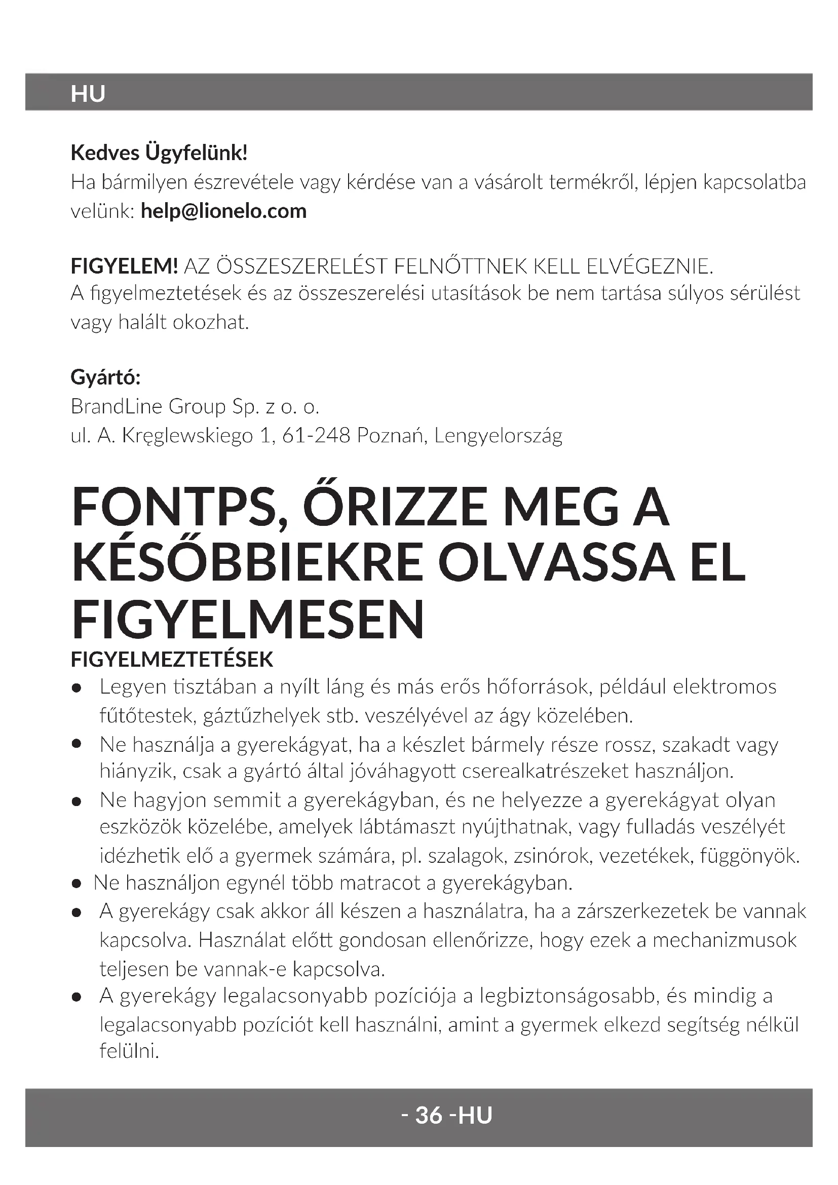 Az összehajto ágyat burkolja be a matraccal, és rögzítse tépőzárakkal. Helyezze az összehajto gyerekágyat a táskába (lásd a 10. ábrát). Ha a szerelés nem sikerül, ismételje meg az egész folyamatot, egészen az összehajtásig Tisztás A terméket nedves ruhával törölje át, majd hagyja megszáradni. Vegyileg ne sztsa. és ne használjon agresszív szereket. Ne szárítsa szárítógépben, ne vasalja. A terméket tesztelték, és megfelel az alábbi szabványok követelményeinek: EN 716-1:2017+AC:2019. A használa utasításban felhasznált képek tájékoztató jellegűek eltérhetnek a termék valóságos állapotától.‑ 39 ‑ RO Smate Client! Dacă aveți observații sau întrebări cu privire la produsul achiziționat, vă rugăm să ne contactați: help@lionelo.com NOTĂ! MONTAREA TREBUIE REALIZATĂ DE CĂTRE O PERSOANĂ ADULTĂ. Nerespectarea acestor aversmente și instrucțiuni de montare poate duce la răniri grave sau la deces. Producător BrandLine Group Sp. z o. o. ul. A. Kręglewskiego 1, 61-248 Poznań, Polonia