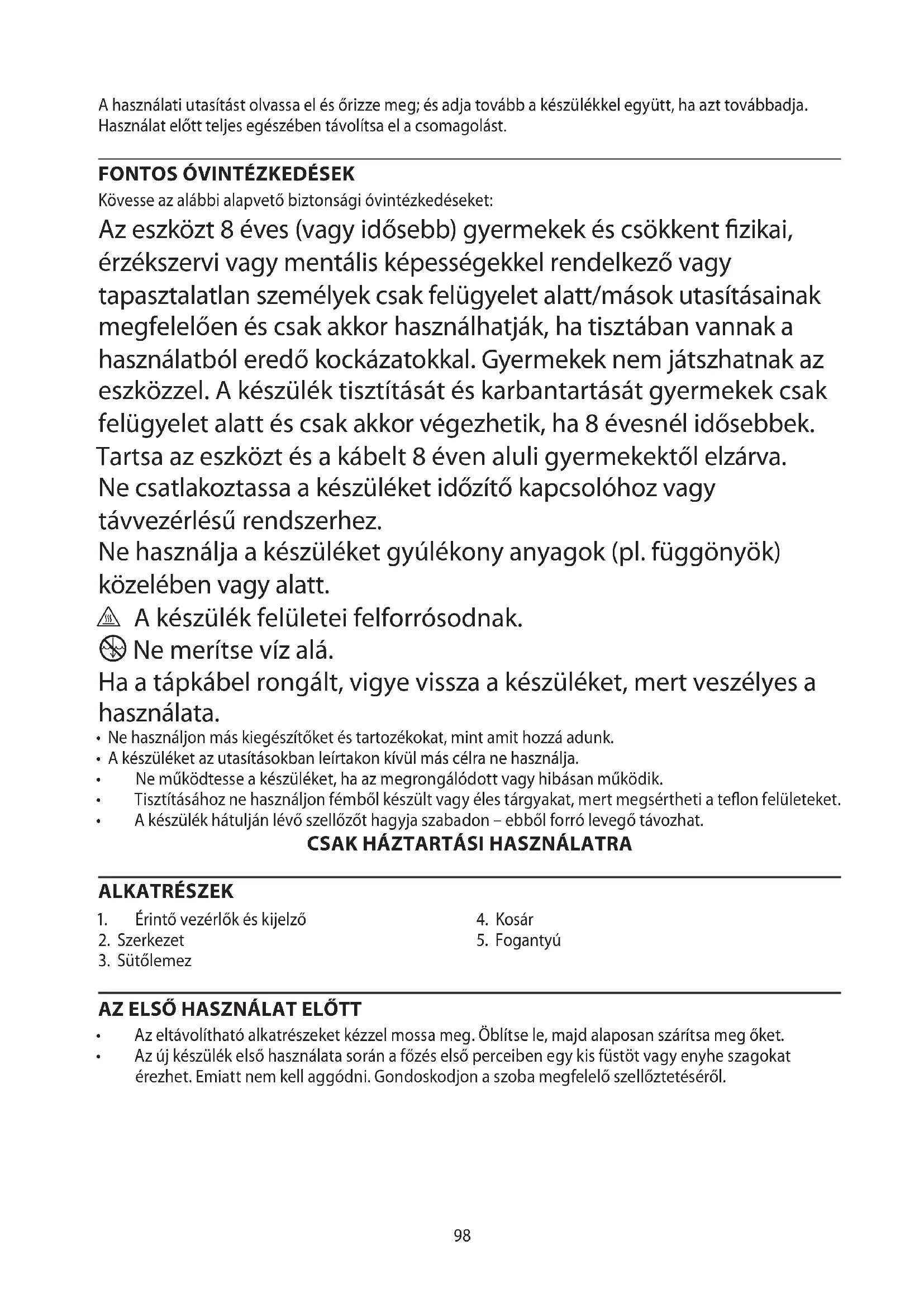 - Az új készülék első használata során a főzés első perceiben egy kis füstöt vagy enyhe szagokat érezhet. Emiatt nem kell aggódni. Gondoskodjon a szoba megfelelő szellőztetéséről.99