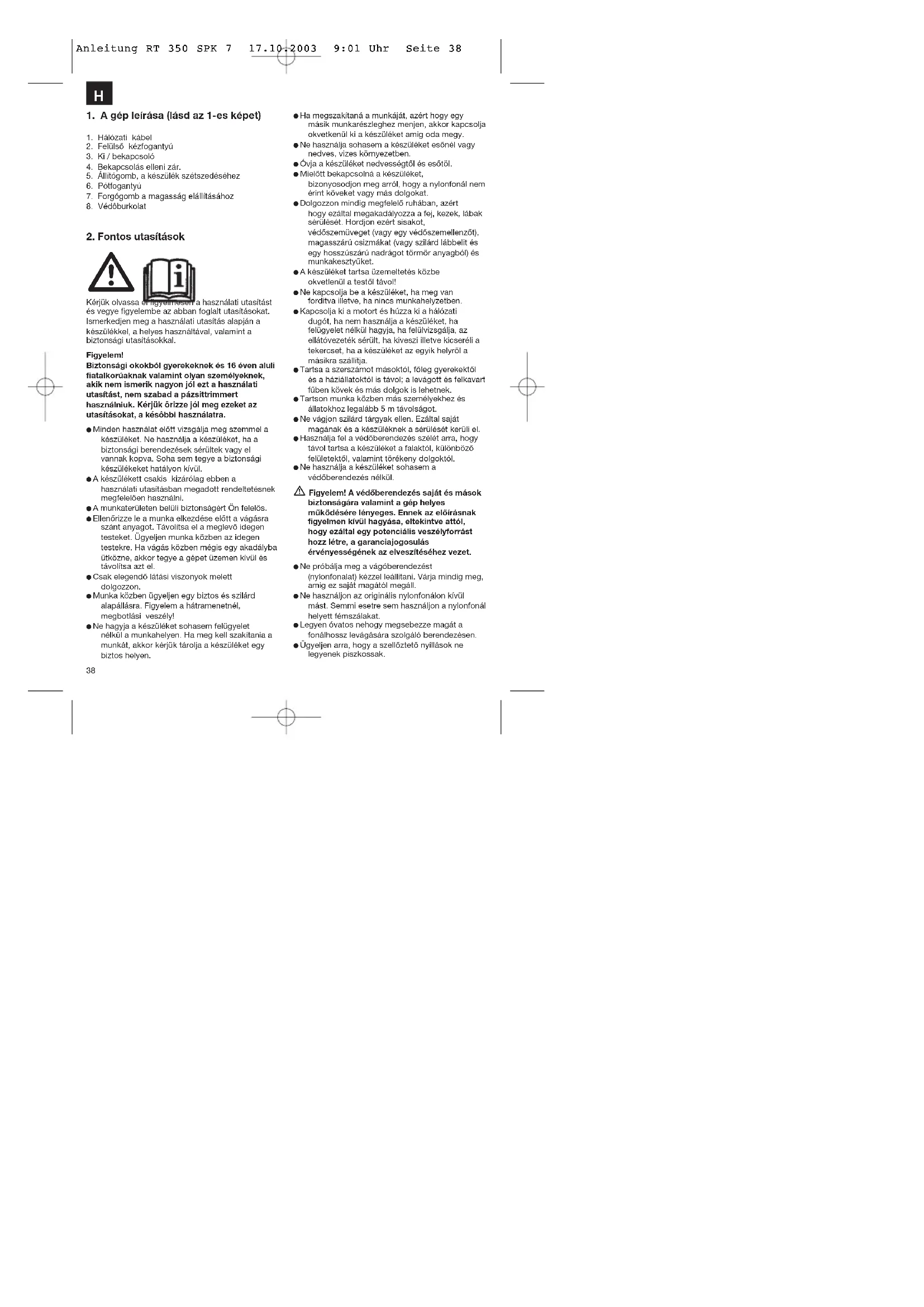 Anleitung RT 350 SPK 7 17.10.2003 9:01 Uhr Seite 3839 Húzza ki használat után a hálózati dugót és vizsgálja meg a gépet sérülésekre. Ne próbáljon a készülékkel olyan füveket vágni amelyek nem a talajon nőnek; például ne próbálja meg, olyan füveknek a vágását amelyek falakon vagy köveken stb. nőnek. A pázsittrimmer munkaterületén belül harmadikkal szembeni károkért, amelyek a szerszám használat által keletkeznek, a használó felelős. Ne menjen bekapcsolt készülékkel útcán vagy kavicsos úton át. Ha nem használja a készüléket, akkor tárolja egy száraz, biztos és a gyerekek számára elérhetetlen helyen. A készüléket csak a használati utasításban leírottak szerint használni és a talajhoz mindig függőlegessen tartani. Minden más féle tartás veszélyes. Vizsgálja rendszeressen felül, hogy a csavarok rendessen meg vannak e húzva. A hálózati feszültségnek meg kell egyeznie az adattáblán megadott feszültséggel. A csatlakozóvezetéket, sérülési és öregedési jelekre, rendszeressen felül kell vizsgálni. A készüléket nem szabad használni, ha a csatlakozóvezeték állapota nem kifogástalan. A felhasznált csatlakozóvezetékeknek nem szabad a HO7RN-F a DIN 57282/VDE 0282 szerinti könnyű gumitömlővezetékektől könnyebbnek lenniük és legalább 1,5 mm2 -es átmérőjűnek kell lenniük. A dugós csatlakozóknak védőérintkezősöknek és a csatlakoztatásnak fröccsenővíz védetenk kell lennie. A vágásra előrelátott felületet a kábeltől és más tárgyaktól mindig szabadon tartani. Ha a szállításhoz fel kell emelni a készüléket, akkor ki kell kapcsolni a motort és meg kell várni amig a szerszám nyugalmi állapotban nincs. A készülék elhagyása előtt nyugalomba kell helyezni a motort és ki kell húzni a hálózati dugót. Mielőtt rákapcsolná a készüléket az áramhálózatra, bizonyosodjon meg arról, hogy a forgó egységek közül egyik sincs megsérülve és a fonálgombolyag rendessen be van téve és oda van erősítve. Az üzemeltetés ideje alatt semmilyen esetre sem szabad kemény tárgyak ellen vágni, mivel csak így tudja a kezelő megsérülését és a készüléken a károk keletkezését elkerülni. A karbantartáshoz csakis originális - pótalkatrészeket használni. Javításokat csak egy villamossági szakember végezhet. A gép üzembe vétele előtt valamint minden fajta nekiütődés után, vizsgálja meg a készüléket kopás vagy károsodás jeleire, és vitesse véghez a szükséges javításokat. Tartsa kezeit és a lábait a vágóberendezéstől mindig távol, főleg akkor, amikor a motort bekapcsolja. Egy új fonál kihúzása után, tartsa a gépet a bekapcsolás előtt mindig a normális használati állásába. Ne használjon sohasem oljan pótalkatrészeket vagy tartozékokat, amelyeket a gyártó nem látott előre vagy nem ajánlott. Vizsgálatok, tisztítások vagy a gépen történő munkák előtt húzza mindig ki a hálózati dugót, és ha nem használja a gépet. Figyelem: a leállítás után a nylonszál még egy pár másodpercet utánfut!