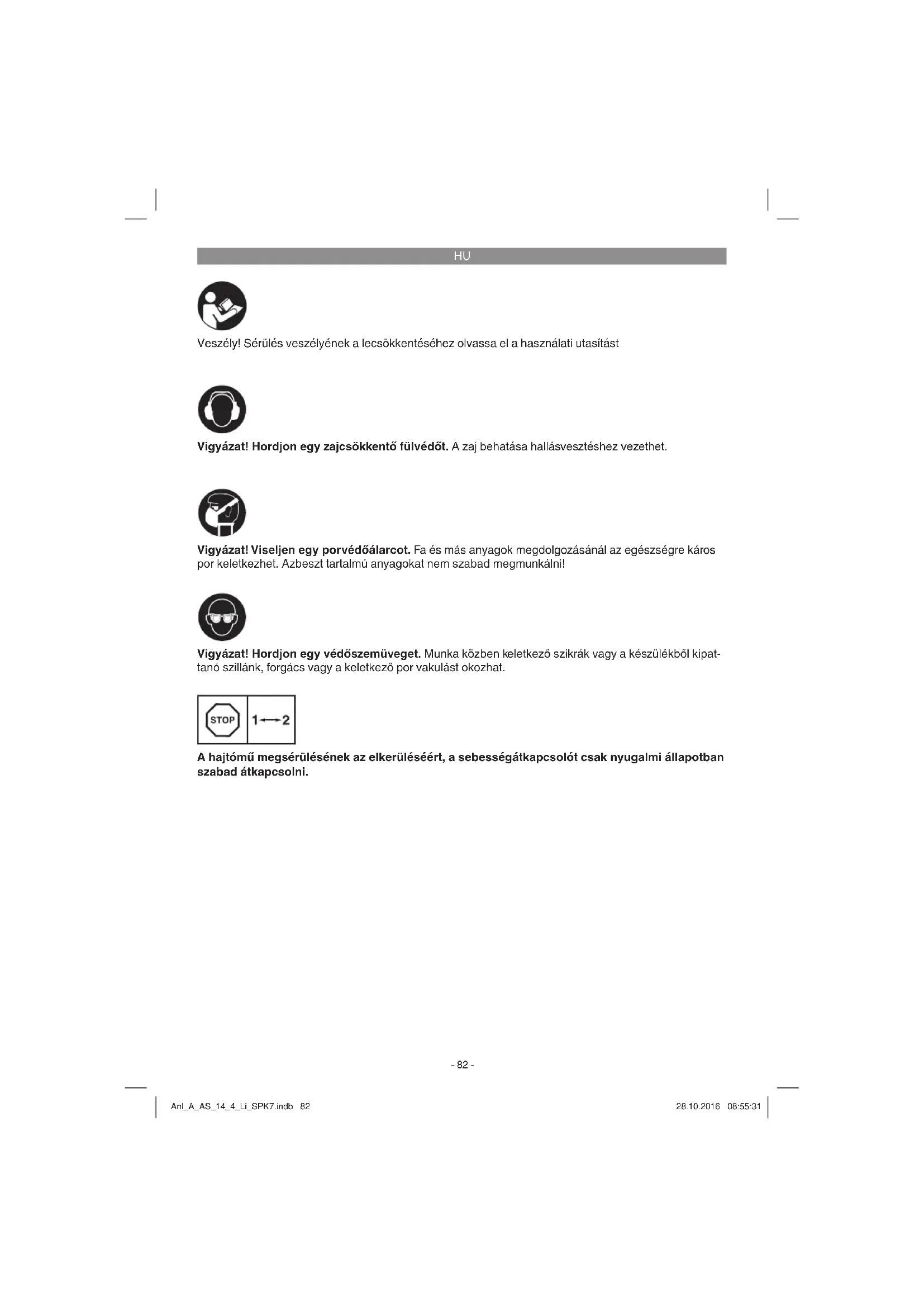 Veszély! Sérülés veszélyének a lecsökkentéséhez olvassa el a használati utasítást Vigyázat! Hordjon egy zajcsökkentő fülvédőt. A zaj behatása hallásvesztéshez vezethet. Vigyázat! Hordjon egy védőszemüveget. Munka közben keletkező szikrák vagy a készülékből kipat- tanó szillánk, forgács vagy a keletkező por vakulást okozhat. Vigyázat! Viseljen egy porvédőálarcot. Fa és más anyagok megdolgozásánál az egészségre káros por keletkezhet. Azbeszt tartalmú anyagokat nem szabad megmunkálni! A hajtómű megsérülésének az elkerüléséért, a sebességátkapcsolót csak nyugalmi állapotban szabad átkapcsolni. Anl_A_AS_14_4_Li_SPK7.indb 82Anl_A_AS_14_4_Li_SPK7.indb 82 28.10.2016 08:55:3128.10.2016 08:55:31HU