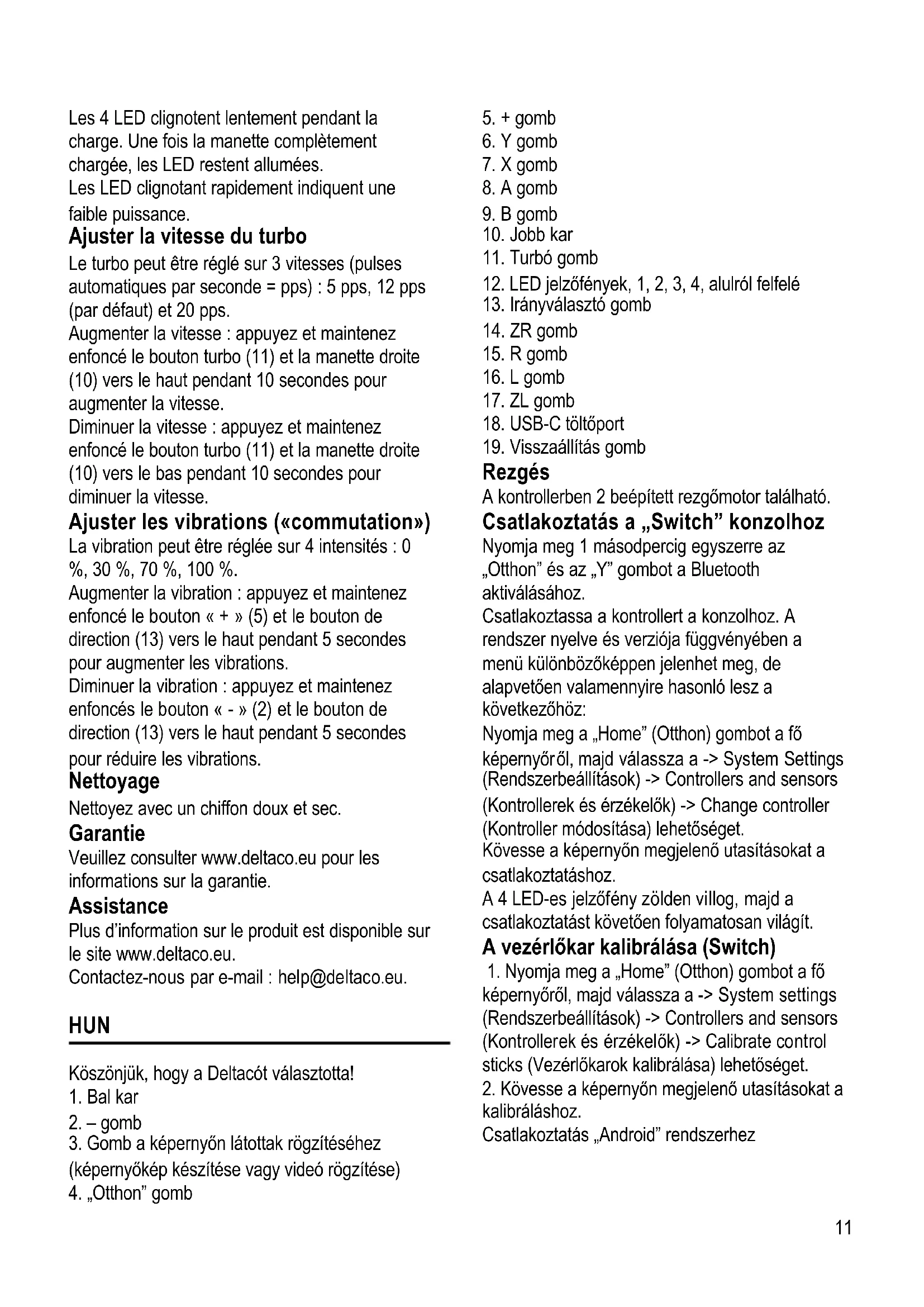 után automatikusan alvó üzemmódba lép. Újracsatlakoztatás A kontroller aktiválásához és újracsatlakoztatásához nyomja meg 1 másodpercig a „Home” (Otthon) gombot. A kontroller alvó üzemmódban marad, ha 10 másodpercen belül nem tud csatlakozni. Töltés A töltéshez: Csatlakoztasson egy USB-kábelt a kontrollerhez és egy USB-s tápellátáshoz. Például egy USB-s elektromos adapterhez vagy egy számítógéphez. A 4 LED töltés közben lassan villog. A kontroller teljes feltöltése után a LED-ek folyamatosan világítanak. A villogó LED-es jelzőfények alacsony akkumulátortöltöttséget jeleznek. A turbó sebesség módosítása A turbó sebesség (automatikus lenyomás másodpercenként [Press Per Second] = pps) 3 eltérő fokozatba állítható: 5 pps, 12 pps (alapértelmezett) és 20 pps. Sebesség növelése: Nyomja meg hosszan a turbó gombot (11) + tolja a jobb kart felfelé (10) 10 másodpercig a sebesség növeléséhez. Sebesség csökkentése: Nyomja meg hosszan a turbó gombot (11) + tolja a jobb kart lefelé (10) 10 másodpercig a sebesség csökkentéséhez. A rezgés módosítása („Switch”) A rezgés erőssége 4 eltérő fokozatba állítható: 0%, 30%, 70%, 100%. Rezgés növelése: Nyomja meg hosszan a „+” gombot (5), az irányválasztón (13) pedig 5 másodpercig a felfelé gombot a rezgés növeléséhez. Rezgés csökkentése: Nyomja meg hosszan a „-” gombot (2), az irányválasztón (13) pedig 5 másodpercig a felfelé gombot rezgés csökkentéséhez. Tisztítás Puha, száraz ruhával tisztítsa. Garancia A garanciális információkat lásd a www.deltaco.eu webhelyen. Támogatás A www.deltaco.eu webhelyen további információkat talál a termékről. A következő e-mail címen keresztül léphet velünk kapcsolatba: help@deltaco.eu.13 LAV Paldies, ka izvēlējāties Deltaco!
