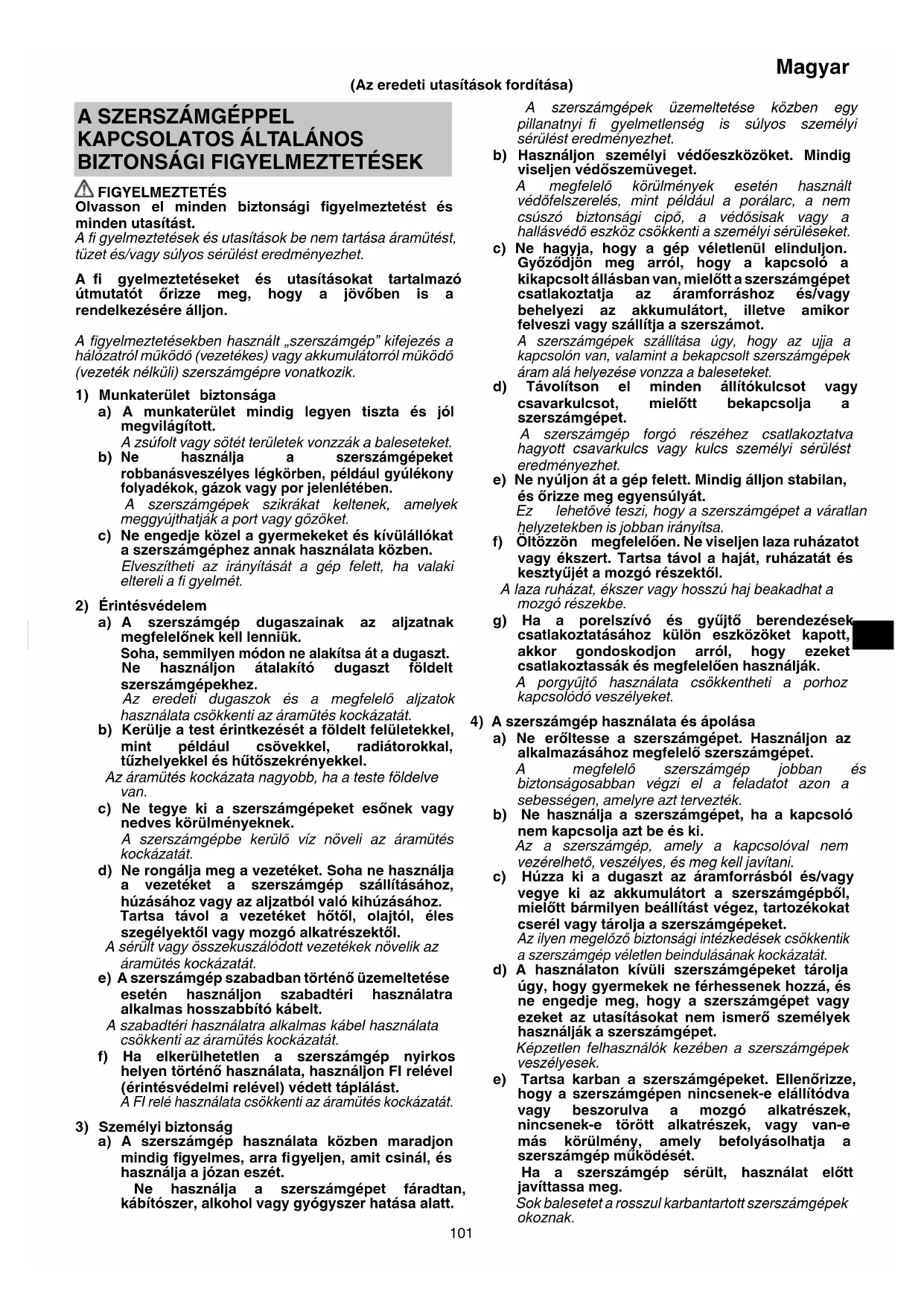 | Biztons e1g | Haszn e1ljon v e9d51szem fcs f6veget e9s keszty71t. Ne haszn e1lja az eszk f6zt nedves k f6rnyezetben. Tartsa be a gy e1rt f3 biztons e1gi el f5 edr e1sait. |