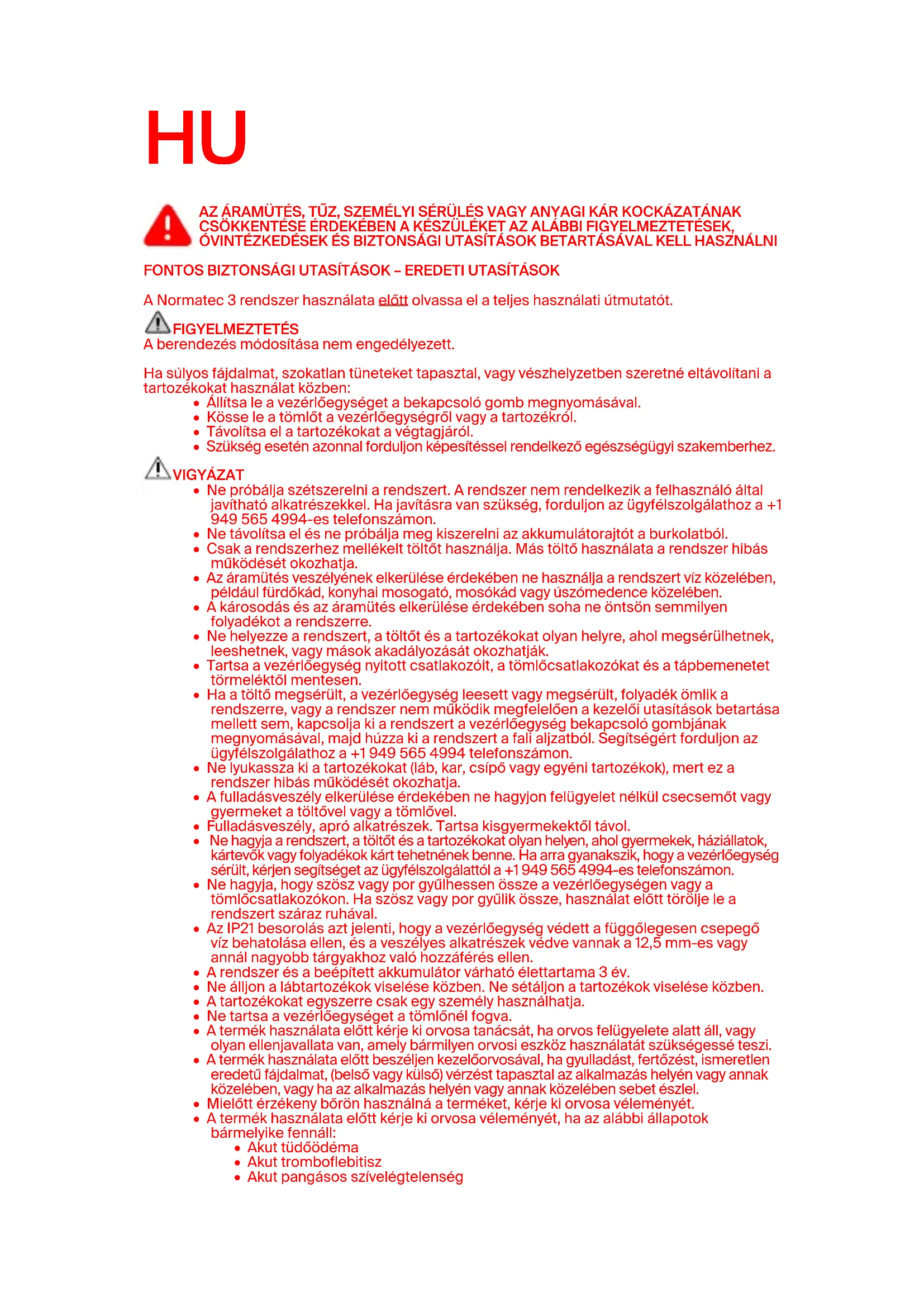 - Tvrtka Hyperice nije odgovorna za izgubljene ili oštećene predmete tijekom transporta.AZ ÁRAMÜTÉS, TŰZ, SZEMÉLYI SÉRÜLÉS VAGY ANYAGI KÁR KOCKÁZATÁNAK CSÖKKENTÉSE ÉRDEKÉBEN A KÉSZÜLÉKET AZ ALÁBBI FIGYELMEZTETÉSEK, ÓVINTÉZKEDÉSEK ÉS BIZTONSÁGI UTASÍTÁSOK BETARTÁSÁVAL KELL HASZNÁLNI FONTOS BIZTONSÁGI UTASÍTÁSOK – EREDETI UTASÍTÁSOK A Normatec 3 rendszer használata előtt olvassa el a teljes használati útmutatót. FIGYELMEZTETÉS A berendezés módosítása nem engedélyezett. Ha súlyos fájdalmat, szokatlan tüneteket tapasztal, vagy vészhelyzetben szeretné eltávolítani a tartozékokat használat közben: