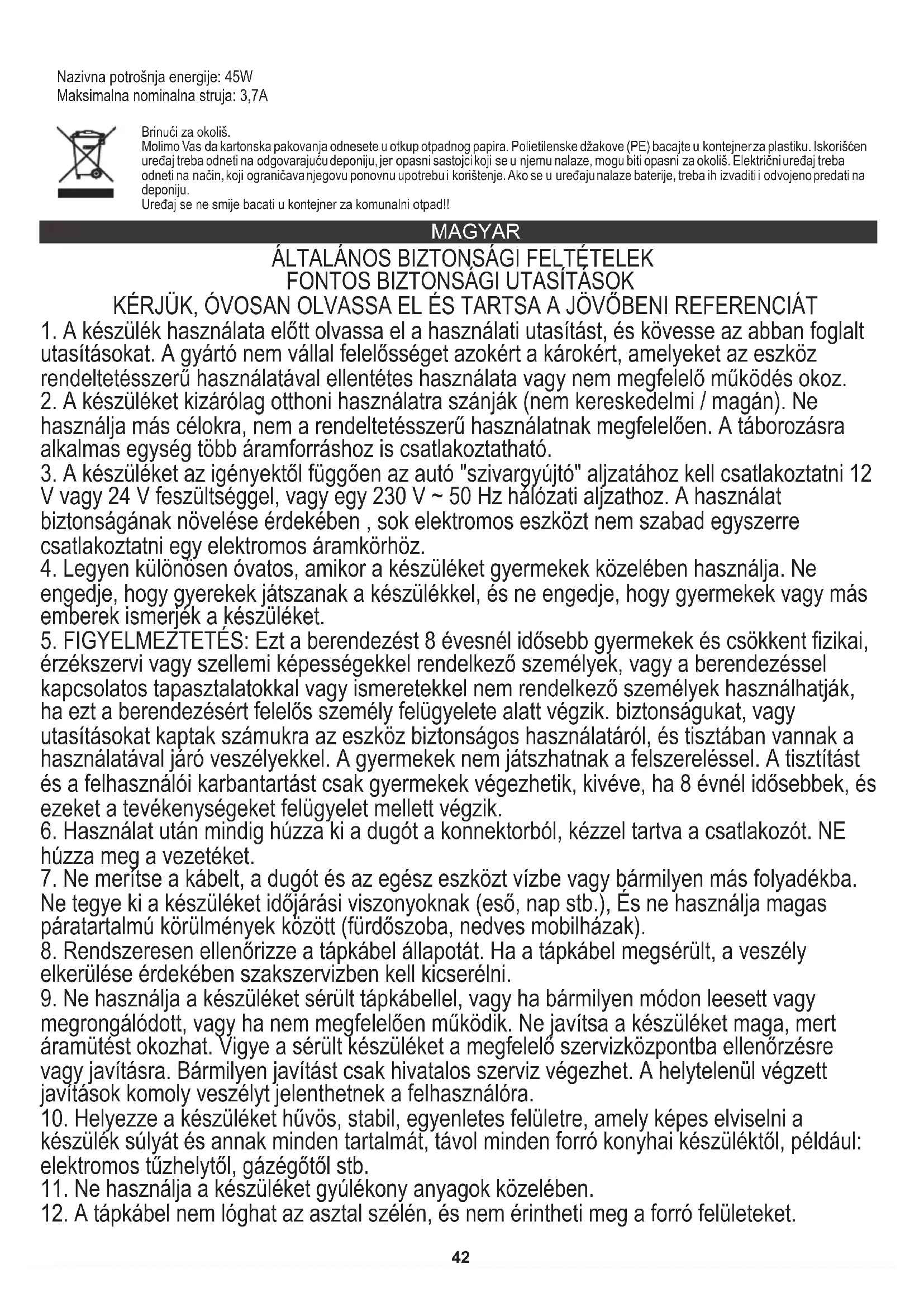 7. Ne merítse a kábelt, a dugót és az egész eszközt vízbe vagy bármilyen más folyadékba.