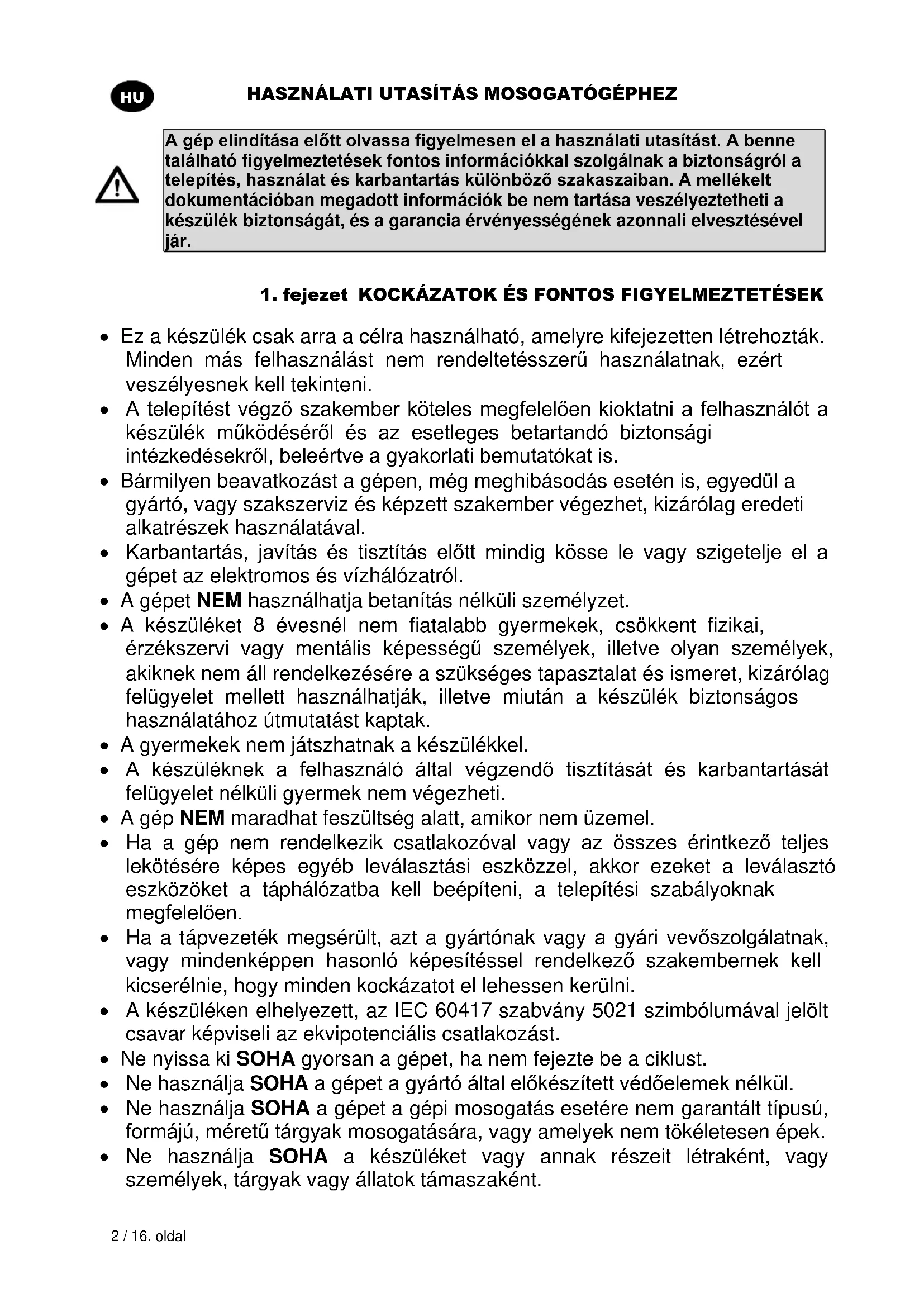 A gép elindítása előtt olvassa figyelmesen el a használati utasítást. A benne található figyelmeztetések fontos információkkal szolgálnak a biztonságról a telepítés, használat és karbantartás különböző szakaszaiban. A mellékelt dokumentációban megadott információk be nem tartása veszélyeztetheti a készülék biztonságát, és a garancia érvényességének azonnali elvesztésével jár.