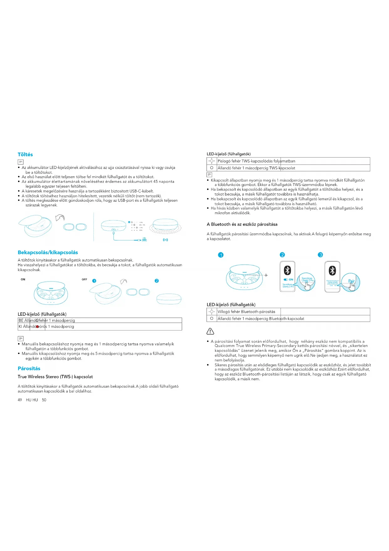 - Sikeres párosítás után az elsődleges fülhallgató kapcsolódik az eszközhöz, és jelet továbbít a másodlagos fülhallgatónak. Ez utóbbi nem kapcsolódik az eszközhöz.Ezért előfordulhat, hogy az eszköz Bluetooth-párosítási listáján az látszik, hogy csak az egyik fülhallgató kapcsolódik, a másik nem.51 HU HU 52 Egy másik Bluetooth-eszközzel való párosításhoz helyezze vissza a fülhallgatókat a töltőtokba. Győződjön meg róla, hogy töltés alatt állnak, miközben a tok fedele nyitva van, majd nyomja meg és 3 másodpercig tartsa nyomva a töltőtokon lévő gombot.Ekkor a jobb oldali fülhallgatón lévő LED-kijelző villogni kezd.