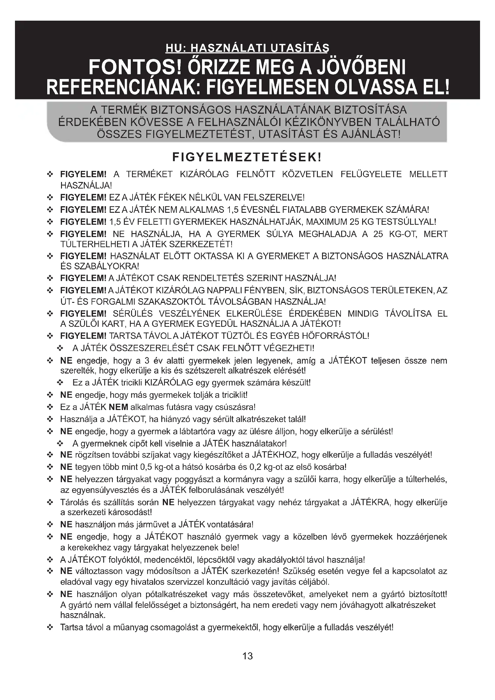 FONTOS! ŐRIZZE MEG A JÖVŐBENI REFERENCIÁNAK: FIGYELMESEN OLVASSA EL! FIGYELMEZTETÉSEK! FIGYELEM! A TERMÉKET KIZÁRÓLAG FELNŐTT KÖZVETLEN FELÜGYELETE MELLETT HASZNÁLJA! FIGYELEM! EZ A JÁTÉK FÉKEK NÉLKÜL VAN FELSZERELVE! FIGYELEM! EZ A JÁTÉK NEM ALKALMAS 1,5 ÉVESNÉL FIATALABB GYERMEKEK SZÁMÁRA! FIGYELEM! 1,5 ÉV FELETTI GYERMEKEK HASZNÁLHATJÁK, MAXIMUM 25 KG TESTSÚLLYAL! FIGYELEM! NE HASZNÁLJA, HA A GYERMEK SÚLYA MEGHALADJA A 25 KG-OT, MERT TÚLTERHELHETI A JÁTÉK SZERKEZETÉT! FIGYELEM! HASZNÁLAT ELŐTT OKTASSA KI A GYERMEKET A BIZTONSÁGOS HASZNÁLATRA ÉS SZABÁLYOKRA! FIGYELEM! A JÁTÉKOT CSAK RENDELTETÉS SZERINT HASZNÁLJA! FIGYELEM! A JÁTÉKOT KIZÁRÓLAG NAPPALI FÉNYBEN, SÍK, BIZTONSÁGOS TERÜLETEKEN, AZ ÚT- ÉS FORGALMI SZAKASZOKTÓL TÁVOLSÁGBAN HASZNÁLJA! FIGYELEM! SÉRÜLÉS VESZÉLYÉNEK ELKERÜLÉSE ÉRDEKÉBEN MINDIG TÁVOLÍTSA EL A SZÜLŐI KART, HA A GYERMEK EGYEDÜL HASZNÁLJA A JÁTÉKOT! FIGYELEM! TARTSA TÁVOL A JÁTÉKOT TÜZTŐL ÉS EGYÉB HŐFORRÁSTÓL! A JÁTÉK ÖSSZESZERELÉSÉT CSAK FELNŐTT VÉGEZHETI! NE engedje, hogy a 3 év alatti gyermekek jelen legyenek, amíg a JÁTÉKOT teljesen össze nem szerelték, hogy elkerülje a kis és szétszerelt alkatrészek elérését! Ez a JÁTÉK tricikli KIZÁRÓLAG egy gyermek számára készült! NE engedje, hogy más gyermekek tolják a triciklit! Ez a JÁTÉK NEM alkalmas futásra vagy csúszásra! Használja a JÁTÉKOT, ha hiányzó vagy sérült alkatrészeket talál! NE engedje, hogy a gyermek a lábtartóra vagy az ülésre álljon, hogy elkerülje a sérülést! A gyermeknek cipőt kell viselnie a JÁTÉK használatakor! NE rögzítsen további szíjakat vagy kiegészítőket a JÁTÉKHOZ, hogy elkerülje a fulladás veszélyét! NE tegyen több mint 0,5 kg-ot a hátsó kosárba és 0,2 kg-ot az első kosárba! NE helyezzen tárgyakat vagy poggyászt a kormányra vagy a szülői karra, hogy elkerülje a túlterhelés, az egyensúlyvesztés és a JÁTÉK felborulásának veszélyét! Tárolás és szállítás során NE helyezzen tárgyakat vagy nehéz tárgyakat a JÁTÉKRA, hogy elkerülje a szerkezeti károsodást! NE használjon más járművet a JÁTÉK vontatására! NE engedje, hogy a JÁTÉKOT használó gyermek vagy a közelben lévő gyermekek hozzáérjenek a kerekekhez vagy tárgyakat helyezzenek bele! A JÁTÉKOT folyóktól, medencéktől, lépcsőktől vagy akadályoktól távol használja! NE változtasson vagy módosítson a JÁTÉK szerkezetén! Szükség esetén vegye fel a kapcsolatot az eladóval vagy egy hivatalos szervizzel konzultáció vagy javítás céljából. NE használjon olyan pótalkatrészeket vagy más összetevőket, amelyeket nem a gyártó biztosított! A gyártó nem vállal felelősséget a biztonságért, ha nem eredeti vagy nem jóváhagyott alkatrészeket használnak. Tartsa távol a műanyag csomagolást a gyermekektől, hogy elkerülje a fulladás veszélyét!