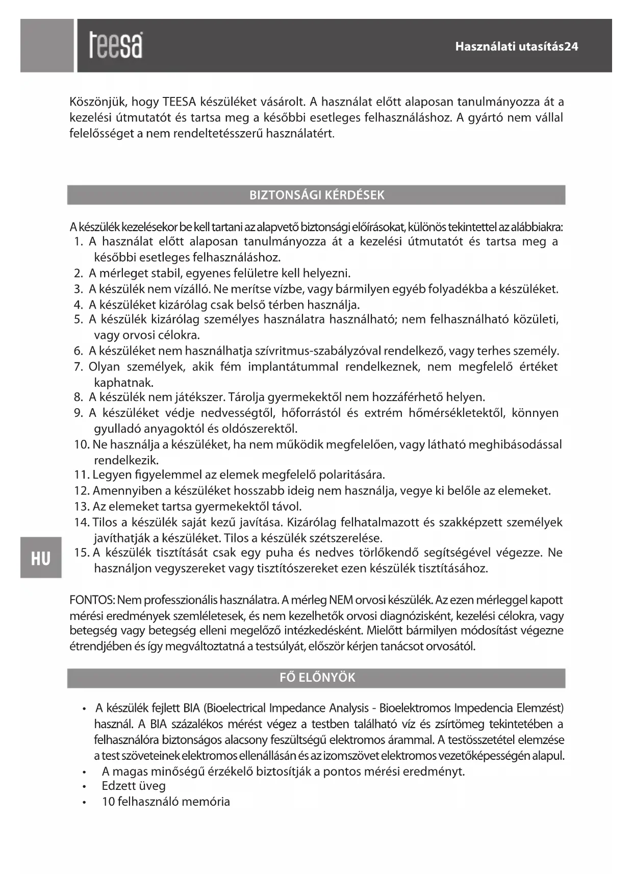 érték meghaladja az 50%, a kijelzőn megjelenik a felirat „FATH”. TULAJDONSÁGOK Maximális terhelés: 150 kg Minimális terhelés: 6 kg Pontosság: 0,1 kg Mérési egység: kg /lb /st Funkció gombok LCD kijelző 10 felhasználó memória Testtömeg mérés, zsírtömeg százalék, izom és csonttömeg érték, szervezet víztartalma; BMI mérés, illetve minimális napi kalóriabeviteli szükséglet\ Automatikus bekapcsolás/kikapcsolás Tápellátás: CR2032 elem Maygar Megfelelő hulladék kezelés (használt elektromos és elektronikus eszközök) A terméken vagy a kapcsolódó szövegekben található jelölés azt jelzi, hogy élettartama végén nem szabad más háztartási hulladékkal együtt megsemmisíteni. Az ellenőrizetlen hulladékkezelés következtében a környezet és az emberi egészség károsodásának elkerülése érdekében kérjük, különítse el a terméket más hulladékfajtáktól, a felelősségteljes újrahasznosítás, az anyagi erőforrások újra felhasználásának, mint állandó gyakorlatnak az elősegítése érdekében. A háztartási felhasználók a termék környezetre nem káros újra hasznosításának érdekében vegyék fel a kapcsolatot a kiskereskedői hálózattal, ahol vették a terméket, vagy a helyi hatóságokkal, hogy információt szerezzenek, hogy hol és milyen módon semmisíthetik meg a terméket. Az üzleti felhasználóknak kapcsolatba kell lépniük beszállítójukkal, és ellenőrizniük kell a vételi szerződés feltételeit. A terméket nem szabad más kommunális hulladékkal együtt megsemmisíteni. Gyártotta CHRL a Lechpol Electronics Leszek Sp.k., Garwolińska utca 1, 08-400 Miętne.NL Gebruiksaanwijzing28 Bedankt voor het aanschaen van het TEESA-apparaat. Lees vóór gebruik de gebruikshandleiding zorgvuldig door en bewaar deze voor later gebruik. De fabrikant is niet verantwoordelijk voor oneigenlijk gebruik en bediening van dit apparaat. SAFETY INSTRUCTIONS Follow basic safety precautions, including the following: